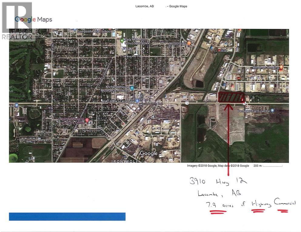 7.9 acres of high visibility, highway commercial frontage in the City of Lacombe with direct access off Hwy 12 and Wolf Creek Drive. In a 2021 letter, the City confirmed a minimum of two access points - one right in/right out entrance/exit off Hwy 12 and a second one off Wolf Creek Drive. A final decision with regards to more access points, left hand turns, etc. would be made after the City has reviewed the results of a (required) traffic impact study. The sight lines are ideal with direct exposure to major traffic routes. Trade activity in this community is growing and the site is surrounded by newer construction including Wendy's, Gary Moe Chrysler Dodge Jeep Ram, Pentagon Farm Centre, Police Station, Metcalf Ridge (residential), and more to come. The City of Lacombe has shown a strong interest in seeing this bustling corner developed. Permitted and discretionary uses for this Highway Commercial District provide the buyer with a wide range of development opportunities. All major services are located nearby. An environmental report was completed in 2011. The small house (new shingles and painted in 2016) and decent sized detached garage is tenant occupied and generates $1150 per month in rental revenue that helps offset the tax and insurance cost until development begins. Seller would consider trades for farmland or recreational property. (id:63190)