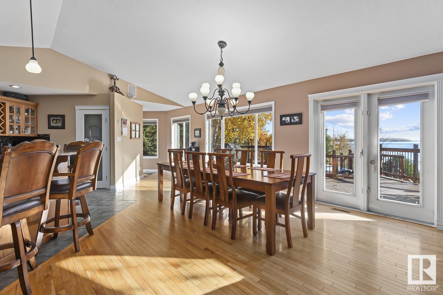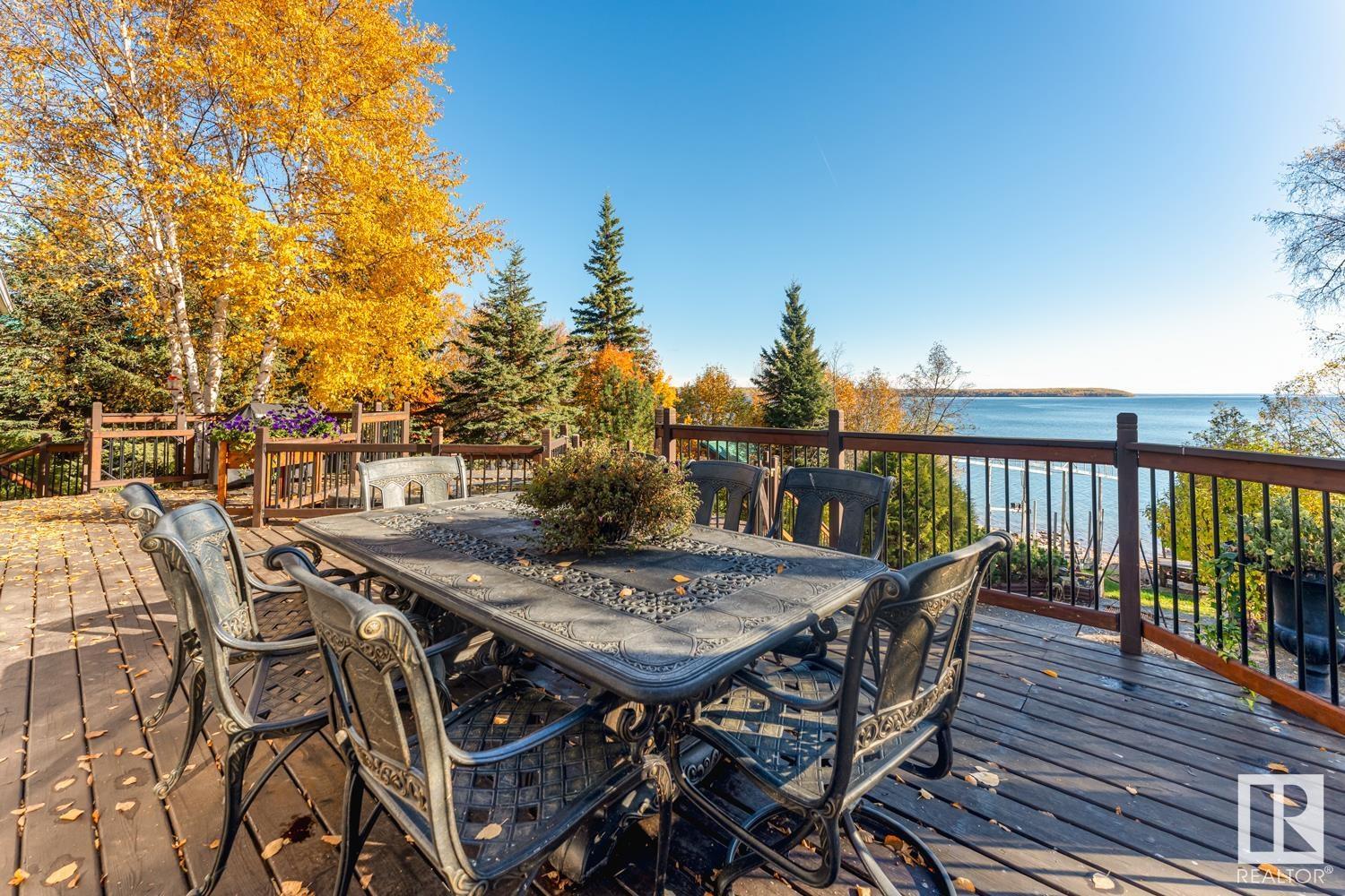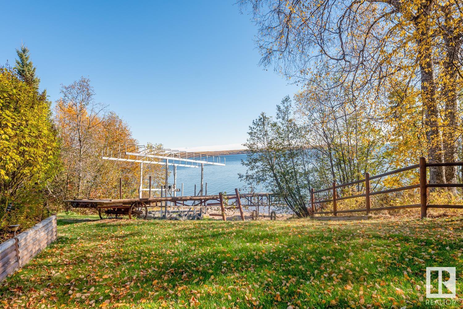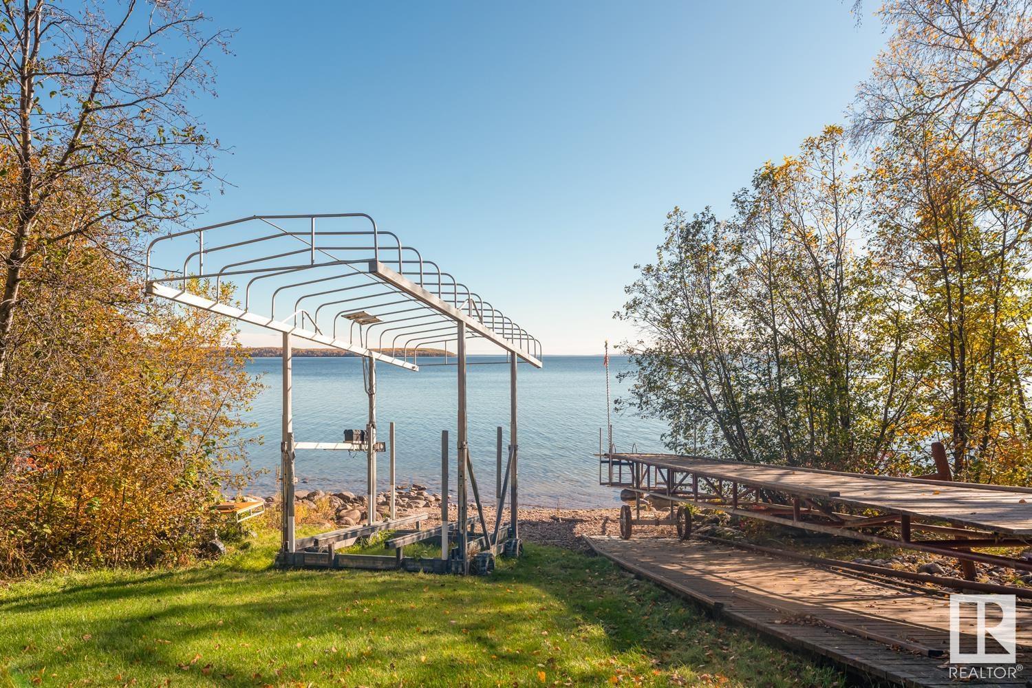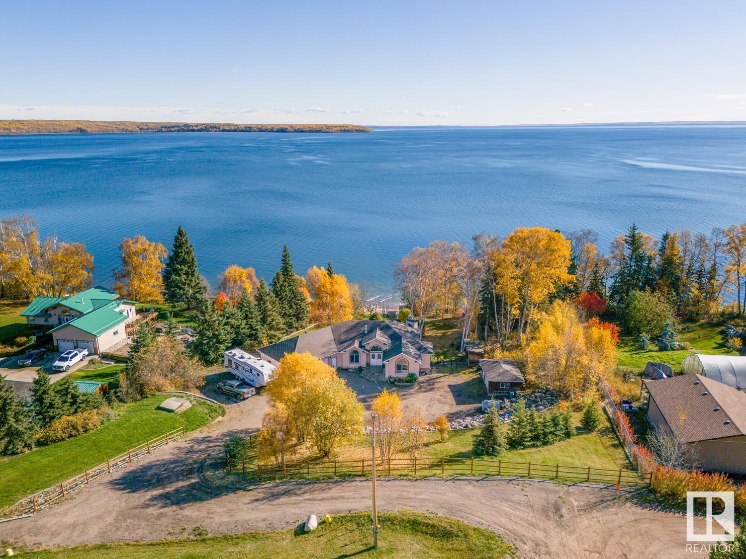 Lakefront Paradise! This incredible property is a rare find, just 100 feet from the water! This bungalow features a convenient walk-out design and offers over 2,250 sqft on each level. The home is adorned with ceramic tile and hardwood flooring, complemented by in-floor. You'll find four spacious bedrooms, including a grand primary suite with an beautiful ensuite. Both the kitchen and dining areas are generously sized. Enjoy stunning lake views through the tall windows spanning the kitchen, dining, and living rooms. Step outside through the double doors to the expansive 28' x 38' deck, or down to the 38' x 50' aggregate concrete pad, which includes a fire pit and cozy sitting area. The heated garage features a workbench, full fridge, and plenty of storage for tools and accessories. Additionally, there's a charming 10' x 12' guest cabin and a separate quad shed with an overhead door. Your dream home awaits you on the shores of Cold Lake - where you will be met with peace, tranquility and privacy (id:63190)