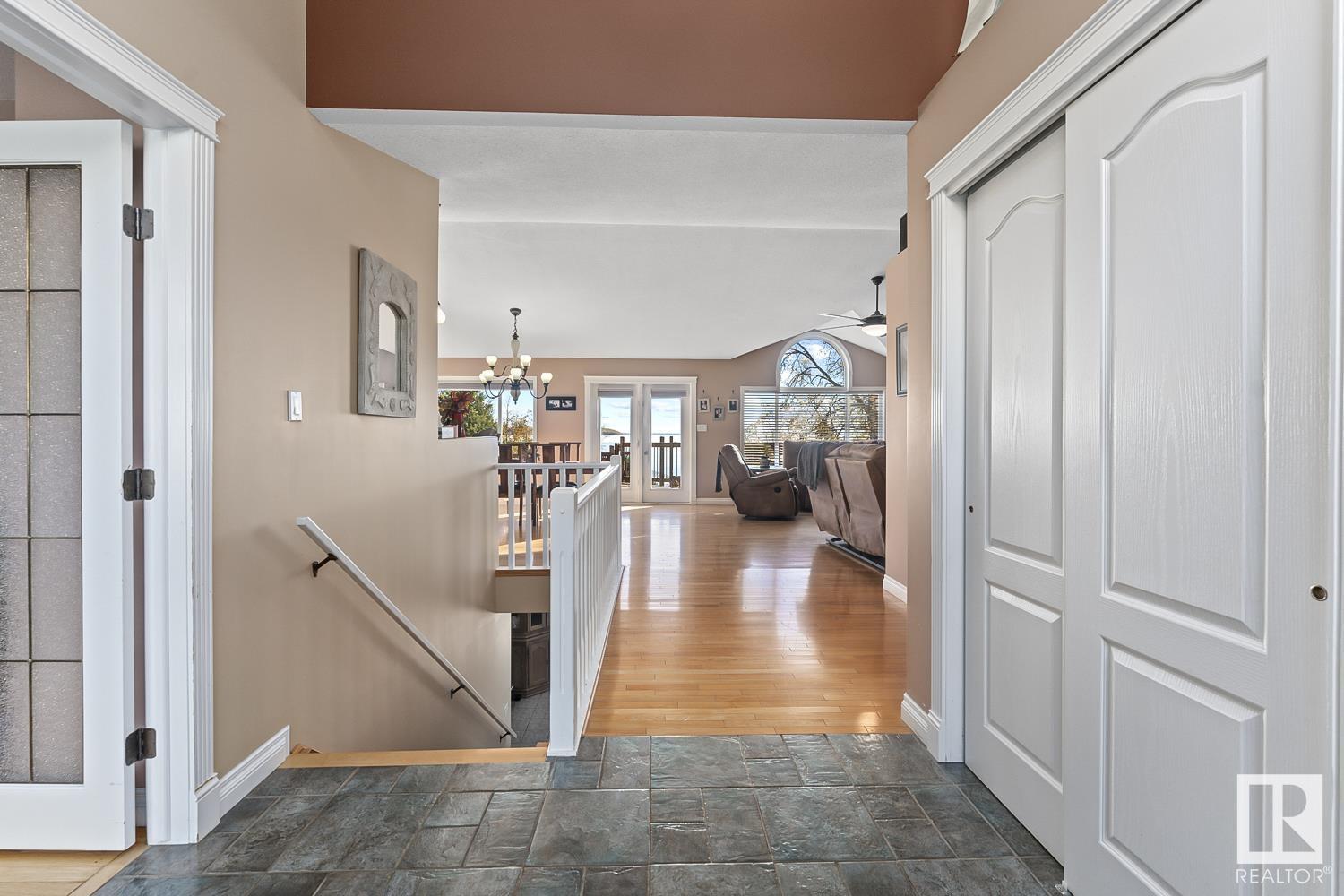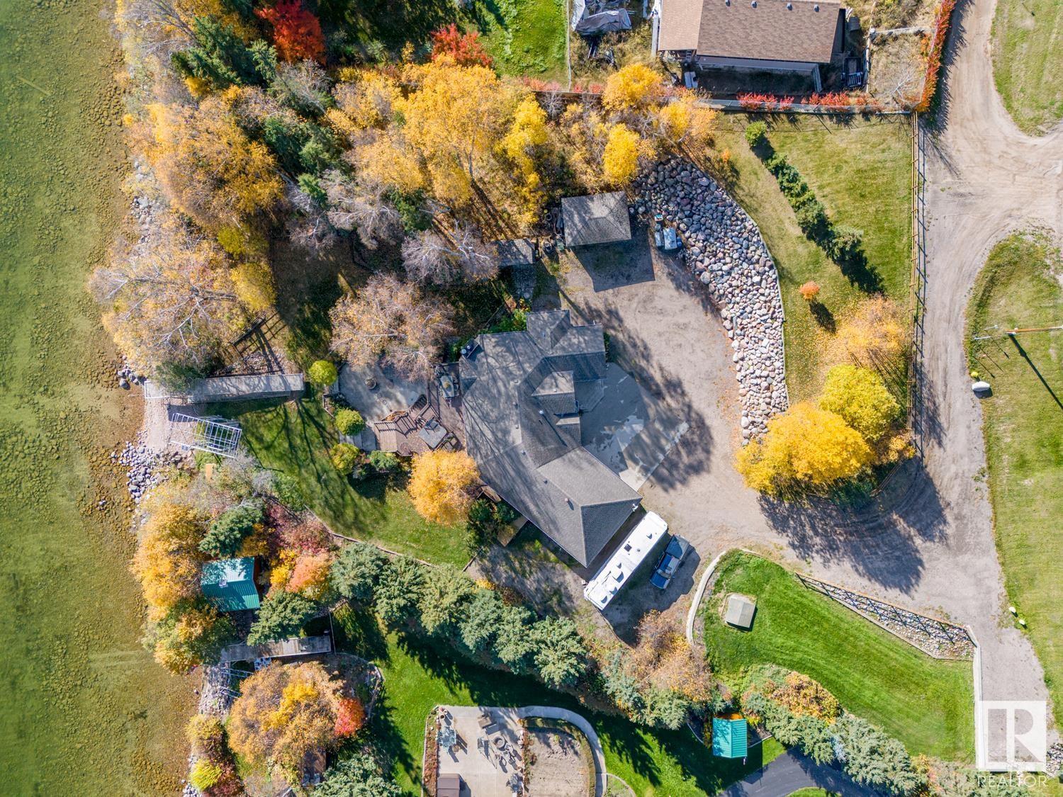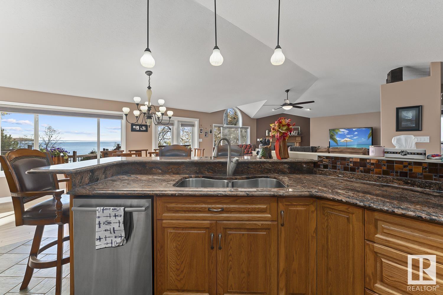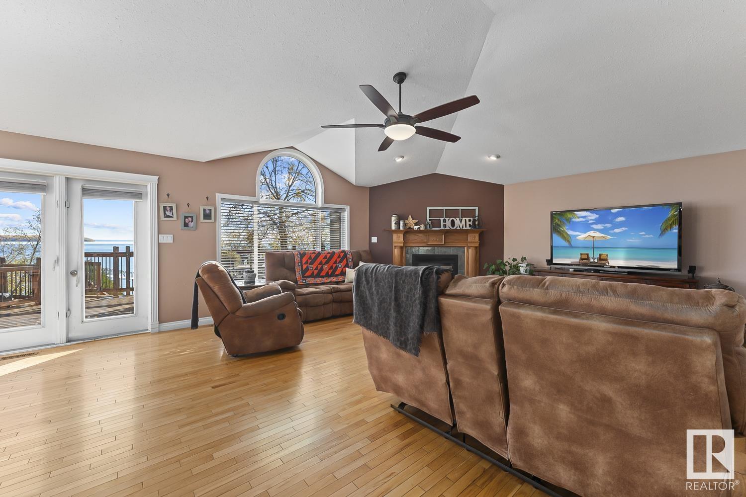 Lakefront Paradise! This incredible property is a rare find, just 100 feet from the water! This bungalow features a convenient walk-out design and offers over 2,250 sqft on each level. The home is adorned with ceramic tile and hardwood flooring, complemented by in-floor. You'll find four spacious bedrooms, including a grand primary suite with an beautiful ensuite. Both the kitchen and dining areas are generously sized. Enjoy stunning lake views through the tall windows spanning the kitchen, dining, and living rooms. Step outside through the double doors to the expansive 28' x 38' deck, or down to the 38' x 50' aggregate concrete pad, which includes a fire pit and cozy sitting area. The heated garage features a workbench, full fridge, and plenty of storage for tools and accessories. Additionally, there's a charming 10' x 12' guest cabin and a separate quad shed with an overhead door. Your dream home awaits you on the shores of Cold Lake - where you will be met with peace, tranquility and privacy (id:63190)