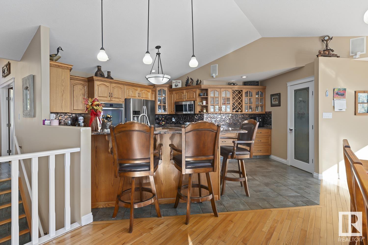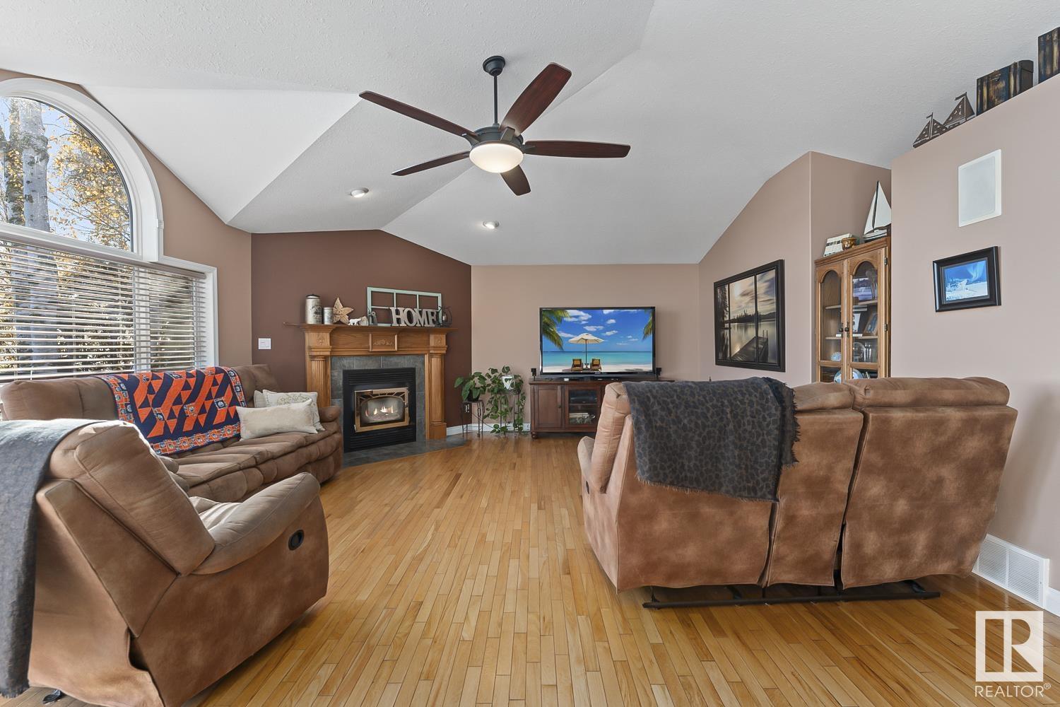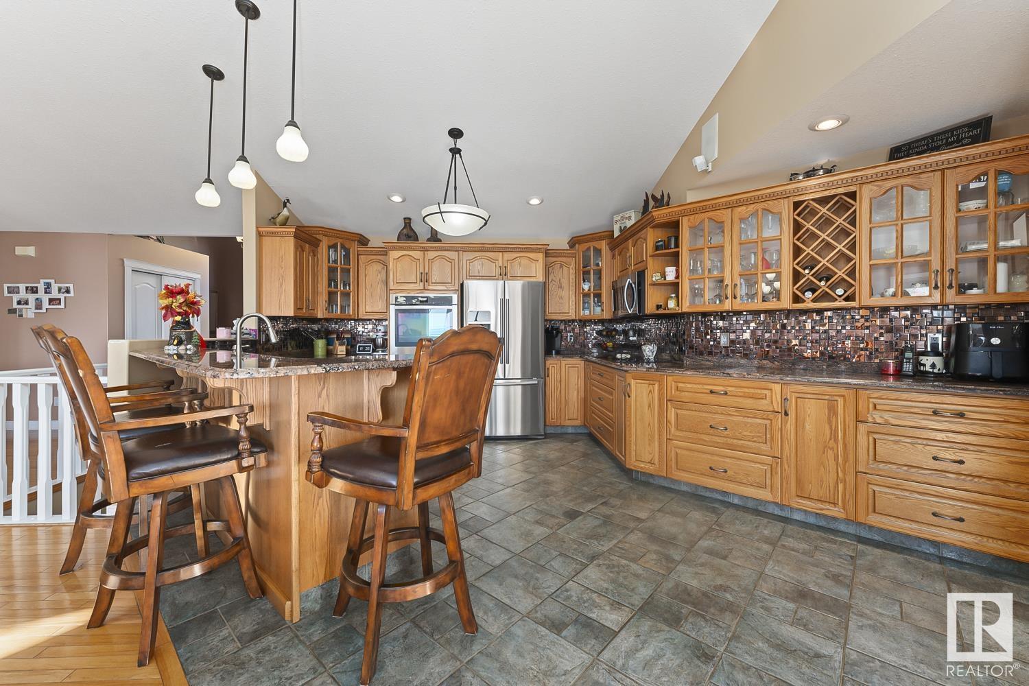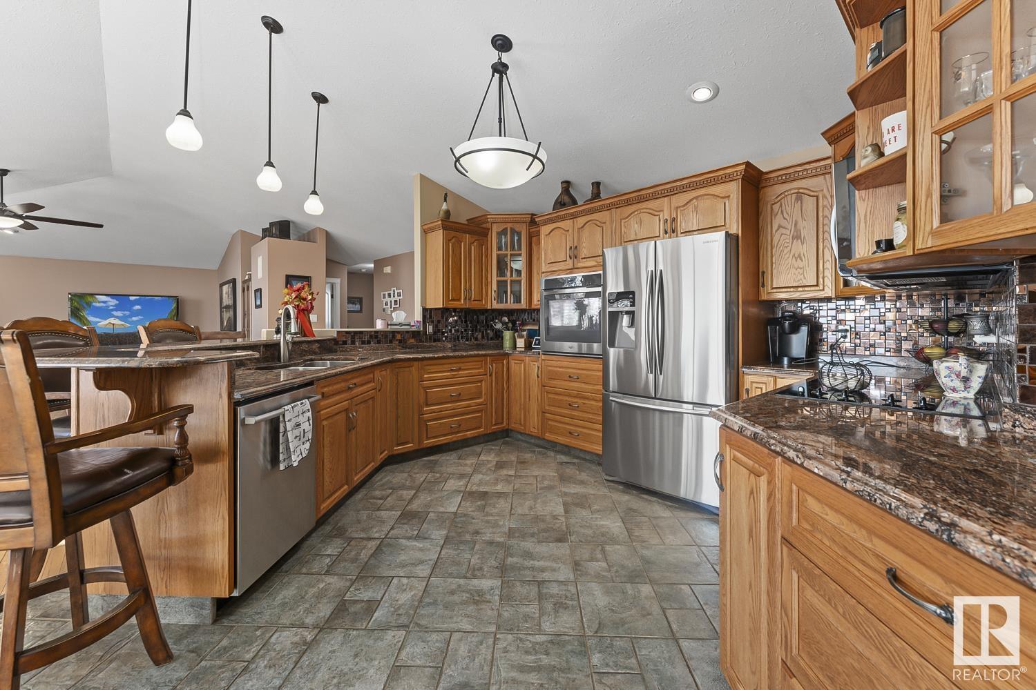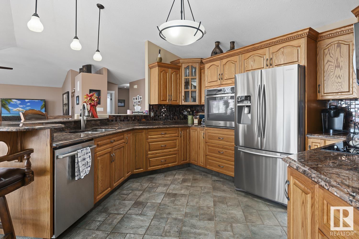Lakefront Paradise! This incredible property is a rare find, just 100 feet from the water! This bungalow features a convenient walk-out design and offers over 2,250 sqft on each level. The home is adorned with ceramic tile and hardwood flooring, complemented by in-floor. You'll find four spacious bedrooms, including a grand primary suite with an beautiful ensuite. Both the kitchen and dining areas are generously sized. Enjoy stunning lake views through the tall windows spanning the kitchen, dining, and living rooms. Step outside through the double doors to the expansive 28' x 38' deck, or down to the 38' x 50' aggregate concrete pad, which includes a fire pit and cozy sitting area. The heated garage features a workbench, full fridge, and plenty of storage for tools and accessories. Additionally, there's a charming 10' x 12' guest cabin and a separate quad shed with an overhead door. Your dream home awaits you on the shores of Cold Lake - where you will be met with peace, tranquility and privacy (id:63190)