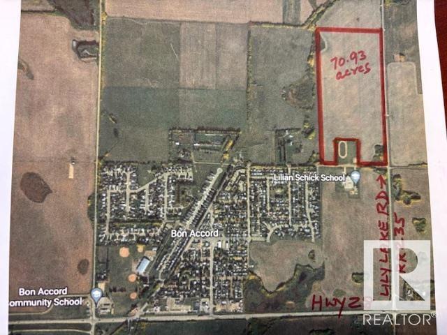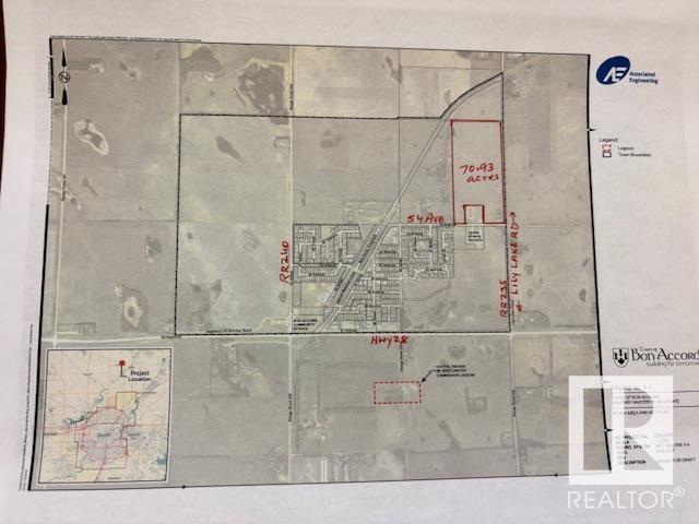 70.93 acres located on NW Corner of LILY LAKE ROAD (RR235) and 54 ave in Town of BON ACCORD. It is well located piece of land, just north of the corner of HWY 28& LILY LAKE RD (RR235). This excellent parcel of land is almost immediately developable into Residential, business and industrial type of developments. Town of BON ACCORD is very co-operative pro-development locality situated right on HWY 28 (about 15 minutes from city of Edmonton's northern boundary). Town of BON ACCORD can be accessed from Edmonton through HWY 28A (via Manning Drive) and through HWY 28 going north via 97 St. NW. (id:63190)