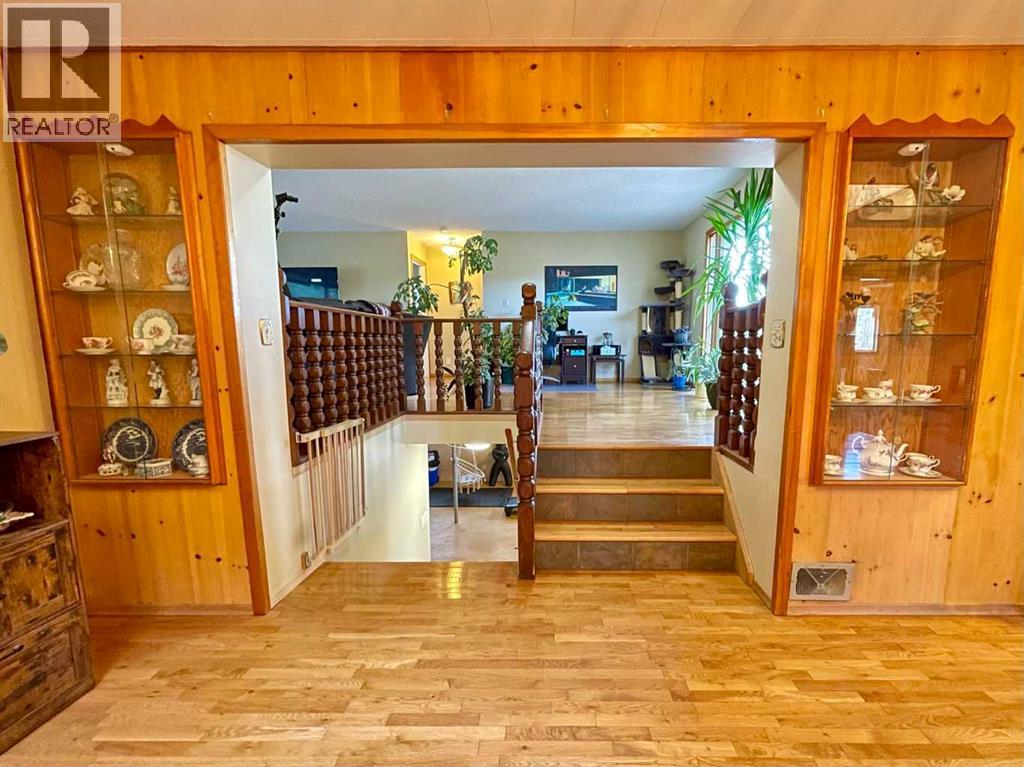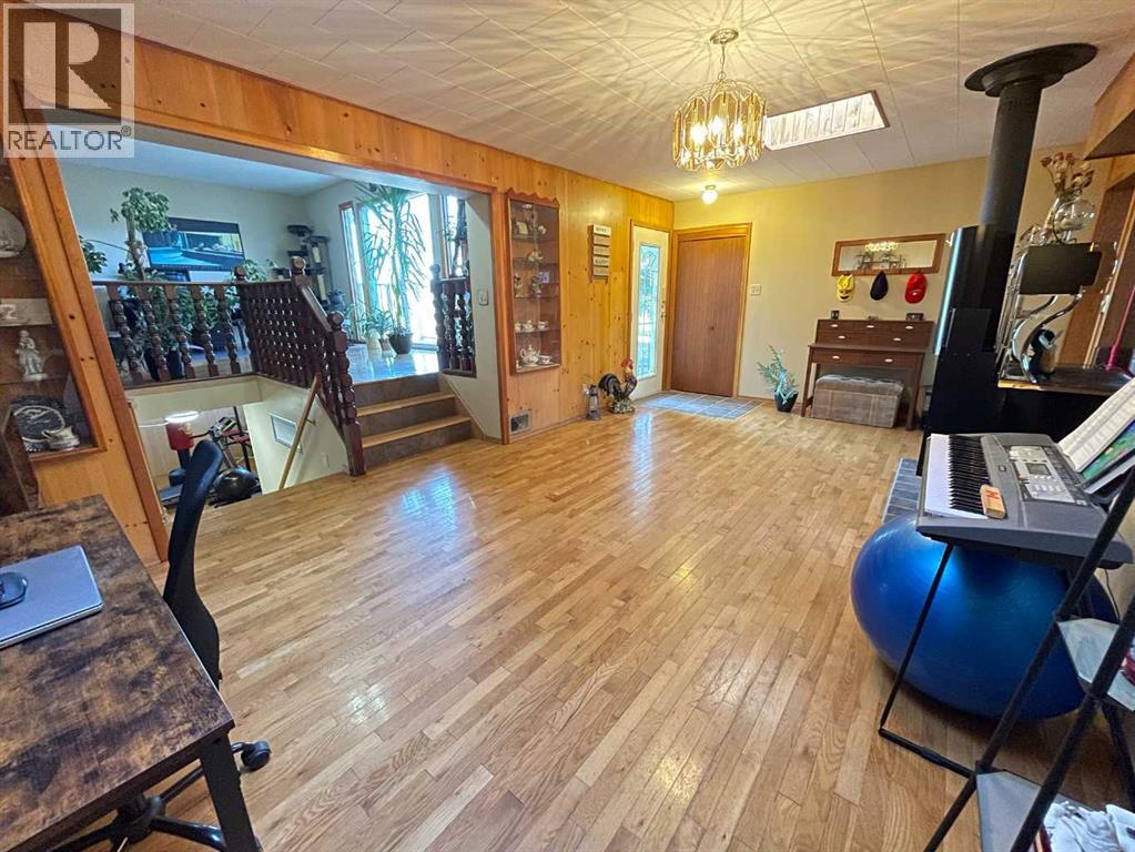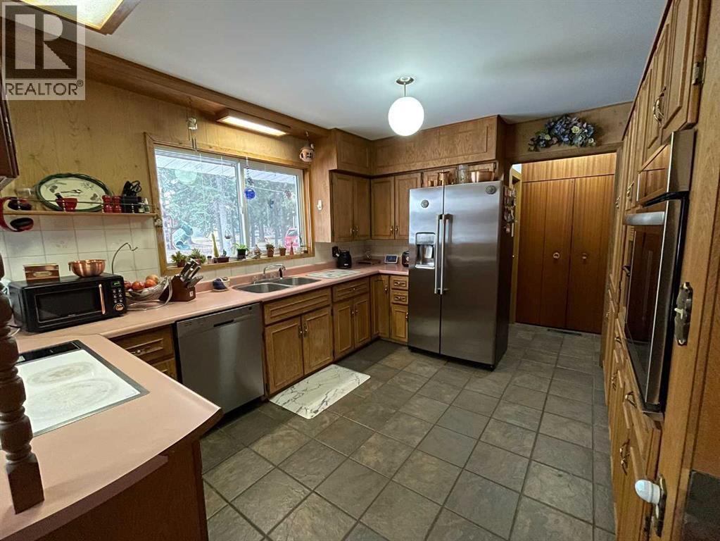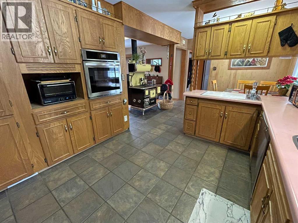 This 5 bedroom, split-level acreage home, with a 36’ x 46’ shop, sits on over 2 acres of fenced land right in town! Many updates have been done over the years including some flooring, windows & paint inside & out. The kitchen has brand-new, stainless-steel appliances & plenty of oak cabinets for storage. A functional wood fired cook stove, sits just off the kitchen & breakfast nook, providing turn of the century, rustic warmth & style. There is multi function space off the kitchen that can be used as a formal dining room or family entertaining. The master bedroom features attractive hardwood flooring & a convenient 2 pc ensuite. 2 additional bedrooms, a 4 piece bathroom & laundry with new washer & dryer complete the main level. The upper level offers a spacious living room that provides lots of natural light & access to the outside deck & patio area. 2 more bedrooms on the upper floor add extra space for the growing family. The lower level is partially finished with a large open area, utility room with high efficiency furnace & plenty of storage. Loads of parking for general vehicles & RV, an attached carport at the side of the house & a playground area for the kids are added bonuses for the family. The heated, insulated shop, with 12’ x 10’ garage door, has 220 wiring with 2 sub-panels, mezzanine, storage shelves & a 2pc bathroom. The property has option to be further sub-divided, subject to town review & approval. Situated within walking distance to all shopping, walking trails & Mary Reimer Park. (id:63190)