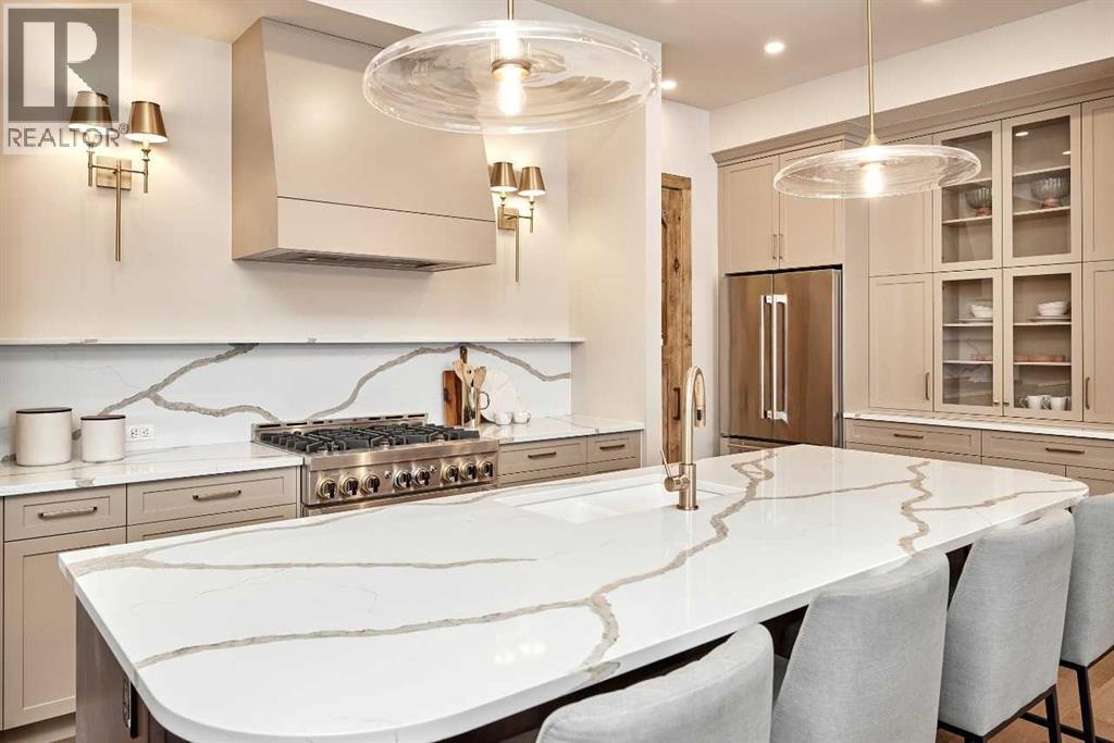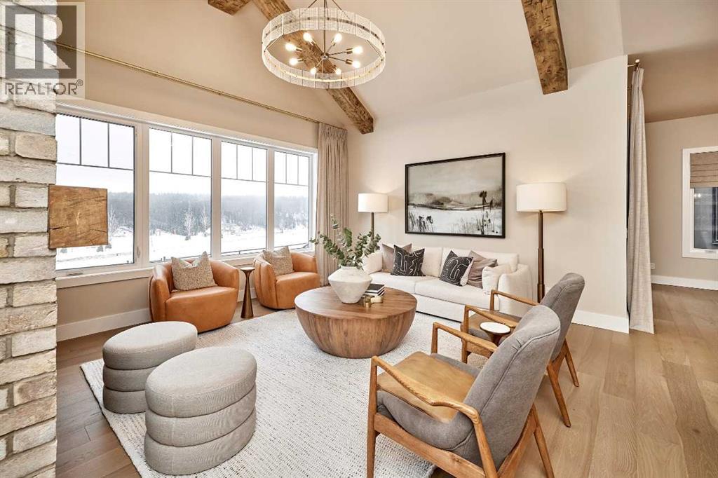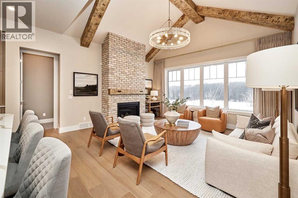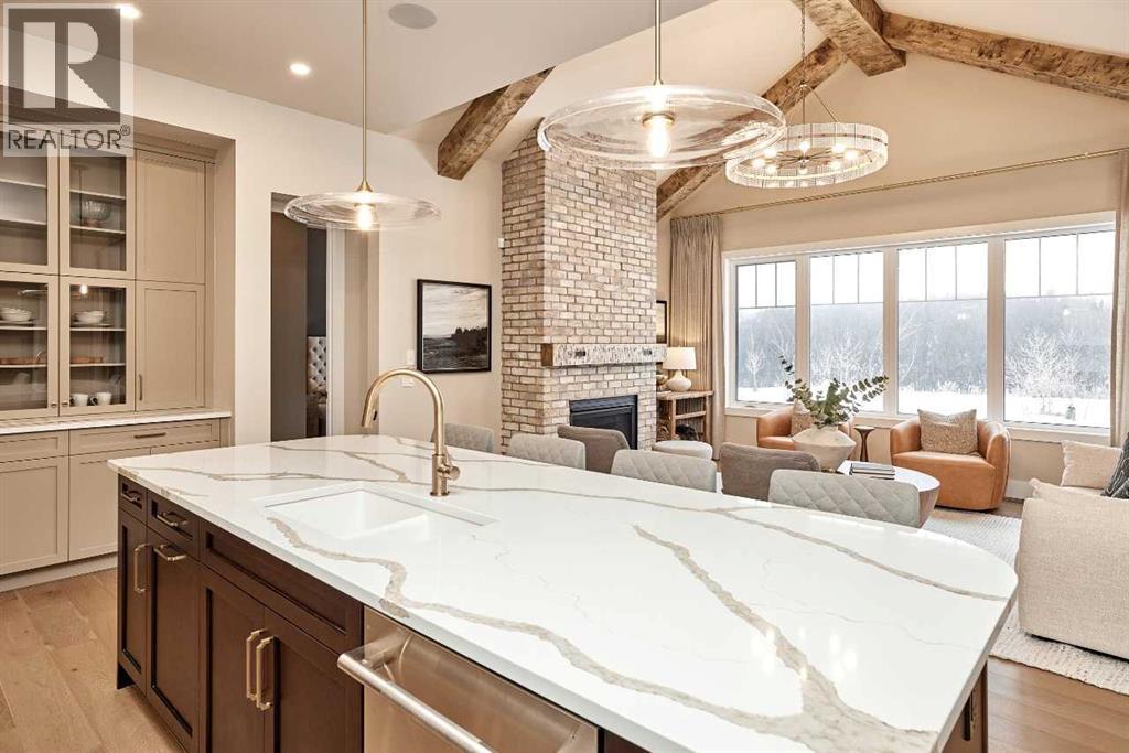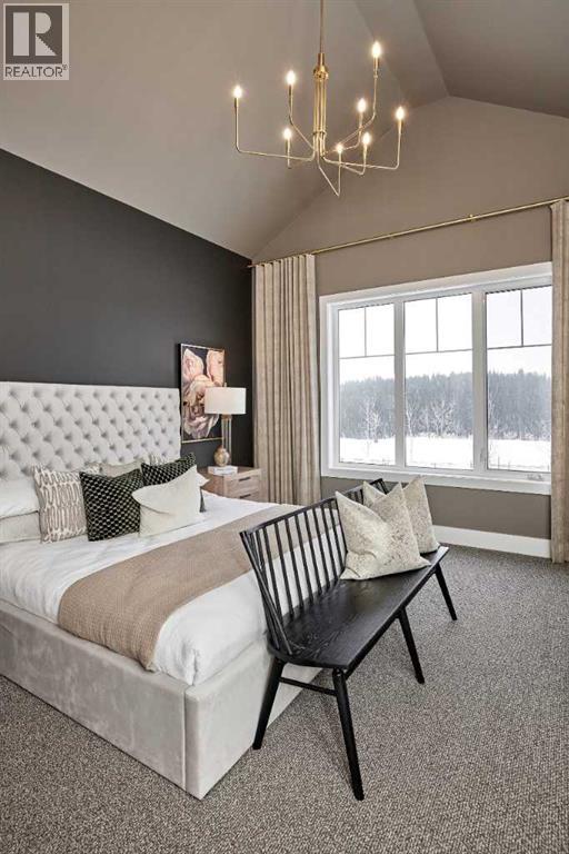 Welcome to the Dorchester by Crystal Creek Homes. This stunning home combines luxurious features with thoughtful design, starting with a CHEF'S KITCHEN that boasts high-end appliances, custom cabinetry, and a spacious layout perfect for culinary creativity. The open-concept great room showcases impressive open beam VAULTED CEILINGS, creating a grand and airy atmosphere ideal for both relaxing and entertaining. A second story LOFT space offers the flexibility of a second bedroom and bathroom, providing added privacy and convenience. The finished basement is an entertainer’s dream, complete with a stylish BASEMENT BAR featuring quartz countertops and custom cabinets, along with a home gym for ultimate comfort and functionality. Step outside on your back deck, offering a seamless transition between indoor and outdoor living to absolutely stunning views of the BOW RIVER RAVINE. With every detail meticulously crafted, this home offers the perfect blend of elegance and practicality. Photos are representative. (id:63190)