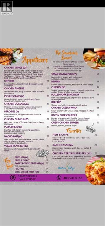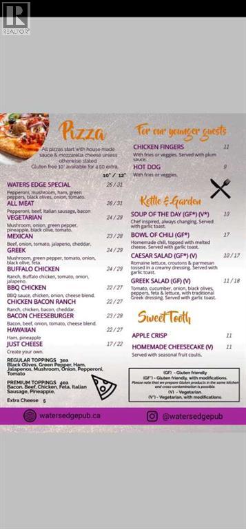 A restaurant and pub opportunity in the Hamlet of Priddis. Priddis is a local tourist destination and minutes away from the expanding southern boundary of Calgary. The owners have just reduced their price to considerably less than replacement cost. The mall the Pub is located in is also for sale so possibly an excellent opportunity for an entrepreneur. For the past 5 years the current owners made this establishment the "go-to" location for great food, entertainment and private catered events. Patrons can enjoy morning breakfast and coffee and a slice of fresh baked loaf to go, lunch midday, or stop for a meal and beverage at the end of a full day of adventure in the great outdoors (Bragg Creek Recreation Area is only 20 minutes to the West). There are also nights of music bingo, live music, paint and sip along with daily menu specials. The business has grown! The restaurant and pub are currently open 5 days a week so there are 2 more days of opportunity that await your creativity. The pizza is one item always in demand and the pizza room is conveniently located on the pub side. The equipment is well maintained. There is potential to run VLTs. In the warmer months there is room on the front veranda for more patrons. The owners also do catering, host private functions and are involved in 2 hot lunch programs at neighboring schools. The Priddis Community Association also hosts many events with patrons hitting Waters Edge before and/or after the functions. With the growth of Calgary and the surrounding areas, there has been an increase in patrons. Growth is evident as you drive into Priddis and Calgary is only minutes away! (id:63190)
