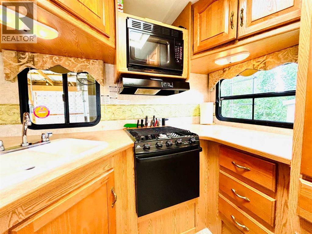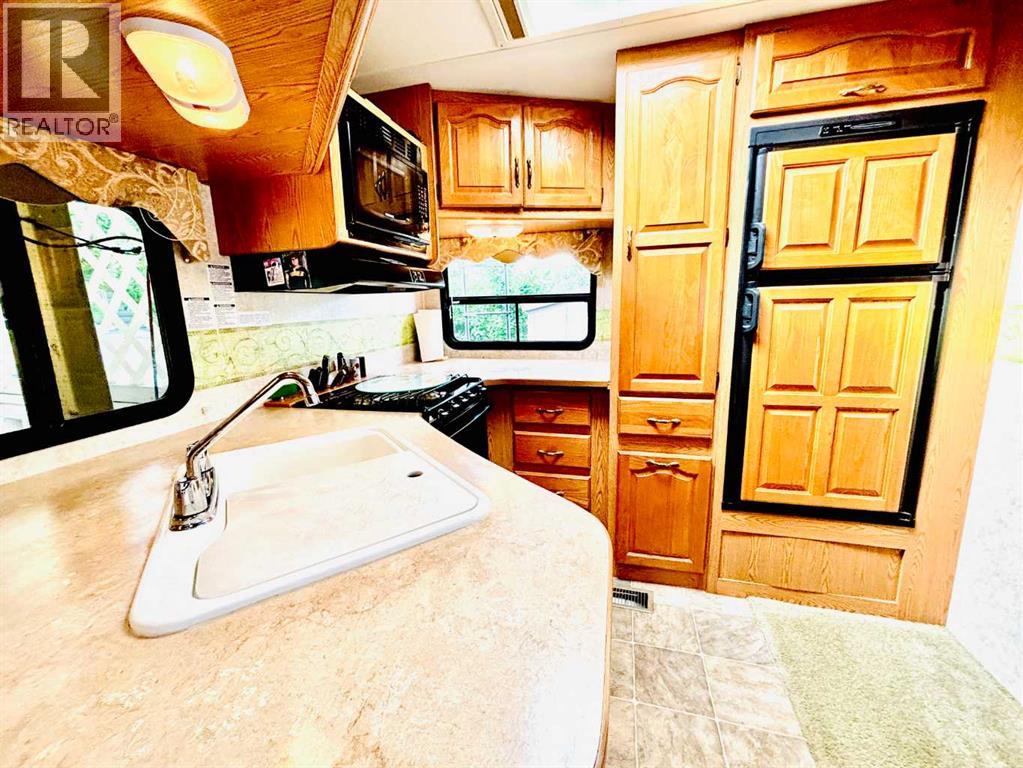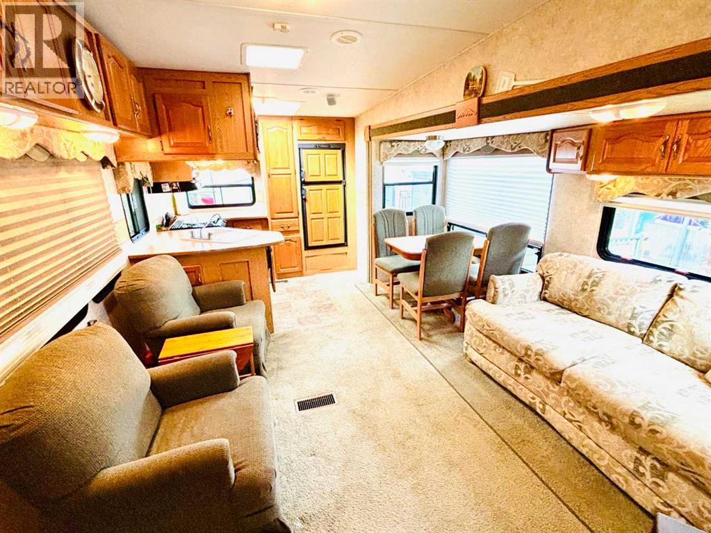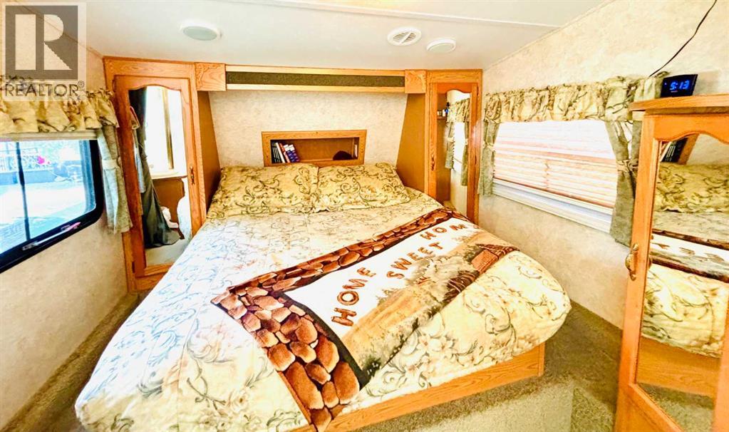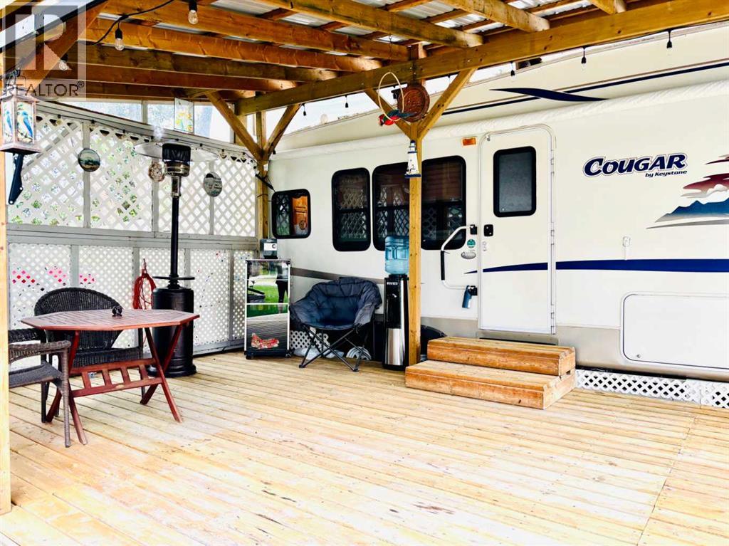 An affordable retreat - all summer long!! Perfect for the solo escape or the outdoorsy couple who want to relax at the lake. Just pack your bag and send your troubles away. In a friendly gated community, only steps to the beach, social events and walking trails; relaxing serenity awaits your arrival. This well designed lot features an upgraded shed with fridge and storage, large deck with tin roof and weather coverings, a private fire pit area, low maintenance landscaping and backs onto a field for optimum privacy. Aspen and Lilacs complete your outdoor oasis. The original owners of the 2006 Cougar Series 5th Wheel have this lakeside beauty meticulously cleaned, maintained and move in ready! The slide allows for the roomy feel while the corner kitchen allows ample sunlight and views while prepping those delicious summer meals! Notice the wood cabinetry showcasing the build quality throughout. Air conditioning enhances this luxurious camping style and the living room even features a pull out couch for extra guests! Your summer retreat awaits you! (id:63190)