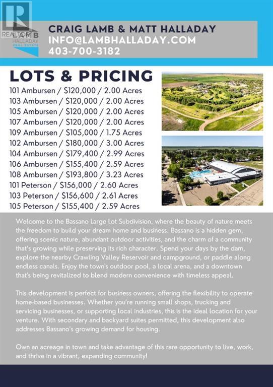 Welcome to the Bassano Large Lot Subdivision, where the beauty of nature meets the freedom to build your dream home and business. Bassano is a hidden gem, offering scenic nature, abundant outdoor activities, and the charm of a community that’s growing while preserving its rich character. Spend your days by the dam, explore the nearby Crawling Valley Reservoir and campground, or paddle along endless canals. Enjoy the town's outdoor pool, a local arena, and a downtown that's being revitalized to blend modern convenience with timeless appeal. This development features a total of 12 lots for sale, ranging from 1.7 acres to 3.22 acres, with water, gas, and power run to the lot line—making these lots ready to go for your dream build. Priced at just $60,000 per acre, this is an unbeatable value for such spacious and well-equipped property. As an added incentive, enjoy a 3-year tax rebate to make your investment even more rewarding! Perfect for business owners, this subdivision offers the flexibility to operate home-based businesses. Whether you’re running small shops, trucking and servicing businesses, or supporting local industries, this is the ideal location for your venture. With secondary and backyard suites permitted, this development also addresses Bassano’s growing demand for housing. Families will love the convenience of a K-12 school right in town, making it easy to settle in and enjoy all that Bassano has to offer. Own an acreage in town and take advantage of this rare opportunity to live, work, and thrive in a vibrant, expanding community! (id:63190)