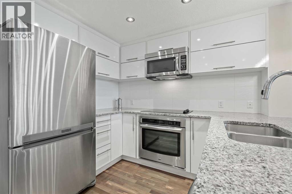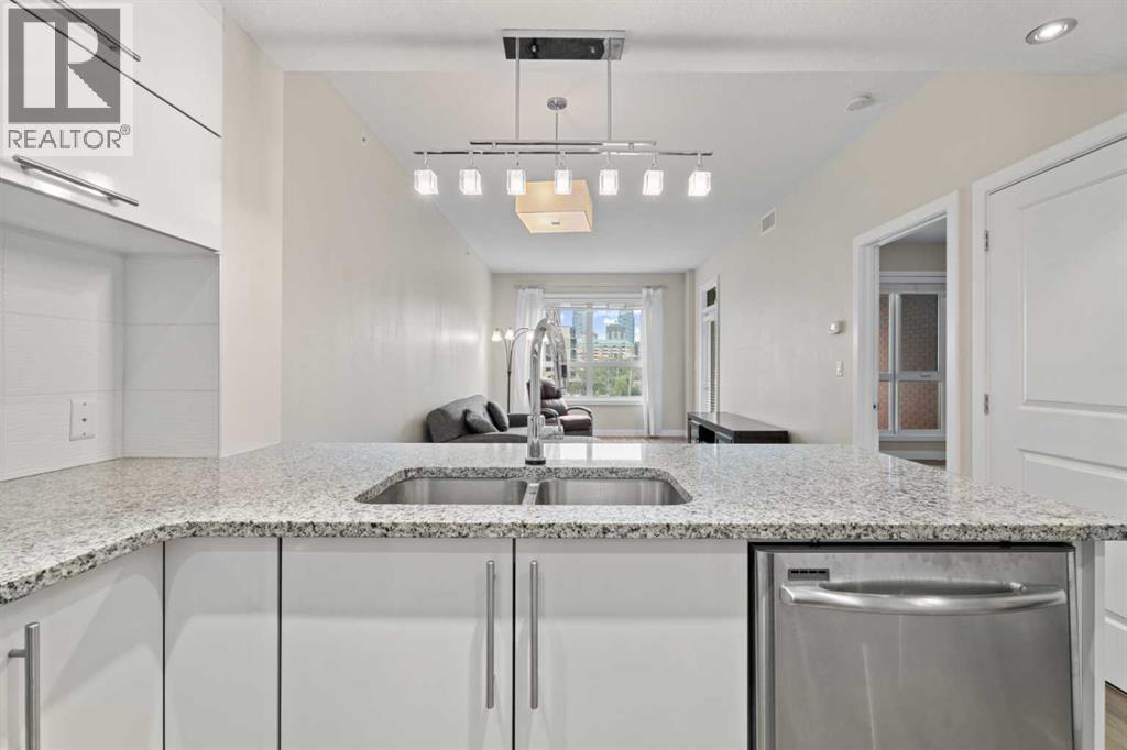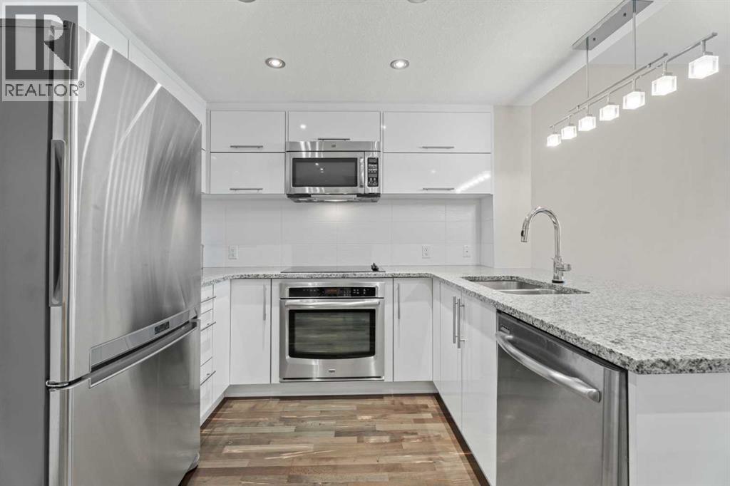 Welcome to your new home in the heart of Calgary’s vibrant Kensington community. Whether you’re after a walkable lifestyle, quick access to downtown, or the nearby LRT, St. John's on 10th Street puts everything you need just steps away—including parks, pathways, shops, and cafes. This spacious 1-bedroom condo offers high ceilings, air conditioning, in-suite laundry, and a south-facing balcony. The kitchen is outfitted with sleek white cabinetry, stainless steel appliances, granite countertops, and convenient bar seating. The open-concept living and dining area accommodates full-sized furniture and features easy-to-maintain laminate flooring. The bedroom fits a king-sized bed and includes a large window for natural light. A walk-through closet leads to a well-appointed 4-piece bathroom. For added convenience, the storage locker is located just across the hallway. St. John's on 10th is a secure, well-maintained building with bike storage and secure visitor parking. Reserved underground parking is available through ParkPlus for $210/month. You are just minutes from the Bow River Pathway, Riley Park, grocery stores, and some of Calgary’s best local restaurants and boutiques. With the Sunnyside LRT station just a 2-minute walk away, commuting to SAIT, the University of Calgary, or downtown is quick and easy. This well-designed condo is the ideal home base for enjoying all that Calgary’s urban core has to offer. Book your showing today. (id:63190)