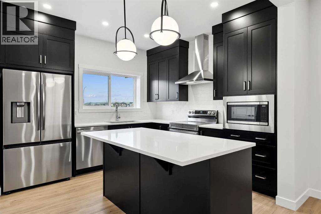 Welcome to the Luna model in Cochrane’s Fireside community, offering 1,528 sq. ft. with 3 bedrooms and 2.5 bathrooms. The main floor is designed with an open layout that connects the great room, dining area, and kitchen. In the kitchen you’ll find quartz countertops, Chantilly Lace shaker cabinetry, a Blanco Silgranit sink in Truffle, Boardwalk matte white backsplash, and a Mistral island that provides both workspace and seating.Upstairs, the primary bedroom includes a walk-in closet and ensuite. Two additional bedrooms, a full bathroom, and upper-level laundry complete this floor. Interior finishes include maple-stained railing with nickel spindles, Cozy White luxury vinyl plank, Off Shore carpet, and Micabella LVT. This home includes a side entry with basement rough-ins, a 9’ foundation, and gas lines to the range and BBQ. A gravel parking pad is also included.Fireside is a well-established Cochrane community with two schools, nearby shops and services, playgrounds, and an extensive pathway system. It also offers quick access to Highway 22 for commuting into Calgary or exploring the mountains. Photos are representative, colours and finishes may vary. *Area size was calculated by applying the RMS to the blueprints provided by the builder. (id:63190)