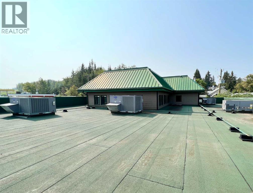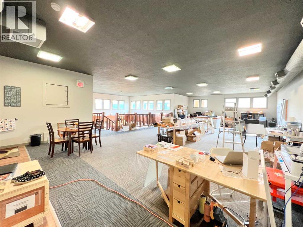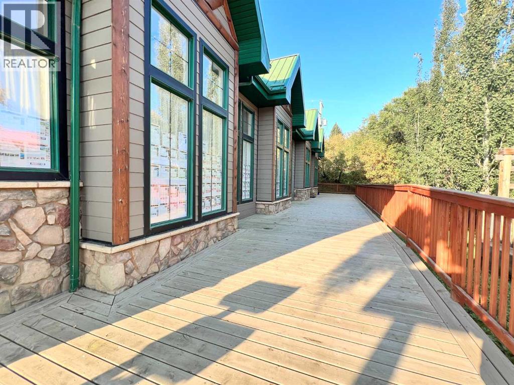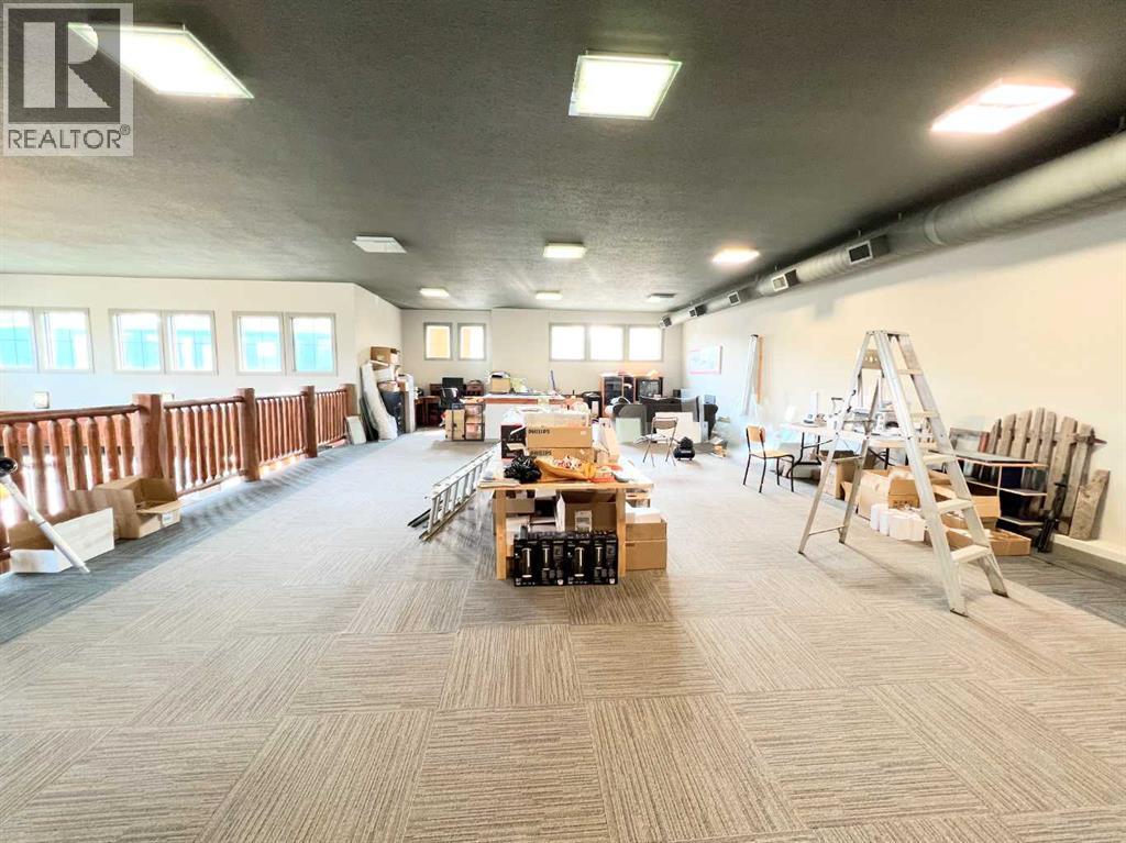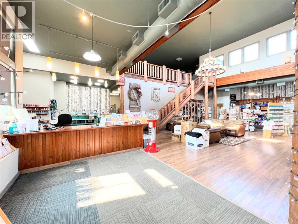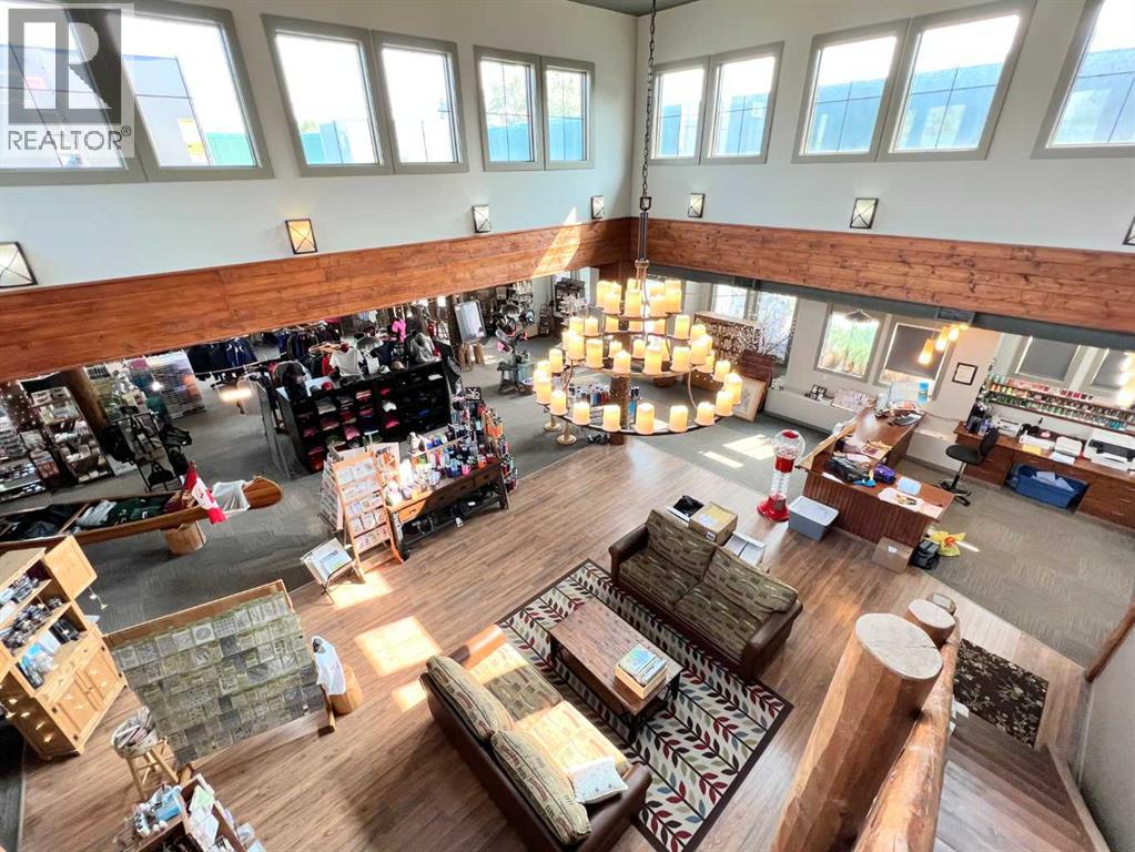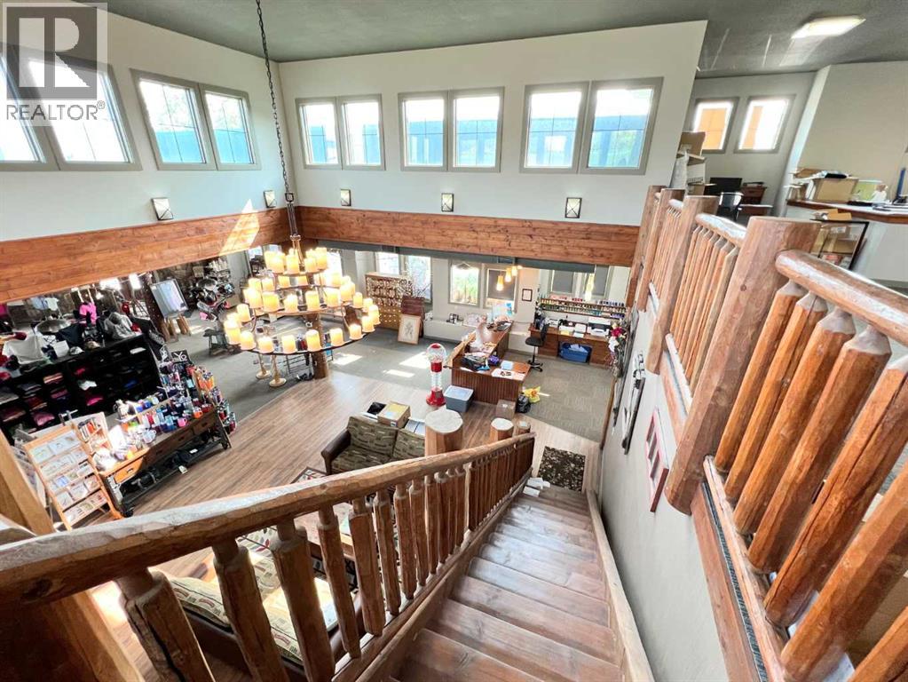 One of Athabasca's signature retail/office buildings on two corner lots with Highway 2 frontage. Offering an elevated customer experience, no expense was spared on the details of this development. 12 ft high ceilings throughout, plus additional vault in Unit A to the open second level. Unit A is just over 4700 sq ft on the main level with a 1400 sq ft mezzanine. Additional enclosed room with enhanced ventilation, currently used as a printing room. Mezzanine with kitchen is wide open to the main level, showcasing the custom built solid log staircase and railing. Both Units B and C are just under 1000 sq ft, fully open and customizable spaces, with self contained kitchen and bathroom. Prime location on main street, spacious side boardwalk. Low maintenance building has a metal roof and hardy board siding, with river rock trim. In-floor heat throughout. (id:63190)
