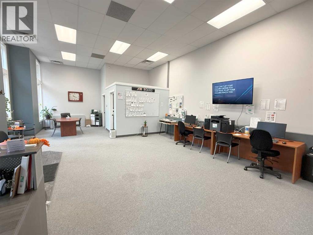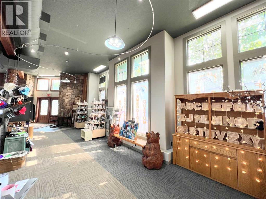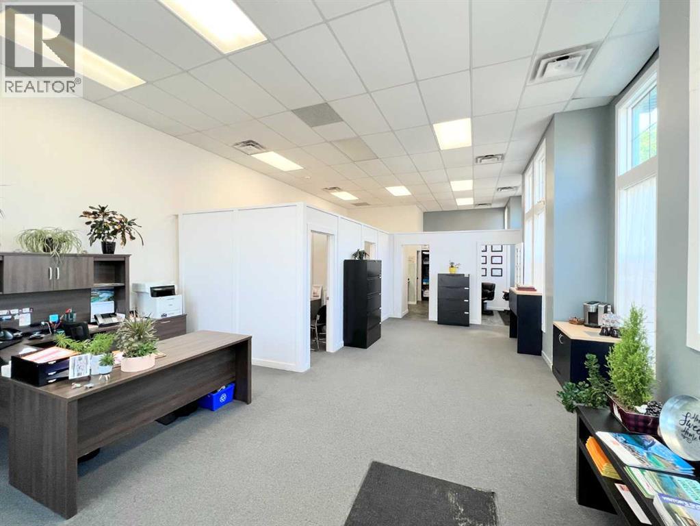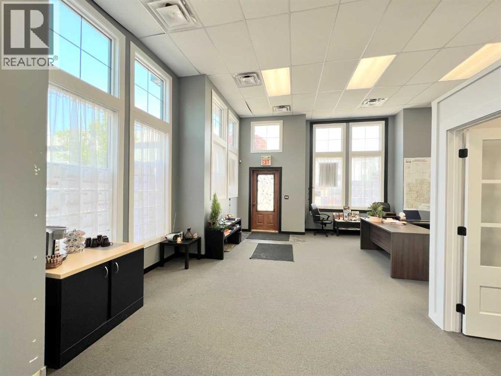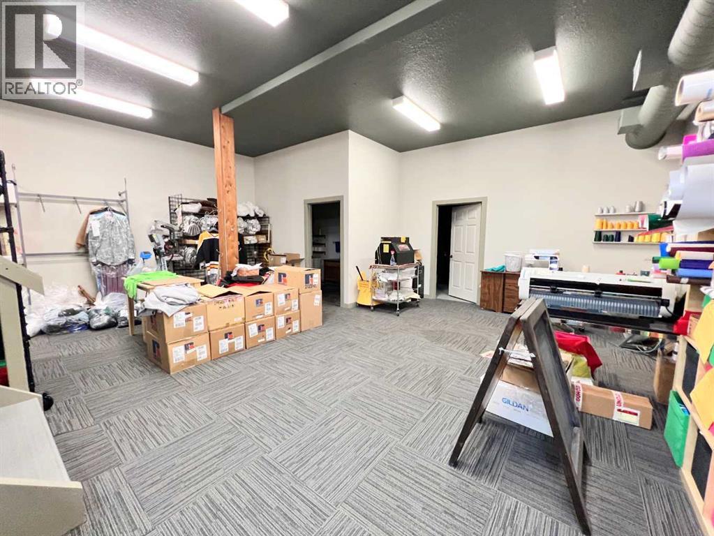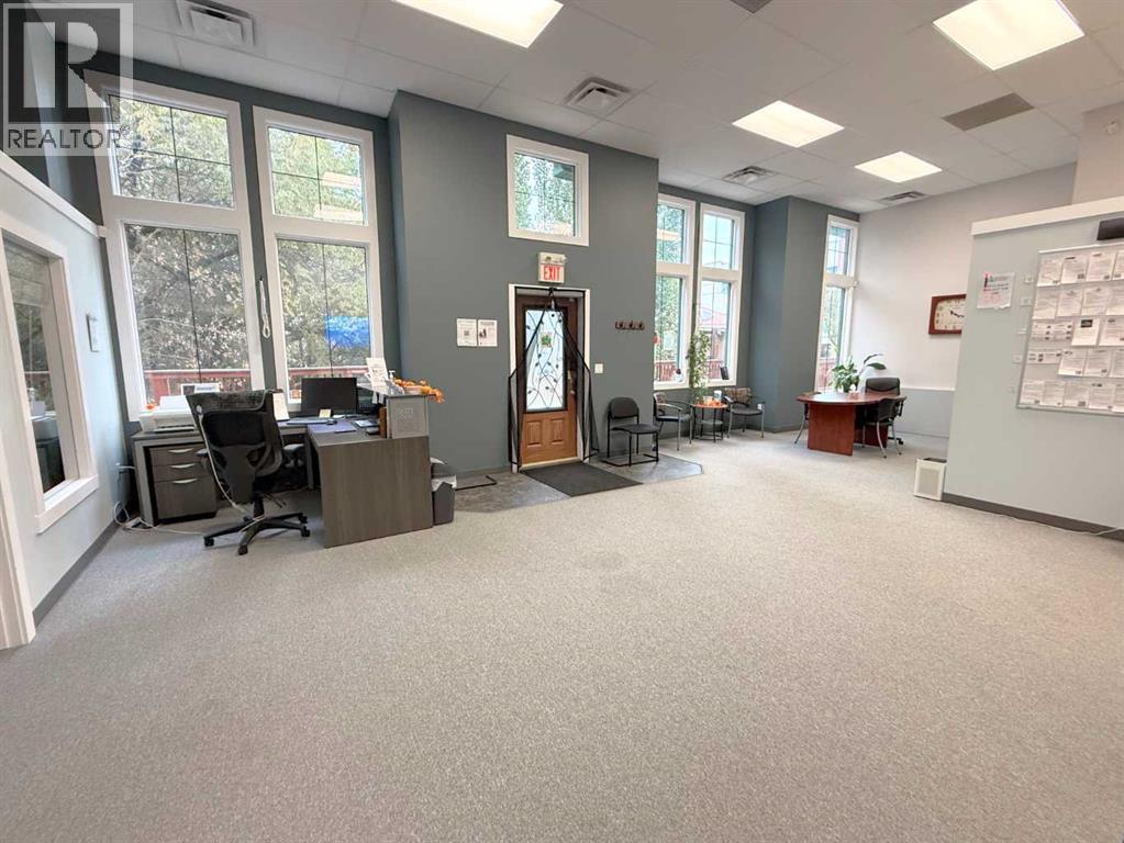 One of Athabasca's signature retail/office buildings on two corner lots with Highway 2 frontage. Offering an elevated customer experience, no expense was spared on the details of this development. 12 ft high ceilings throughout, plus additional vault in Unit A to the open second level. Unit A is just over 4700 sq ft on the main level with a 1400 sq ft mezzanine. Additional enclosed room with enhanced ventilation, currently used as a printing room. Mezzanine with kitchen is wide open to the main level, showcasing the custom built solid log staircase and railing. Both Units B and C are just under 1000 sq ft, fully open and customizable spaces, with self contained kitchen and bathroom. Prime location on main street, spacious side boardwalk. Low maintenance building has a metal roof and hardy board siding, with river rock trim. In-floor heat throughout. (id:63190)