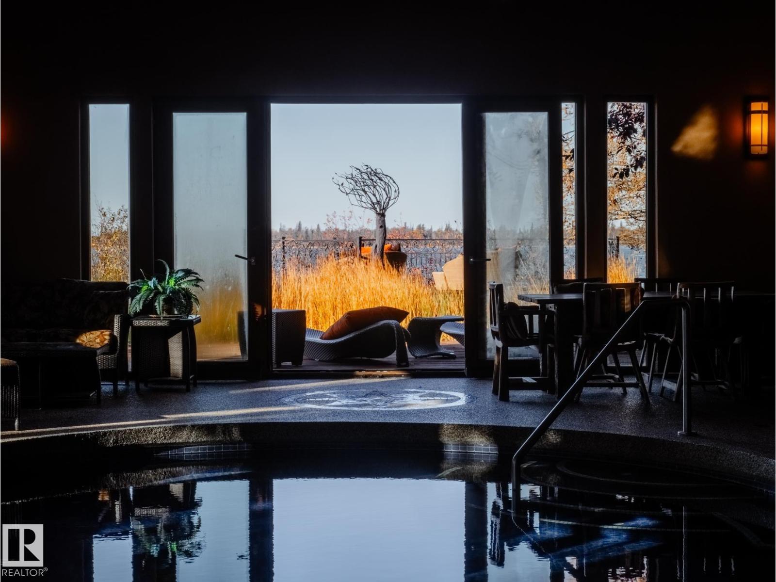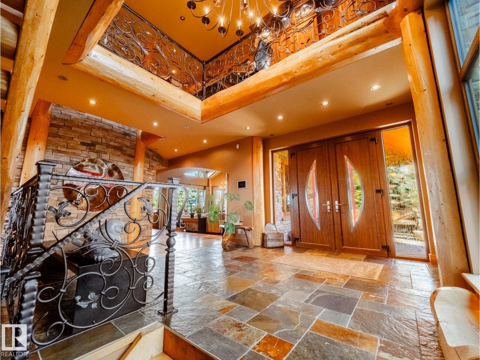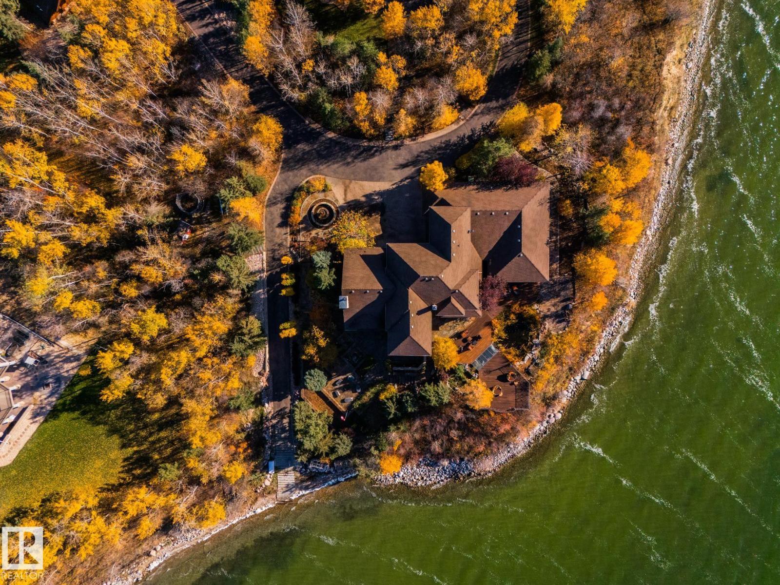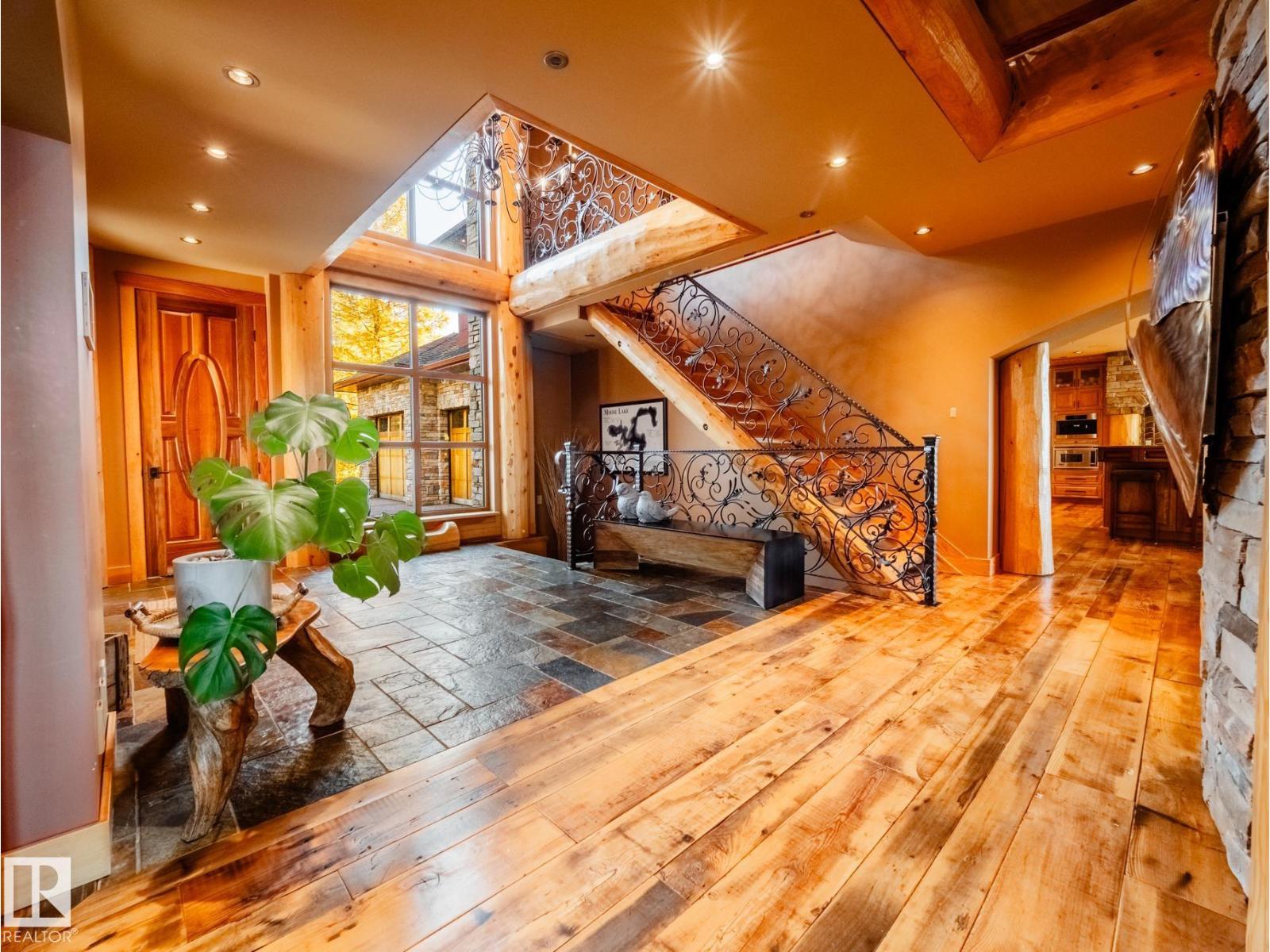 Private Moose Lake waterfront paradise w/ property extending to the water’s edge! Executive 5.64-acre estate blends luxury w/ natural beauty. Features professionally designed grounds, private boat launch, paved drive, grand front fountain & resort-style amenities. 6877 sq.ft. home impresses w/ old canary wood floors & timber framing. Great room offers a stone fireplace, wet bar & west facing sun room. Chef’s kitchen w/ Viking gas stove, espresso bar, wood- burning oven & butler’s pantry. Live edge staircase & custom iron railings leads up to a loft office. 4 Bdrms + 6 baths including a primary w/ spa ensuite, private balcony & walk through closet room to laundry. Walkout basement w/ theatre room, gym, sitting area & extra laundry. Indoor pool/hot tub room rivals any resort w/ heated floors & smart climate control. Triple heated garage, log shop w/ 14' overhead doors & potential for suite, extra 28' X 40' shop, RV hookups & smart home automation. A Rare, Fully Loaded Retreat Built For Elevated Living (id:63190)