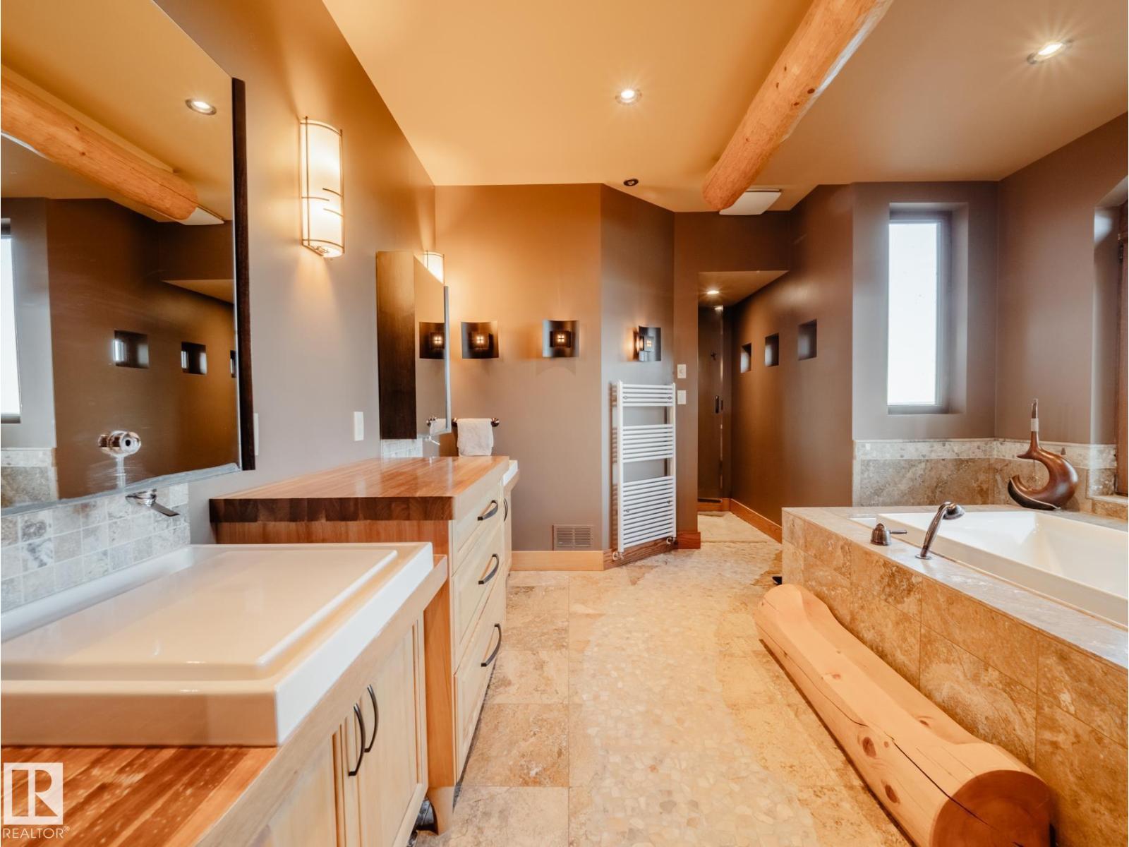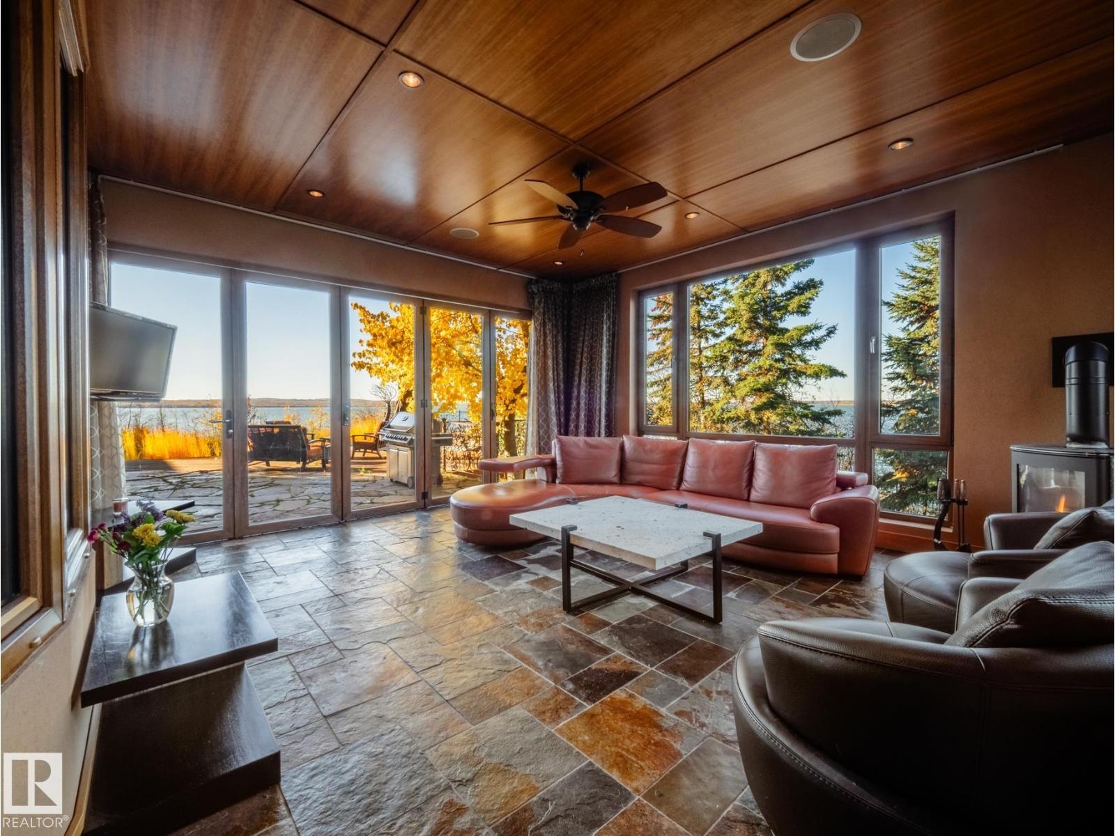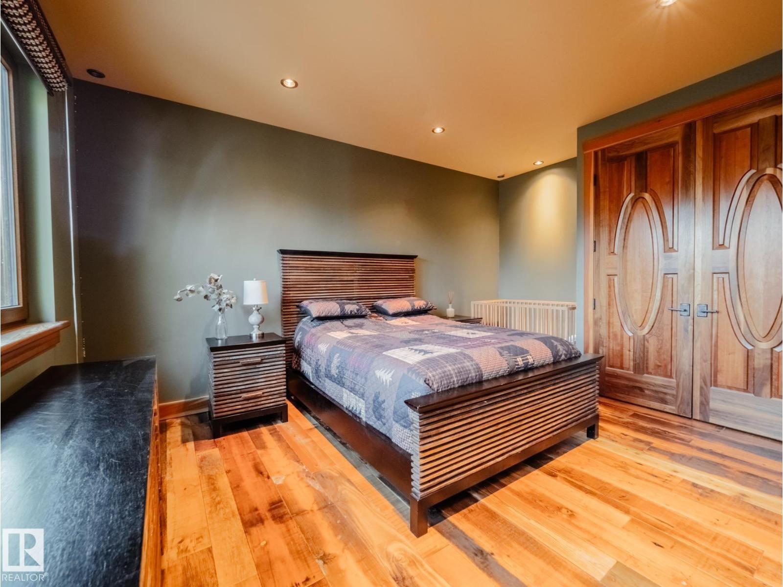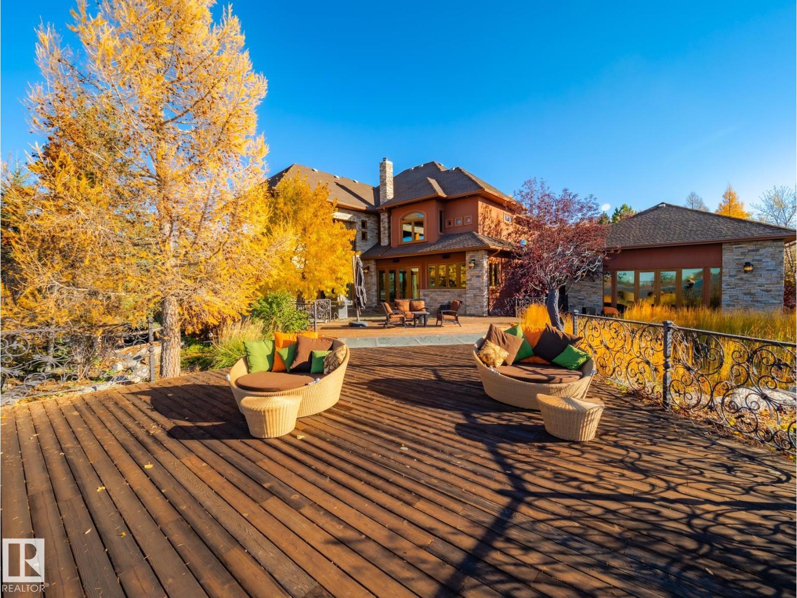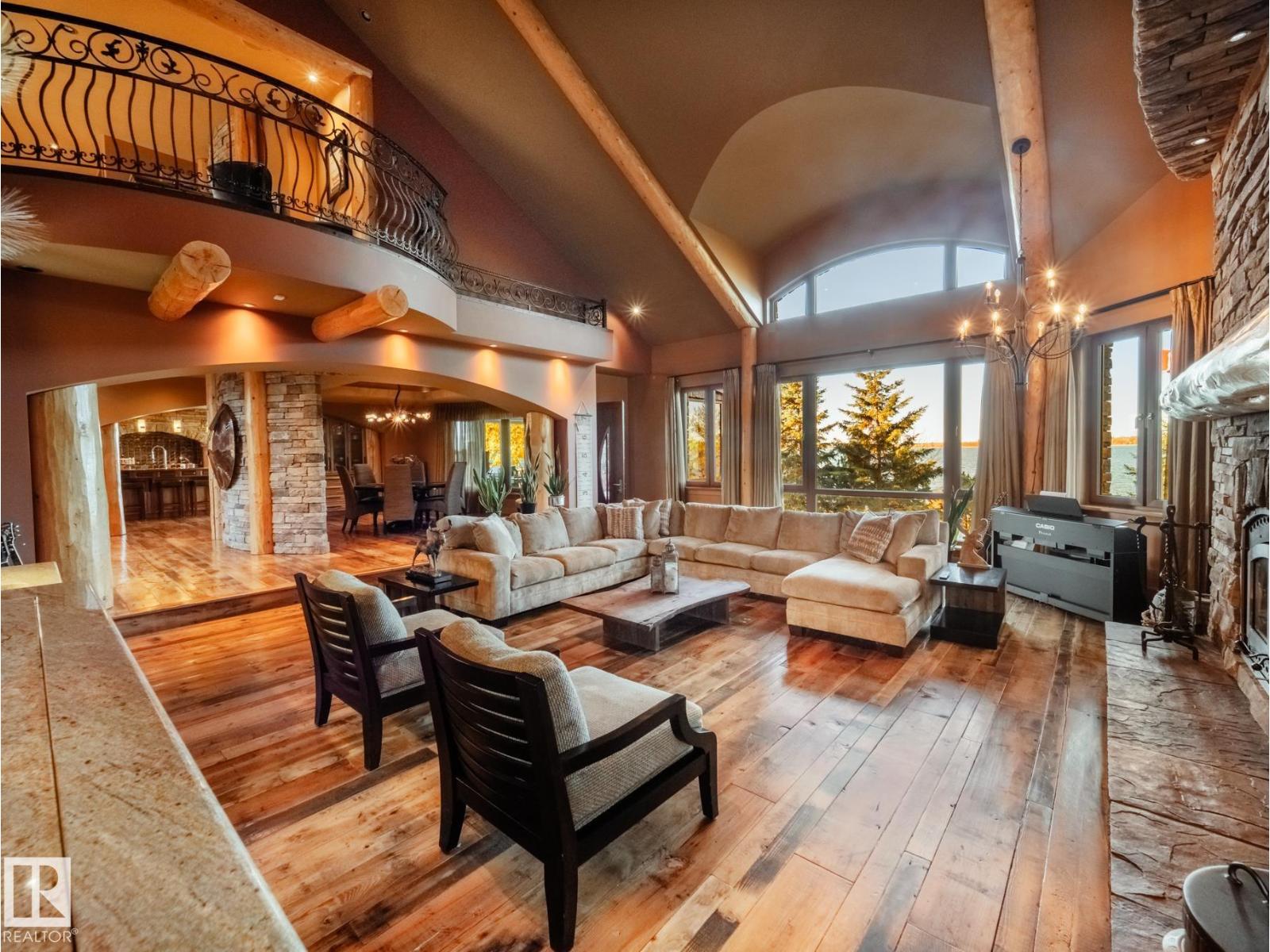 Private Moose Lake waterfront paradise w/ property extending to the water’s edge! Executive 5.64-acre estate blends luxury w/ natural beauty. Features professionally designed grounds, private boat launch, paved drive, grand front fountain & resort-style amenities. 6877 sq.ft. home impresses w/ old canary wood floors & timber framing. Great room offers a stone fireplace, wet bar & west facing sun room. Chef’s kitchen w/ Viking gas stove, espresso bar, wood- burning oven & butler’s pantry. Live edge staircase & custom iron railings leads up to a loft office. 4 Bdrms + 6 baths including a primary w/ spa ensuite, private balcony & walk through closet room to laundry. Walkout basement w/ theatre room, gym, sitting area & extra laundry. Indoor pool/hot tub room rivals any resort w/ heated floors & smart climate control. Triple heated garage, log shop w/ 14' overhead doors & potential for suite, extra 28' X 40' shop, RV hookups & smart home automation. A Rare, Fully Loaded Retreat Built For Elevated Living (id:63190)