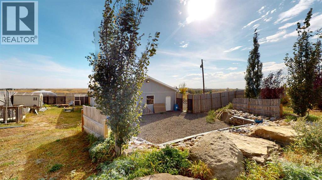 **This Acreage has Plenty to offer.** Highway 564 W - direct route to Calgary Airport**. ** 2 separate Living Spaces, Buildings**with potential for a 3rd and 4th Living space or another garage** Privacy Fence and the home was moved from Calgary onto new foundation built by Heritage Concrete in 2019. Home has all new windows and original hard wood flooring, new siding, new plumbing, new electrical Newer Gas Stove in Kitchen. Secondary building with Heated Garage is a separate building with separate living quarters built on Slab in 2019 and a fenced private yard. HEATED GARAGE: (17 '1" x 30'11") 553 sq ft. Garage RESIDENCE: 683 sq ft. There is a Privacy fencing with many gates on the North East and West side of property. The whole acreage can't be seen from main road as it gently sloped to give natural shelter from the wind. **Nicely Treed** and has a sound Berm on West/North end of property. Room for animals to be pastured. Services for Sewer, water and Electric beside main dwelling potential for large Garage or even a Shouse or Shop. Yard is gravelled and nicely designed for circle driveway ample parking and accessibility. Water Well produces 12 GPM. New Basement Foundation on Main House has 12 ft ceilings and roughed in plumbing for a kitchen and bathrooms. Basement is a blank slate for you to develop another private Living quarters. Raised Bungalow and high ceiling with lots of windows doesn't feel like a basement - feels warm and cozy. Services for another building beside main house all in place. Two = Septic tanks perfect for multiple families. MAIN HOUSE with basement: 2145 sq ft of living space. Back of home private access to main floor and basement. Located just off pavement RR 253 and 30+ mins to Airport and Calgary. Nearest town Strathmore. 10x12 Greenhouse, 10 x 10 Gazebo, black shed 7.5x6, Shed 10.5 x 8. Virtual Tours x two on this listing, check out the 360 views and there is a button to de-furnish the rooms, garage and basemen t. What would you do with this property? (id:63190)