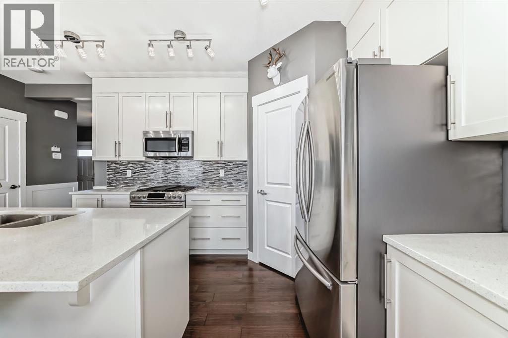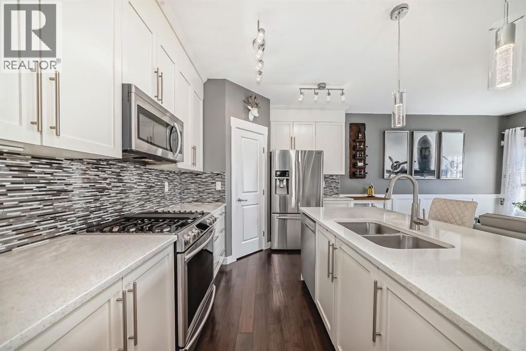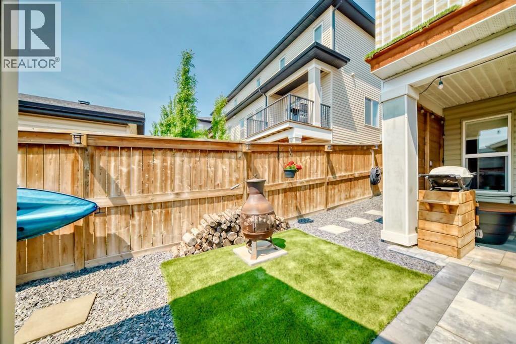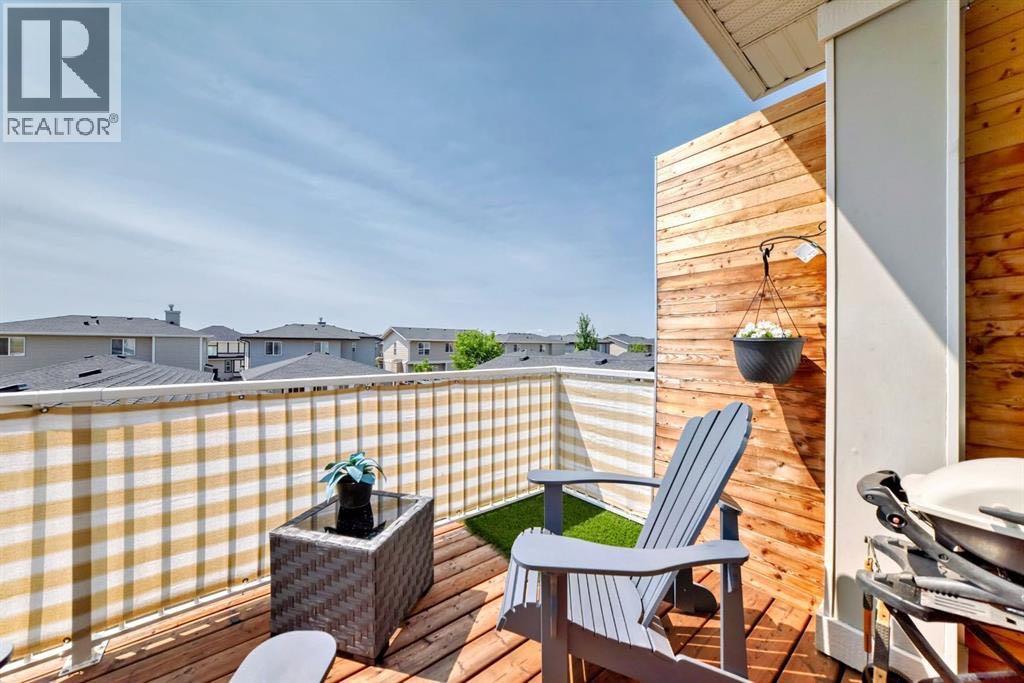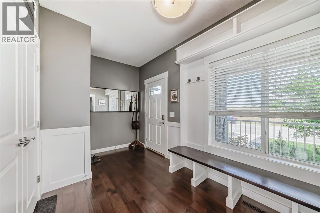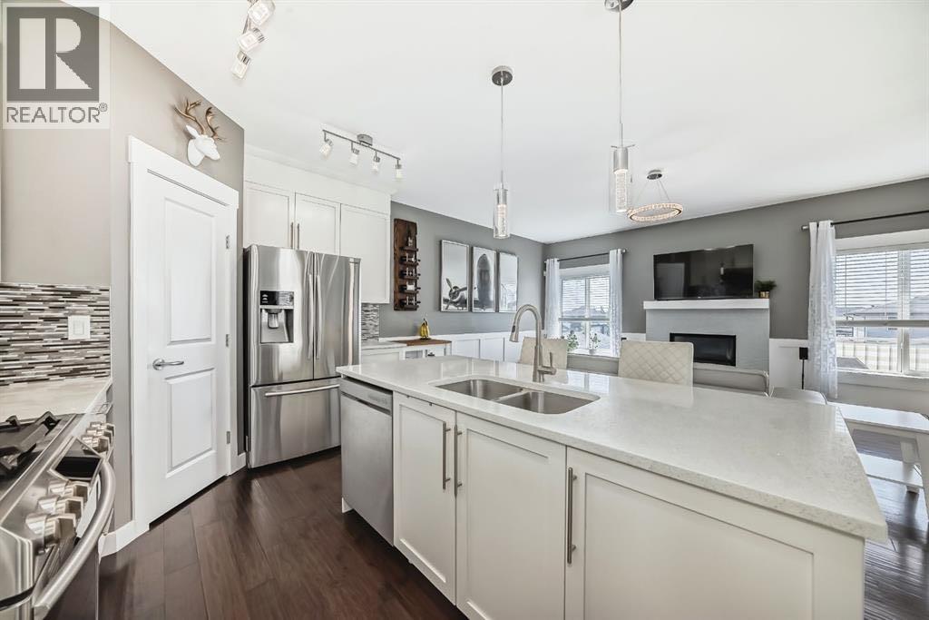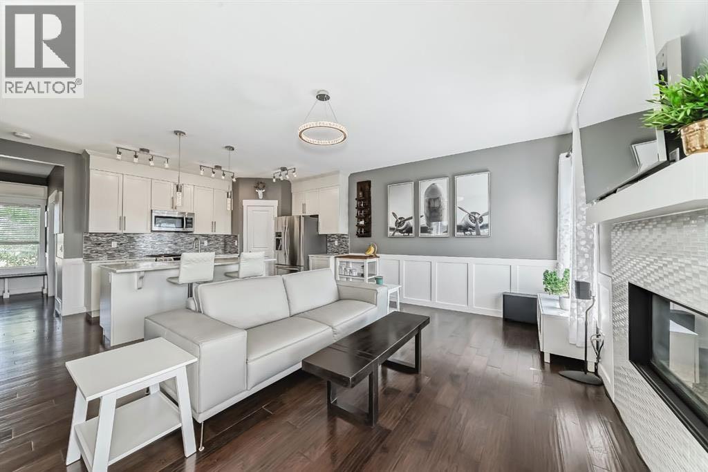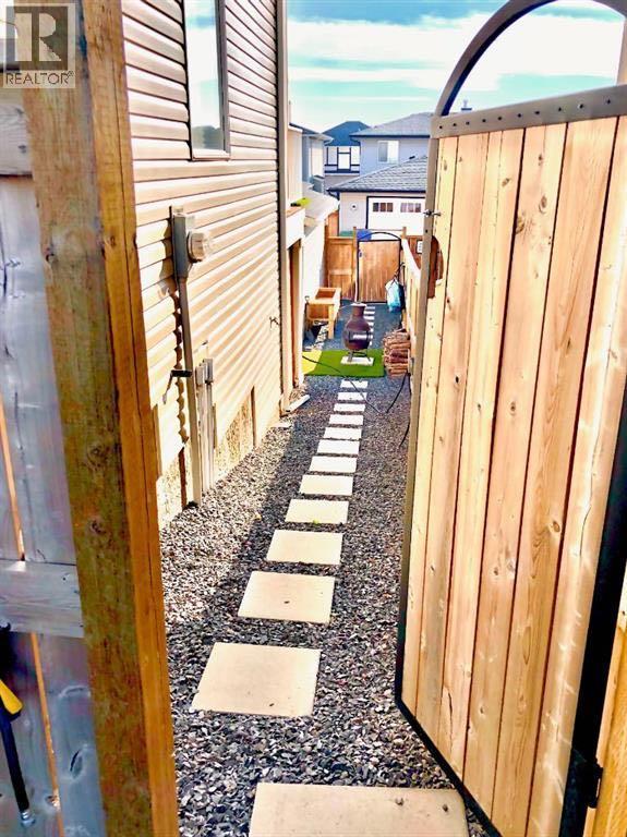 Stunning Duplex in Chestermere’s Rainbow Falls Welcome to a world of elegance and modern luxury in this breathtaking duplex, nestled in the heart of Chestermere’s coveted Rainbow Falls within the vibrant Lake Community. Meticulously crafted, this showhome-worthy residence dazzles with thoughtful upgrades and a fresh, inviting aesthetic. Exterior & Curb Appeal Charming Front Patio: Full-length patio overlooks a lush green belt, offering a warm welcome. Landscaped Backyard: Low-maintenance design with ample lounging areas for relaxation. Extended Back Deck: Complete with privacy fencing, perfect for outdoor entertaining. Oversized Double Garage: Insulated with extra-high doors, ideal for larger vehicles like trucks. Main Level Inviting Foyer: Features custom-built bench seating and intricate woodworking. Gleaming Hardwood Floors: Flow throughout, leading to a versatile flex room (office, bedroom, or more). Gourmet Kitchen: Ceiling-height white cabinetry Walk-in pantry Upgraded stainless steel appliances & gas range Expansive quartz island for prep and gatherings Sunlit Living & Dining Areas: South-facing for natural light, with a sleek gas fireplace and elegant mantel. Upper Level Primary Suite: Expansive with coffered ceilings Spa-like ensuite with dual vanities Walk-in closet with locking door for valuables Additional Bedrooms: Two generously sized rooms for flexibility (id:63190)
