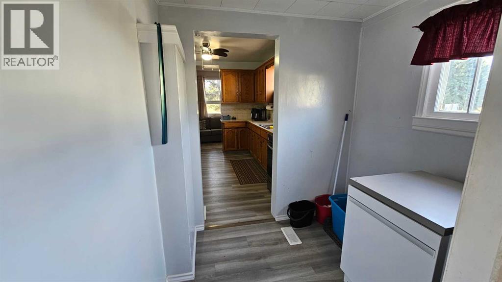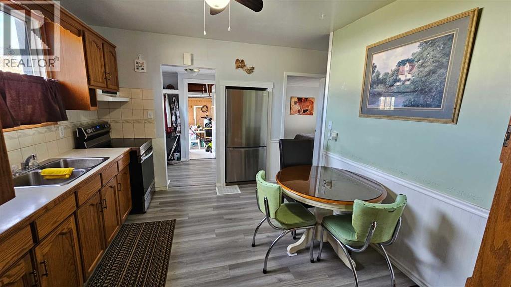 NICE AND QUIET!! Located on a large corner treed lot only one block from Castor golf course, this 1945 home has a bit of everything. Spacious kitchen with ample amount of oak cupboards, brand new appliances as in a WIFI equipped stove, large fridge and a main floor laundry. The large yard has room for a nice garden spot and space to enjoy the outdoors. There is a single attached garage with a new insulated door and opener. Front door and side door have been replaced as well. There is one bedroom and one four piece bathroom on the main floor along with two bedrooms upstairs. The house has been painted inside, newer roof on, some newer windows. The panel box has been upgraded and there is a newer forced air furnace, which is one of the reasons why the heating bills are very affordable on this home. There are mature trees giving shade in the summer and a hedge/shelter belt to block the always present wind from whistling through the yard, also creating some privacy to your home. A reasonably priced home in a very quiet town (id:63190)