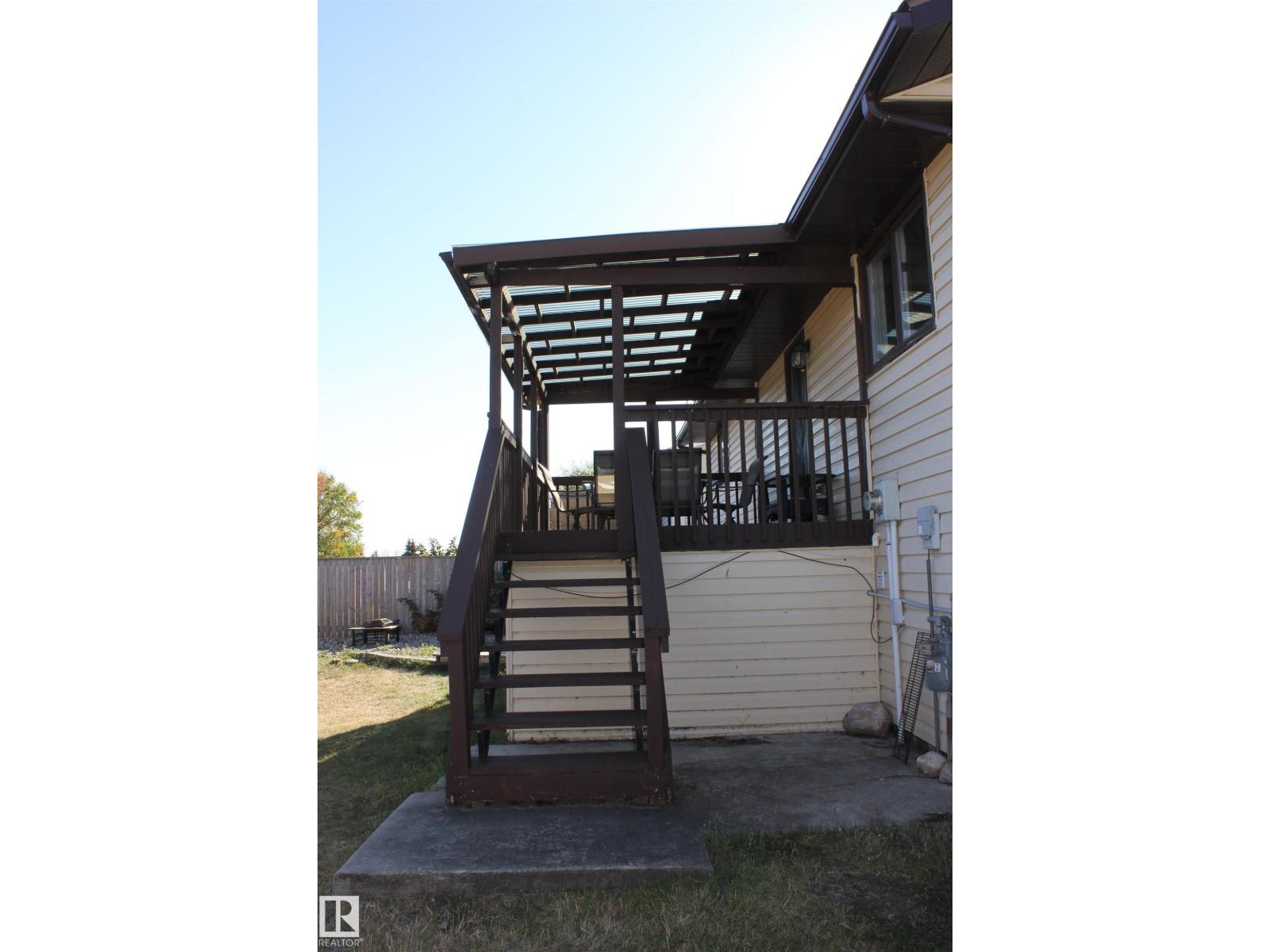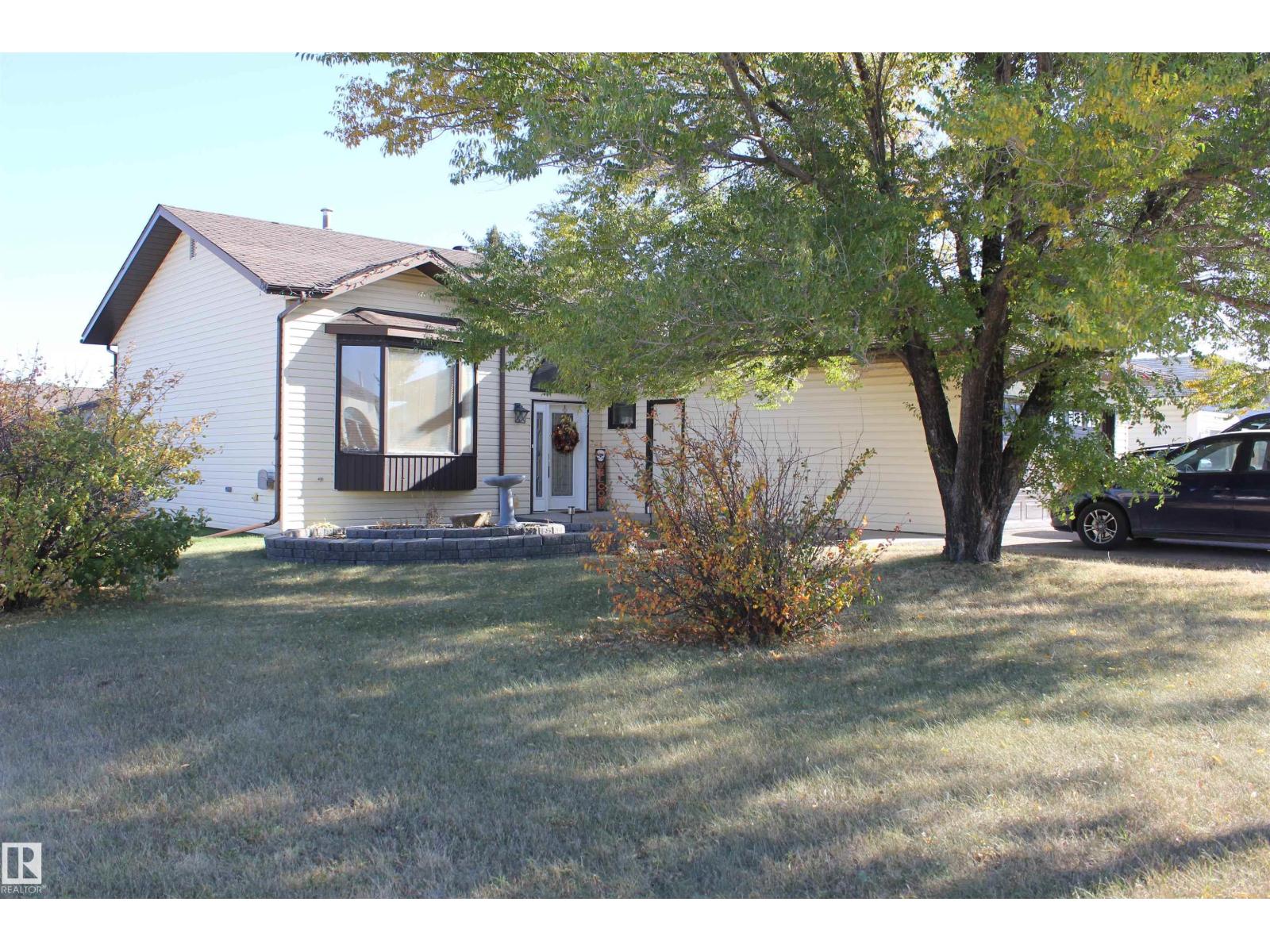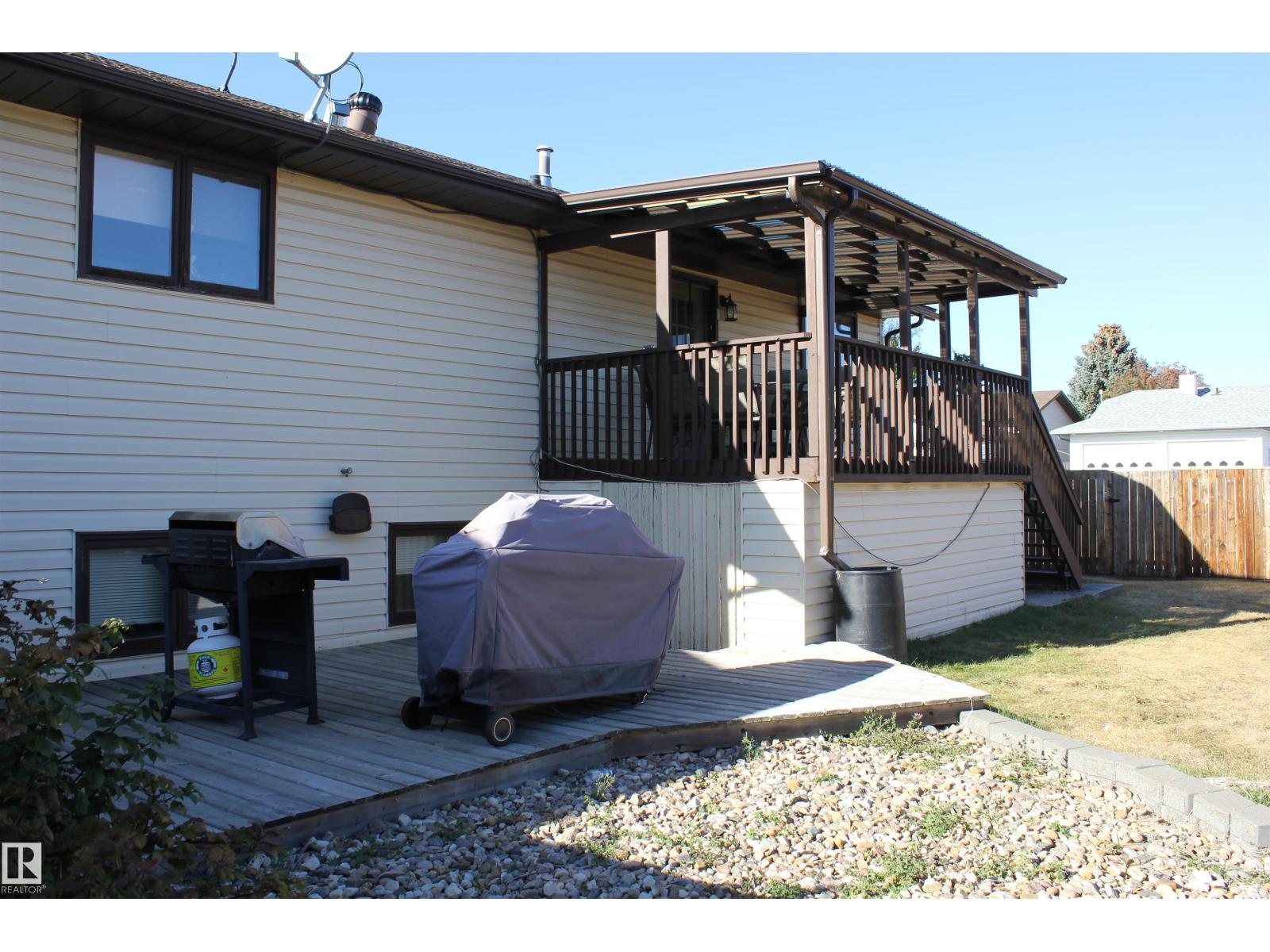 Welcome to the perfect family home in Elk Point. This 1987, 1269 sq ft home is located on a corner lot in a quiet crescent. With five bedrooms and three baths there is room for everyone. The large open concept kitchen, with an island and lots of cabinetry and a good size dining area can accommodate a growing family PLUS there is access to the east facing covered deck. On the main floor is 3 bedrooms and two baths, including a 3pc ensuite and a sunken living room. The fully finished basement boasts a large family room, 2 more bedrooms with large windows, a 3pc. bath, large laundry/utility room with a sink, cupboards and a hook-up for an electric stove, a cold room and tons of storage. To provide warmth and comfort on both levels is a boiler (2012) for hot water heat and under slab heat. The double attached garage has a workshop area and a large garage door. The backyard is fully fenced with 2 gates and provides a private sitting area with a fire pit area and storage under the deck. (id:63190)