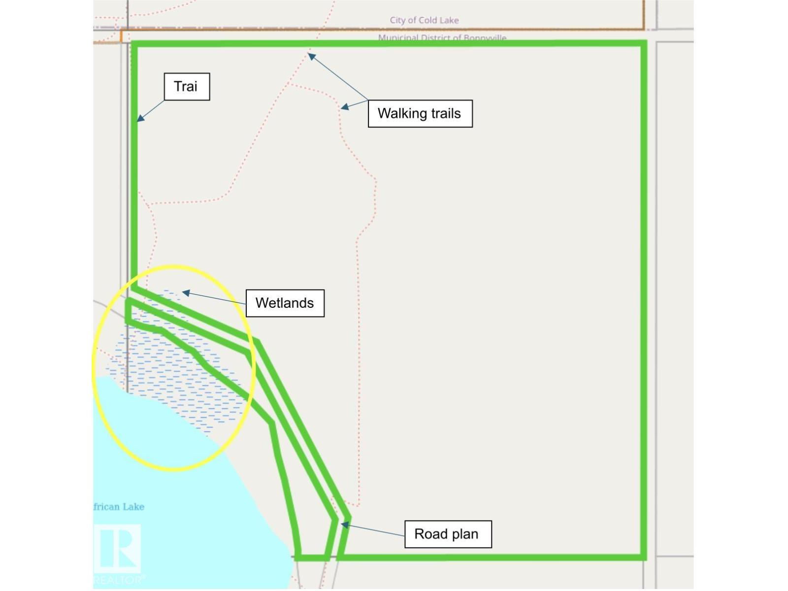 This rare piece of property bordering the African Lake between the North and South Cold Lake. Just outside Cold Lake City limits and a sought after recreation/walking space for residents all year long. 137 acres of predominantly farmland with the option to make this something spectacular! See attached MD map photo. FYI: There is no drivable access to the property. (id:63190)