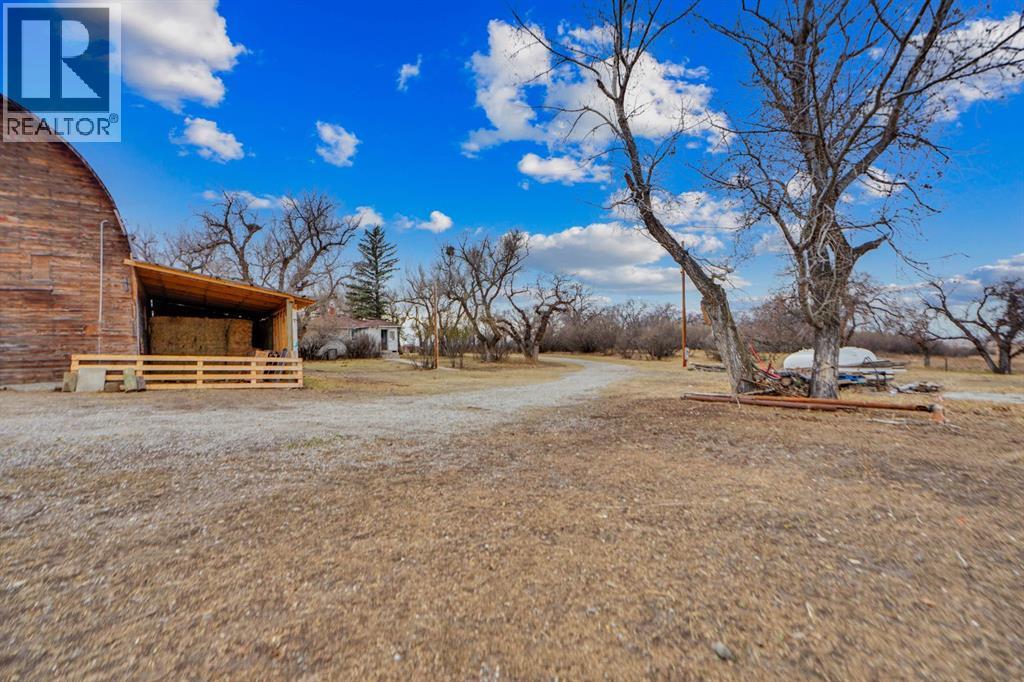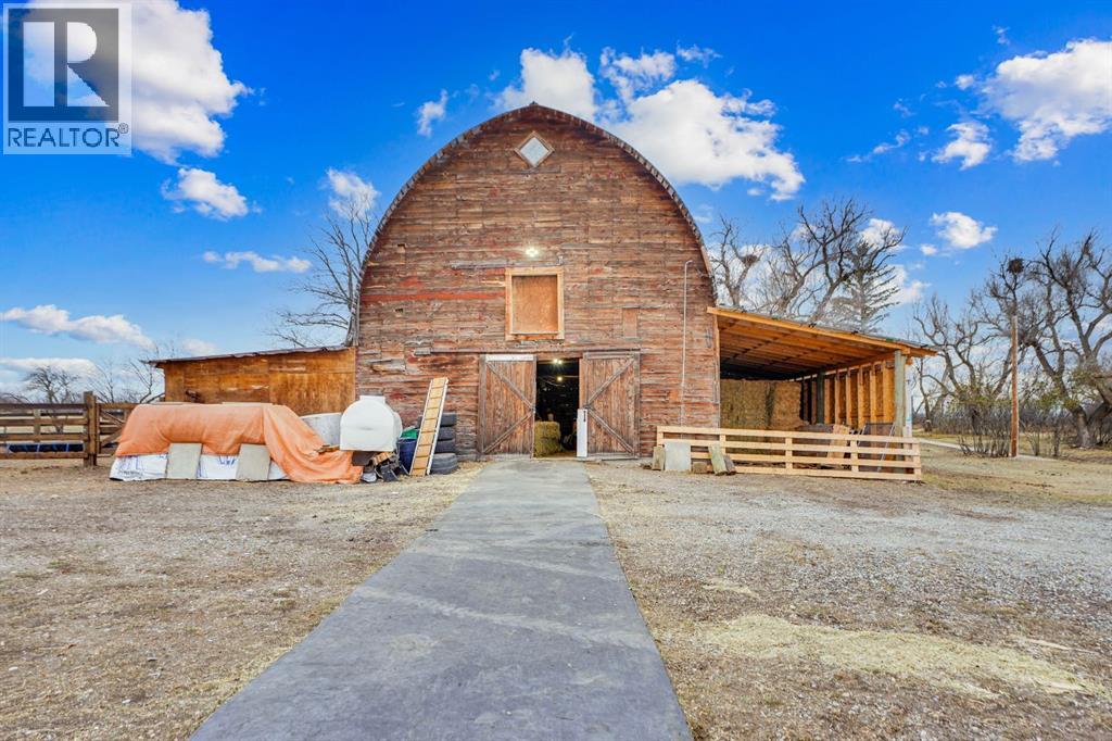 This homestead residence is 774 SF, is nestled on a generous 5-acre parcel of prime land. The home is a true fixer-upper, presenting an opportunity for repairs and renovations to restore its original charm. is sold “AS IS WHERE IS” ( the house currently is not in livable condition).. it has never been offered for sale, making it a unique chance for buyers seeking a property with historic character and potential. There are services to the home but not hooked up, with a gas meter already installed. Electrical wiring throughout the house is copper and the main breaker shut off for the entire property is at the power pole. The house is serviced by a concrete septic tank and a greywater field. The well is poly-lined, 80 ft deep, and according to Alberta well records, sits on an aquifer, indicating a reliable water source; however, the gallons per minute are unknown. Exterior construction features quarter logs of Douglas Fir with a poured concrete basement. Front of the property has a wood fence (2023), constructed with page wire and 12-inch cedar posts. The large barn is a Dutch-style gothic arch structure, measuring 32 ft by 64 ft, with a main floor of approximately 2,000 SF (including both lean-tos) and a loft measuring 32 ft by 30 ft (960 square feet). The barn is cable-suspended, with cables supporting the walls in all directions. The concrete floor was poured in 1950. The barn and lean-to includes lighting & electricity. The barn’s roof was replaced in 2021. Horse enthusiasts will appreciate this large barn that leads to the covered horse lean-to (2022) with heavy duty rubber mats, a large fenced paddock with an outdoor electrical outlet. The opposite side of the barn offers a lean-to (2024) for hay storage, etc. There is a dedicated 60-ft round pen (2025) w/sand, perfect for training and exercising horses, and approx. 2-3 acres of grazing land. The entire property is fenced with four strands of barbed wire and wood posts and is cross-fenced with numerous gates.. New gravel to the driveway (2023). 30 plus mature trees envelop the property, ensuring privacy and providing shade (oak, apple, elm, poplar, spruce), numerous shrubs, along with mature lilacs. The property boasts an abundance of wildlife, including owls, geese (which nest annually), fox, deer, eagles with nests, red-tailed hawks, and offers scenic views of the mountains. No neighbours on all 4 sides ensure this property remains serene and private. This 5 acre parcel is a Prime Location, ideally situated north of Parkland, 8 mins south of Nanton, 45 minutes from Calgary, just a short drive from the communities of Nanton and Stavely. Enjoy easy access to amenities, schools and local services without sacrificing the benefits of rural living. (id:63190)