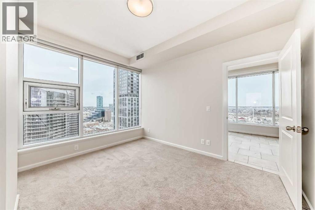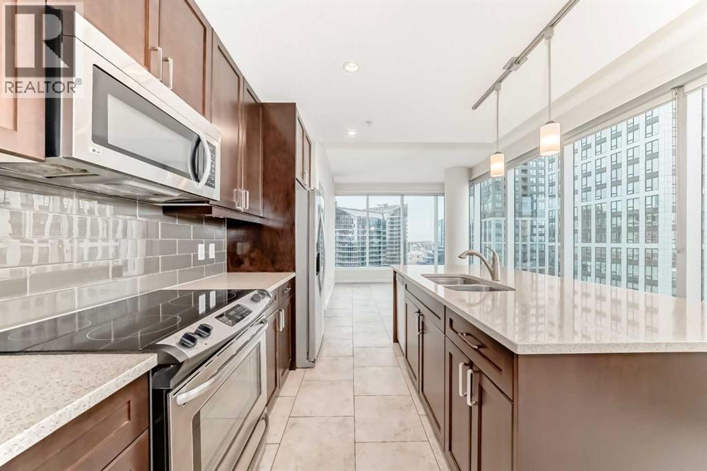 Click brochure link for more details. Experience the best of downtown living in this bright and stylish 22nd-floor corner unit at NuEra. With floor-to-ceiling windows and 9-foot ceilings, this home is filled with natural light and offers panoramic views that stretch for miles — including a front-row seat to the Stampede Grandstand show and fireworks, right from your bed!The open-concept kitchen is perfect for both everyday living and entertaining, featuring custom cabinetry, granite countertops, stainless steel appliances, and a large island that flows effortlessly into the living and dining spaces.The primary bedroom is a private retreat with a walk-in closet and a spa-inspired ensuite complete with a soaking tub. The second bedroom is located on the opposite side of the unit for added privacy and enjoys its own spectacular views with easy access to a modern 3-piece bathroom.Additional features include in-suite laundry, secure underground parking, a storage locker, designated bike storage, and visitor parking. Residents also enjoy access to premium building amenities, including a fully equipped fitness centre and professional concierge service.Located in the heart of Calgary’s vibrant Victoria Park, you’re just steps from 17th Avenue, the C-Train, Sunterra Market, and some of the city’s best dining, shopping, and entertainment.This is luxury urban living at its finest — a rare opportunity to own a spectacular home with unmatched views and convenience. (id:63190)