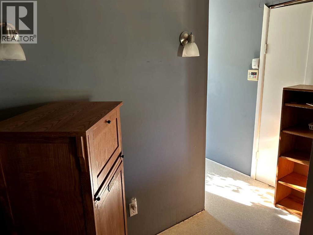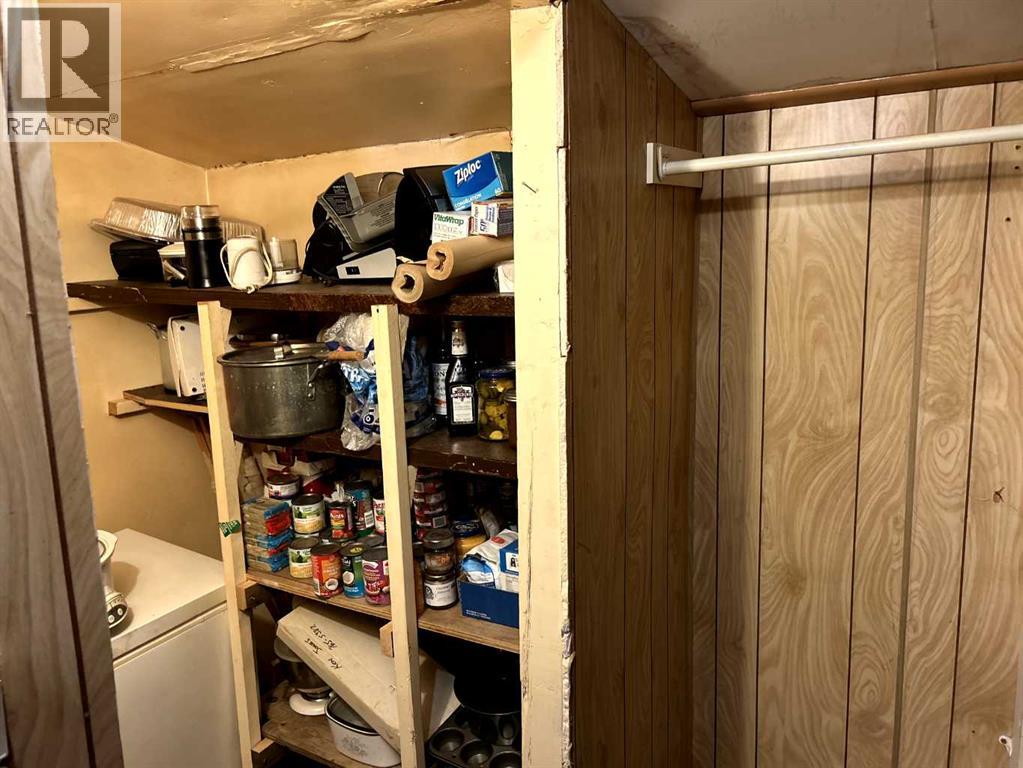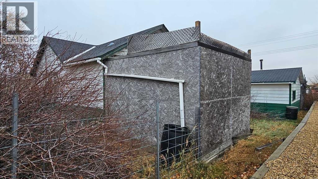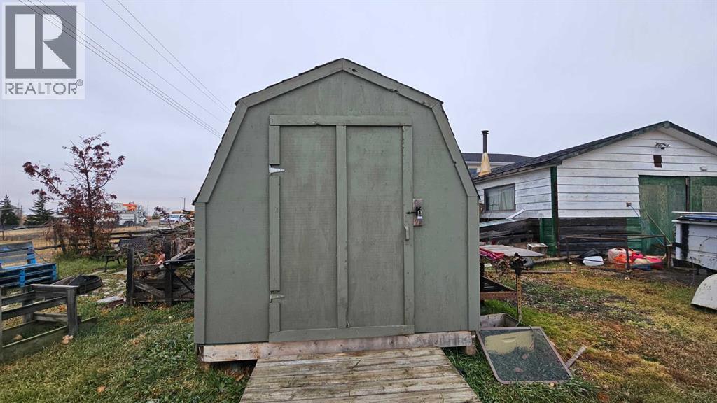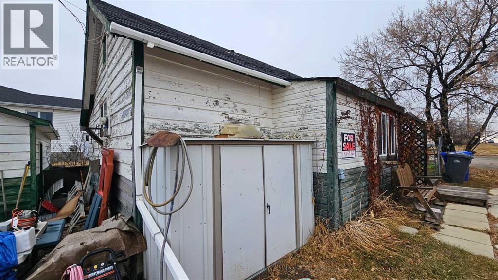 Cozy home on a corner lot with multiple sheds and a double detached garage, this 710 sq ft single bedroom with a newer window, along with an upgraded four piece bathroom, upgraded kitchen, main floor washer and dryer and has a comfortable living room with newer front window. A set of patio doors off the laundry area goes onto a deck that is surrounded by a windbreak to the west and north side. The interior has had some laminate flooring laid, but will need the rest of the house done. The outside is needing a good paint job, along with the sheds and garage. There is a partial basement that has a newer HE furnace and a newer on demand hot water system. There is a small cold porch to the east side . Shingles were done in approximate 2013 on the house. (id:63190)