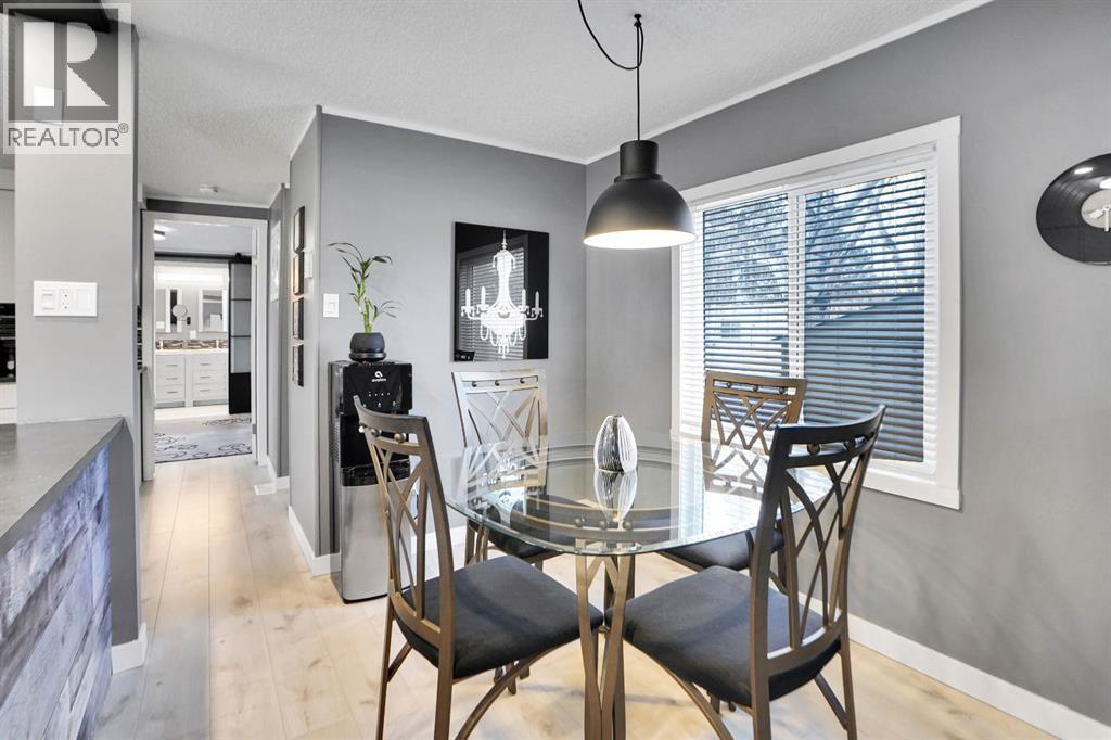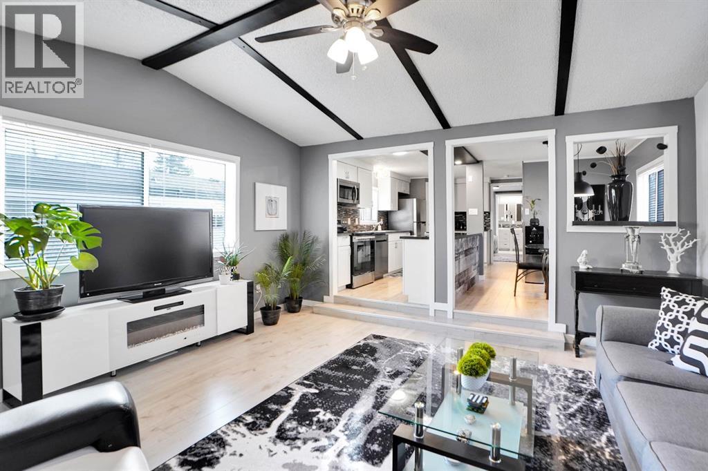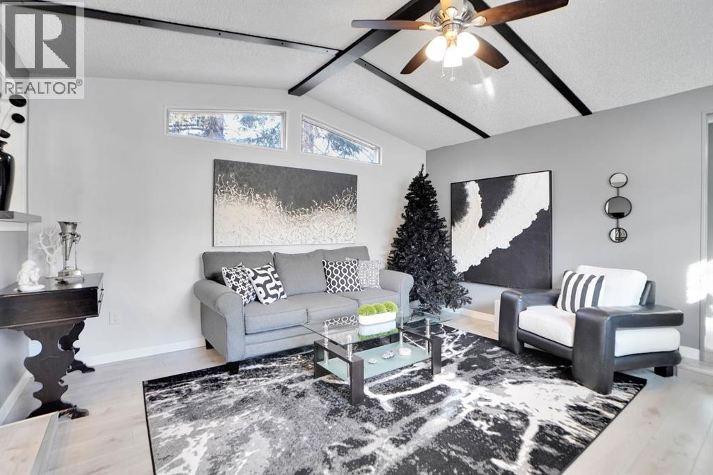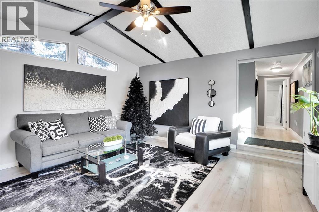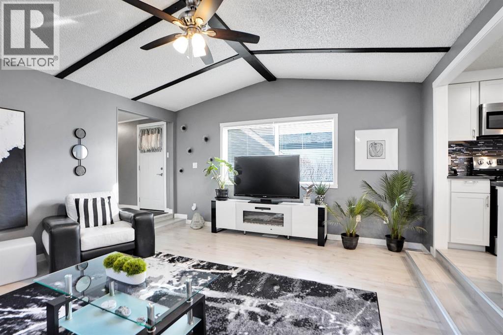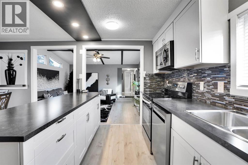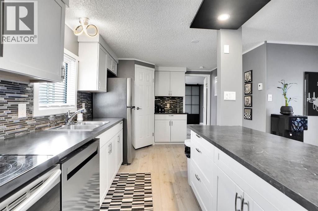 Welcome to Greenwood Village. Beautiful, completely renovated in 2021, 3 bed, 2 bath, 1160 sf mobile home in this NW amenities-rich community. This immaculately maintained home that shows like new is truly move-in ready. Laminate flooring throughout, white shaker-style kitchen cupboards, tiled backsplash, stainless steel appliances, coffee bar, and corner pantry, large kitchen island with pot lights, and a good size eating nook complete the kitchen area. Also in 2021 NEW WINDOWS, NEW FURNACE, All POLY B replaced with PEX, and newer roof. Electrical Panel – 2021 Baseboard and casing - 2021. 4 PCE ENSUITE has walk-in shower with tiled seat and awesome massage shower system. This great home has a huge sunken living room with black accent beams in the vaulted ceiling, and a step up to the kitchen and eating area. Separate laundry and furnace room can be found at the rear exit. The large master bedroom could easily fit a king bed, has a wall to wall closet with glass doors, and a black metal siding door that leads to the huge, fully tiled ensuite with a double sink vanity and walk in shower. Newer lighting, painted throughout in a modern palette, with a bright and airy feel. At the opposite end of the home are two additional bedrooms, the full bathroom, a nice entry with coat closet all makes this a great, functional floorplan. Add a carport, parking for two cars, a fenced backyard and a shed are all value-added items that round out this home to be terrific value! Located next to Greenwich Village, home of the famous Farmers Market West. This home is ideally located near Stoney Trail Ring Road for effortless citywide travel, and Highway 1 for a weekend getaway to Banff or Bragg Creek. Lease fee of $1375 monthly includes water, sewer, garbage pick up & snow removal. Calgary Transit and a school bus offers service through the park. Lease approval required, pets allowed. (id:63190)