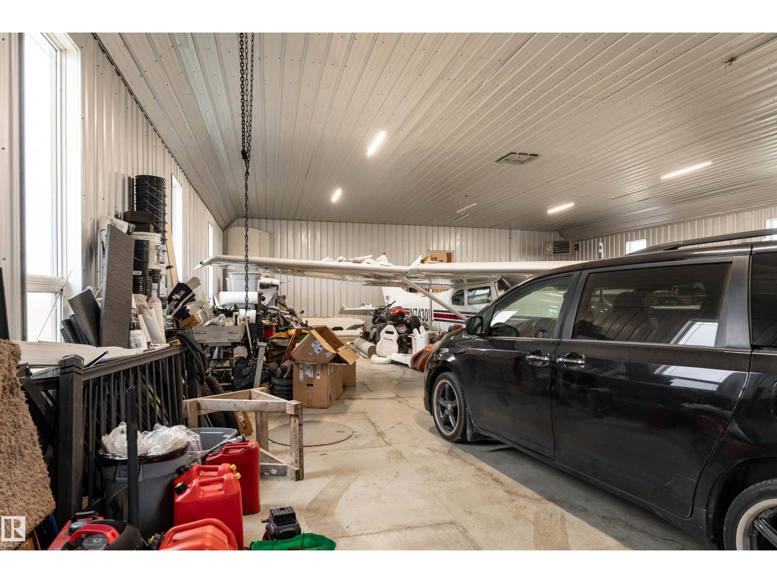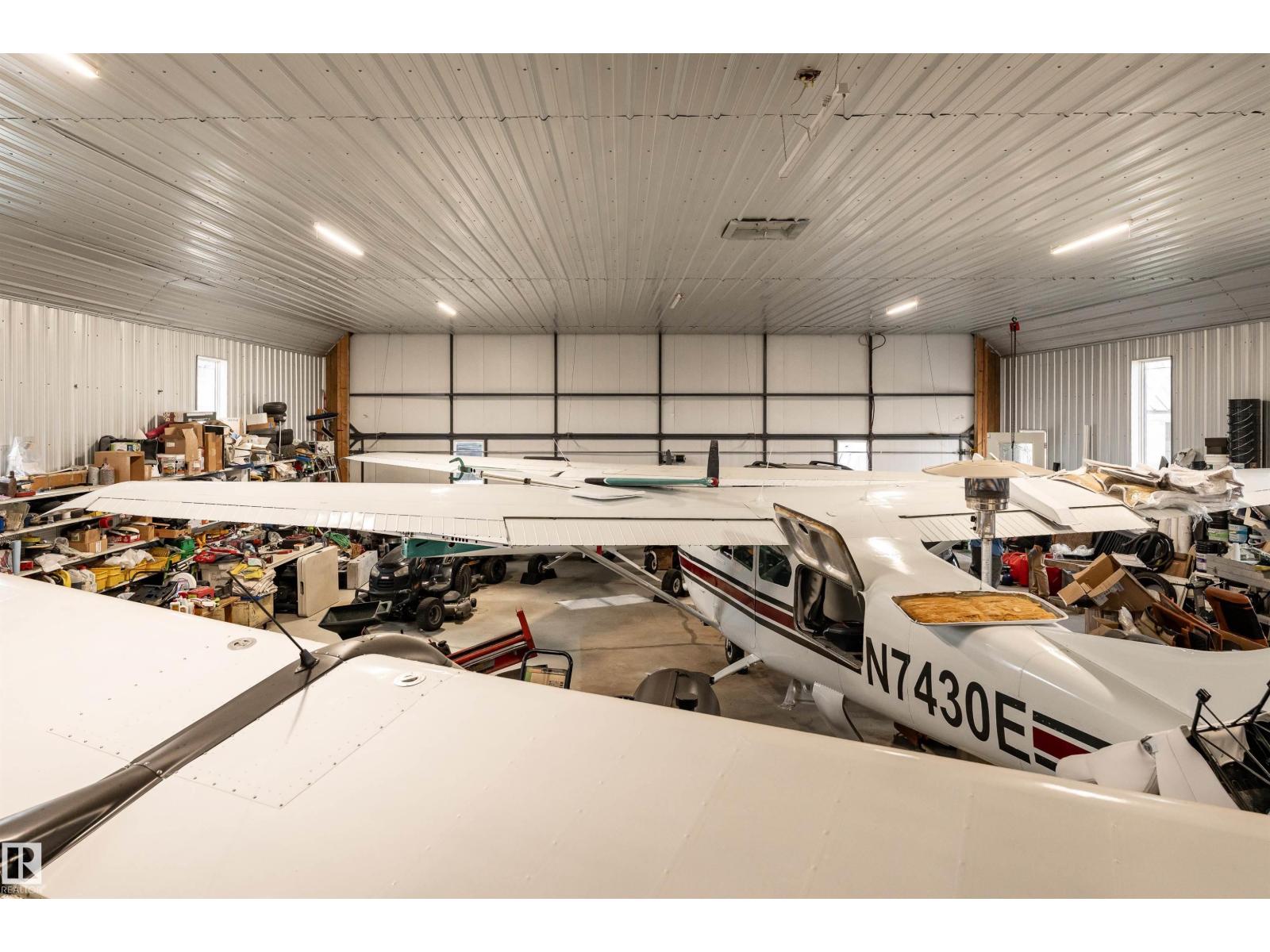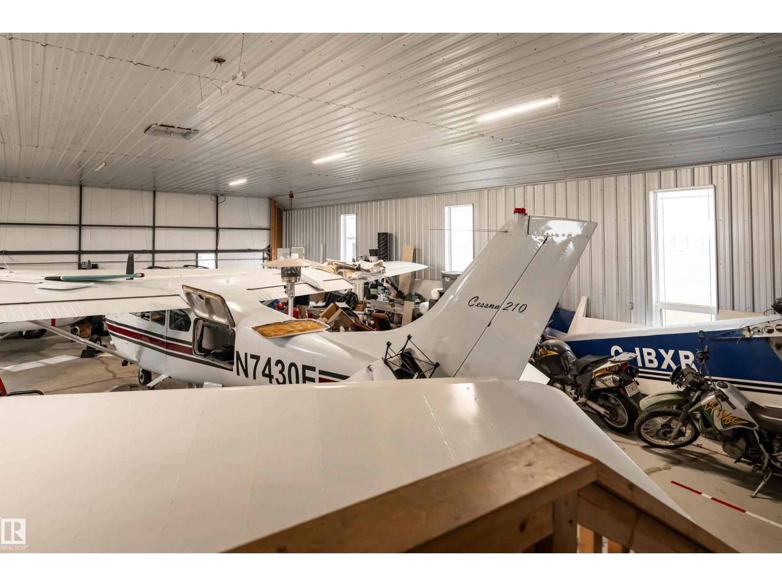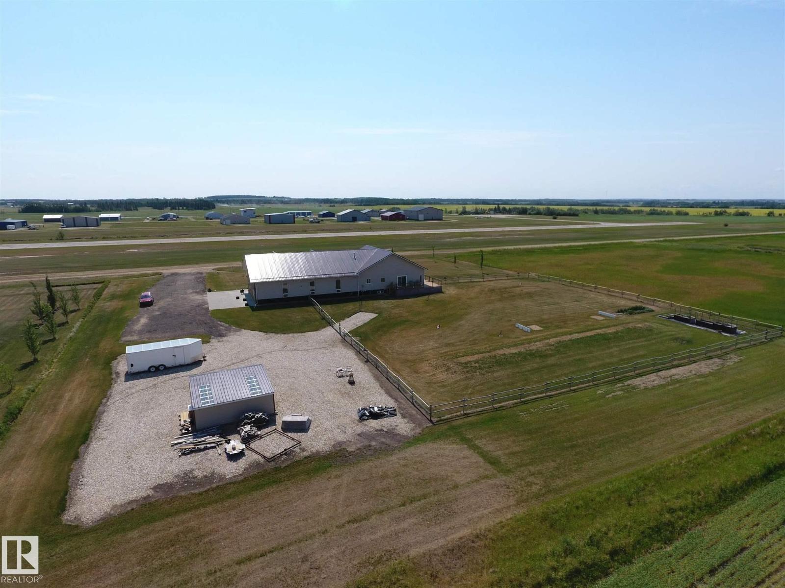 Get Inspired in Westlock. A rare aviation lover’s dream! Welcome to West Air Estates, an exclusive community where you can live, work, and fly right from your own backyard. This stunning 4 bed + Den, 3 bath bungalow is attached to a massive heated and insulated hangar, giving both you and your aircrafts a place to call home. The hangar measures 44 ft by 58 ft with a 40 ft bifold door and tons of natural light, perfect for your plane, ultralight, or helicopter. Enjoy watching aircraft take off and land right from your living room or kitchen while relaxing in a bright, open space featuring 10 ft ceilings, hardwood floors, granite counters and a chef’s kitchen. The fully finished basement has new vinyl plank flooring, wet bar and a spacious rec area for entertaining. Set on nearly 2 acres, there’s room for your RV, boat, or classic cars, plus extra storage sheds and a workshop. Located minutes from the runway, amenities, and only 40 minutes to Edmonton, this is your chance to own a true pilot’s paradise. (id:63190)
