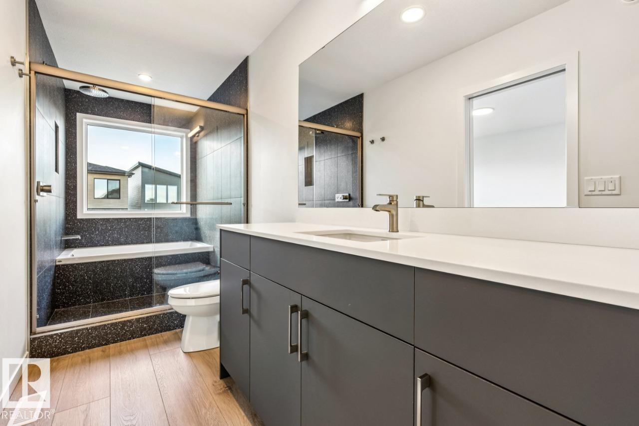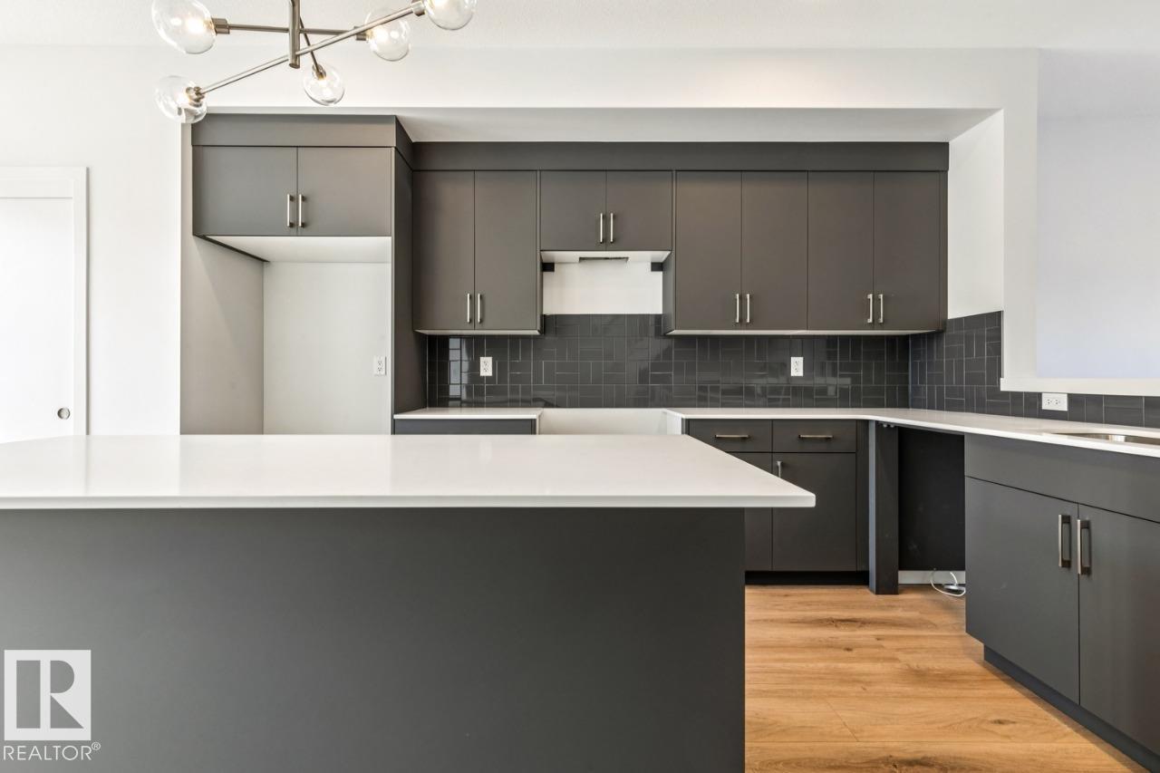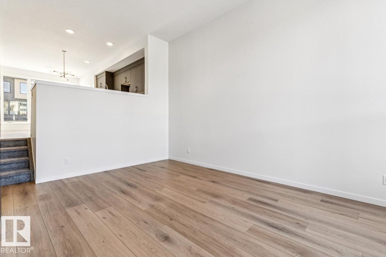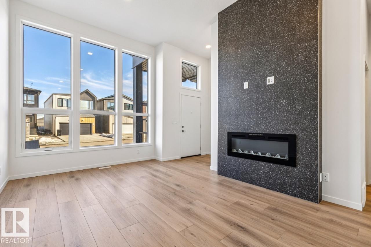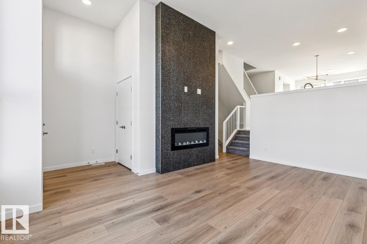 Welcome to the Metro Elevate 18 by Cantiro Homes! Located in the sought after community of Riverstead at Keswick in Southwest Edmonton, this 1391 sq ft rear laned single family home offers 3 beds, 2.5 baths and upstairs laundry. This home offers a thoughtfully designed split level layout that seamlessly connects your main living spaces. The spacious living room flows into an elevated kitchen and dining area, creating an open yet distinct feel. Upstairs, the large primary bedroom includes a luxurious ensuite with a wet room and drop in tub, along with direct access to the walk in closet and adjoining laundry room for added convenience. Additional features include: electric fireplace, upgraded iron spindle railing, Slate interior style, and West Coast Fusion Plus exterior. (id:63190)