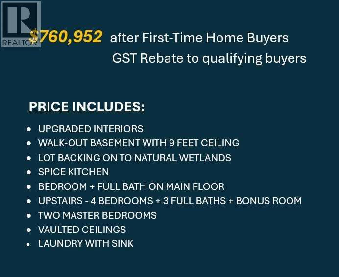 READY IN APRIL 2026 / BRAND NEW / WALK-OUT BASEMENT / LOT BACKING ONTO WETLANDS / SPICE KITCHEN / MAIN FLOOR BEDROOM + FULL BATH / TOTAL 5 BED + 4 FULL BATH / DUAL MASTER BEDROOM / NEW HOME GST REBATE (Eligibility restrictions apply). Amazing Design! Unique in Features! Brand New Home! Over 2300+ SQFT of stylish design welcomes you into this stunning FIVE BEDROOM and FOUR FULL BATH home located in the beautiful community of Cornerstone. You're welcomed to a thoughtfully designed living space that maximizes every inch while offering an abundance of space for your whole family to enjoy! The gorgeous OPEN FLOOR PLAN with 9 feet ceiling, invites you in to discover a lovely kitchen that boasts beautiful QUARTZ counter tops, sleek stainless steel appliance package with an upgraded cooktop, French Door Fridge with Internal Water + Ice, Built in Wall Oven/Microwave Combo and a power pack built-in cabinet hoodfan. A large walk-in SPICE KITCHEN and beautiful extended over-sized flush centre Island that overlooks the generous great room and dining room-Ideal for all entertaining. The main floor has a beautiful view of the NATURAL WETLANDS from windows on back. A sizeable 5TH BEDROOM on the main floor, perfect for a large family or working from home, along with full bath adjacent to this functional space. A mudroom with storage gives a convenient space for the family to access to and from garage. Upstairs, you will discover FOUR MORE BEDROOMS with TWO MASTER Bedroom's, with the main one boasting a VAULTED CEILING, a 5pc en-suite with dual vanities, stand alone shower, over sized bath, window overlooking natural wetlands and large walk-in closet. A centralized BONUS ROOM with VAULTED CEILING offers an additional living space and another 3-pc full bath and LAUNDRY WITH SINK and storage complete this level. ADDITIONAL FEATURES: Upgraded Fit and Finish , ALL BATHROOMS having standing showers, Lot backing onto expansive wetlands, a 12 x 11 feet deck with open views of wetlands, ir on spindle railing added to stairs, and raised 9' basement ceiling height and 3-piece rough-in plumbing along with patio door on the back. Situated close to the International Airport with quick access to both Deer Foot Trail and Stony Trail along with new amenities being added to the community continuously, you will enjoy all Cornerstone has to offer. A brand new build with all of the difficult decisions decided along with a functional and intelligent floorplan for a large family. (id:63190)