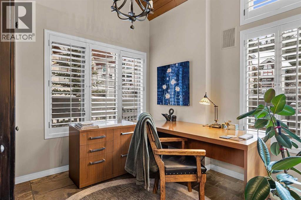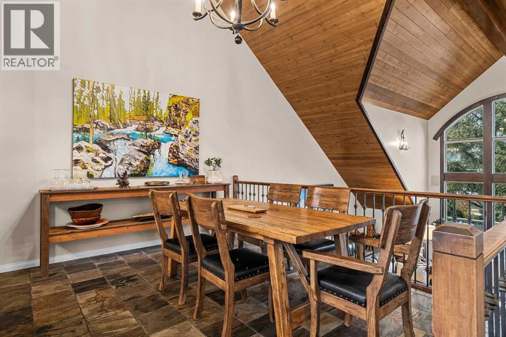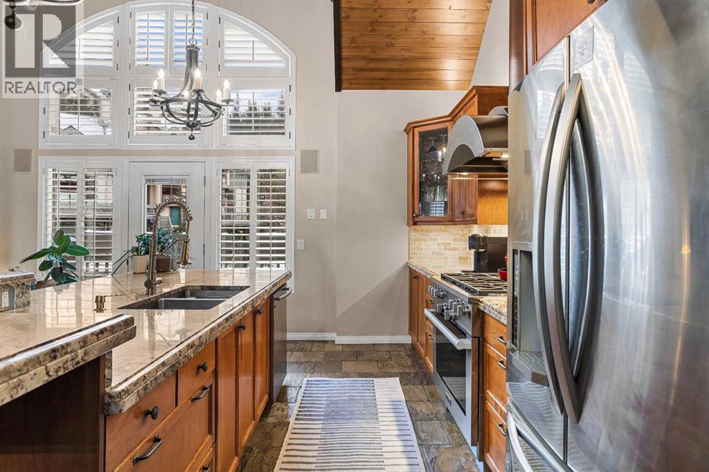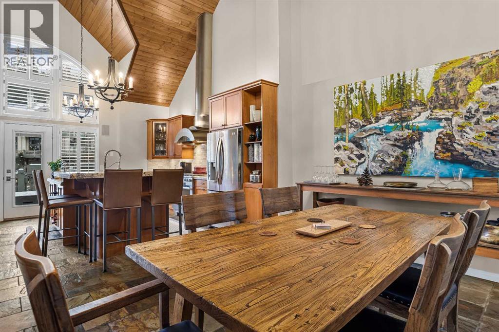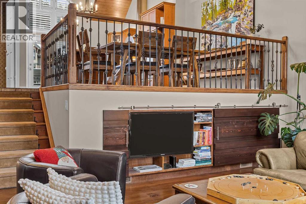 Luxurious End Unit Townhome in Exclusive Banff Neighbourhood - Tatanga Ridge I !This spacious, 2,716 sq.ft. alpine styled three bedroom plus den home stands in a class of its own – offering a level of finish, charm and functionality unmatched by anything currently on the market.Tastefully upgraded from top to bottom, the home welcomes you on the main level with a large sunny south facing balcony with massive windows that flood the interior with natural light. At the heart of this level is a dream kitchen with granite countertops, undermount sink, brick backsplash, oversized Miele gas range, custom hood fan, and stainless fridge with French doors. This level is accentuated with beautiful slate flooring and custom lighting and includes the dining area, home office, powder room and roomy foyer. Striking vaulted ceilings, clad in rich tongue and groove pine planks and accentuated with prominent timber beams guide you down to an airy and warm living room with a floor to ceiling river rock wood burning fireplace, a cozy alpine feature. Grand windows and a wrap around deck capture incredible views of Norquay and Cascade mountains. Gorgeous wide plank Douglas Fir flooring in the living room and primary bedroom create warmth and comfort. The tranquil primary bedroom comes complete with a slate accented gas fireplace with timber mantle, private deck, and full spa like ensuite bathroom with soaker tub and separate enclosed steam shower. The versatile bonus room/den complete with gas fireplace, custom bar made from west coast Maple with live edge and wine rack offers the perfect setting for movie nights, quiet reading or watching the big game. The lower level consists of two roomy bedrooms, a full bathroom, and separate laundry room. Lastly, for all your mountain toys there is a large attached double car garage featuring epoxy-coated flooring and storage for your year-round adventure gear. For added safety a fire smart all metal roof sprinkler system has been i nstalled to protect against possible wildfire. This home has everything you are looking for in a mountain home and more! (id:63190)