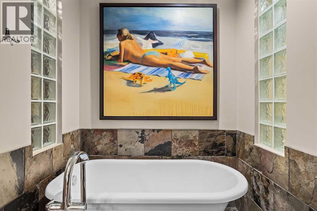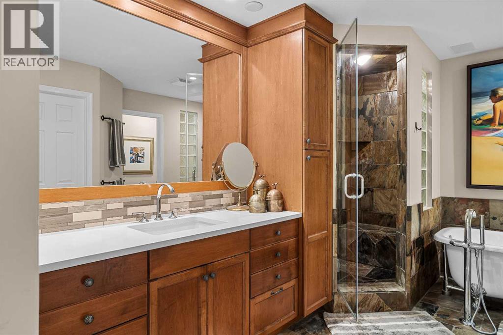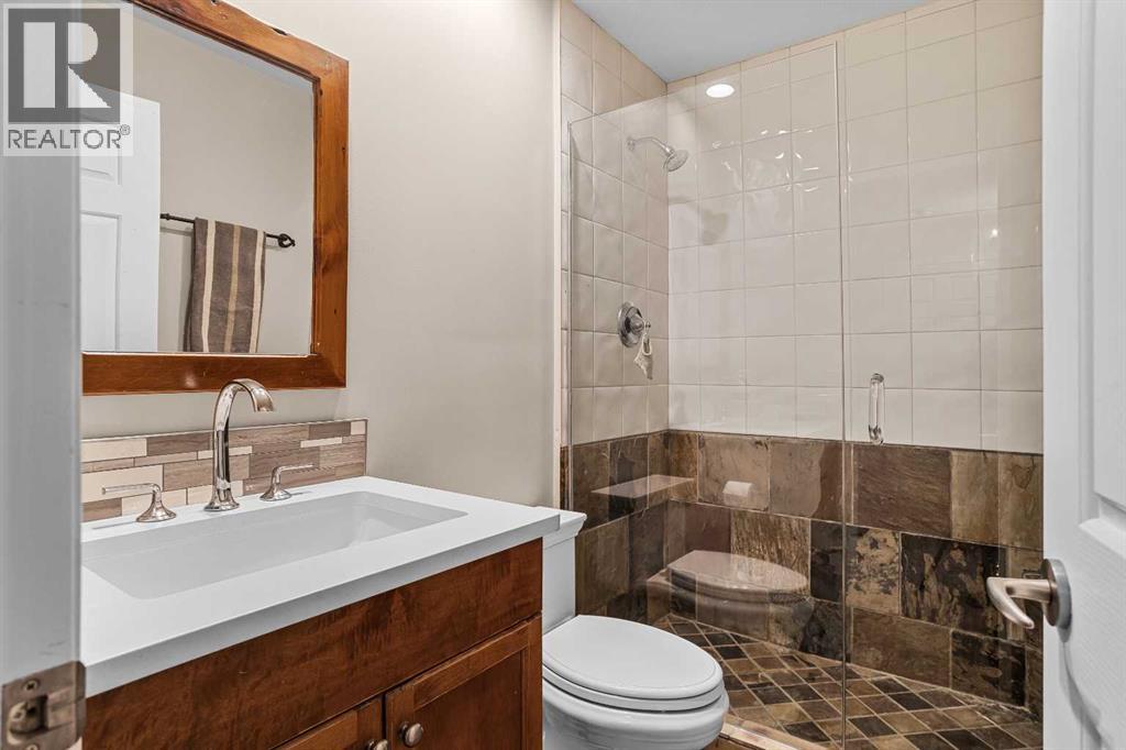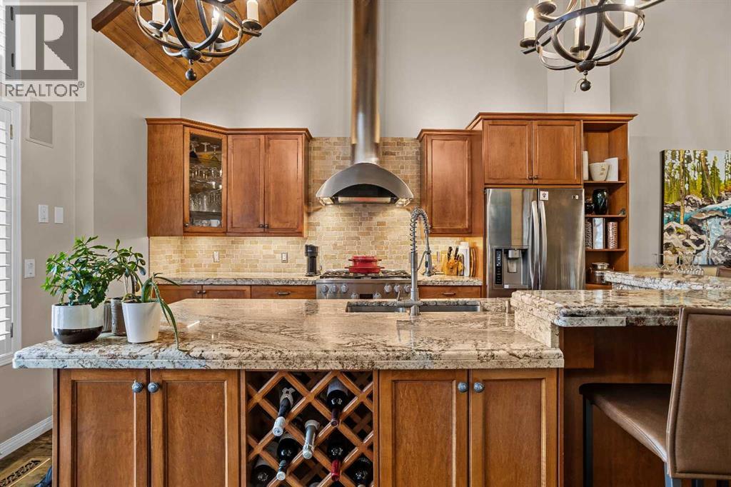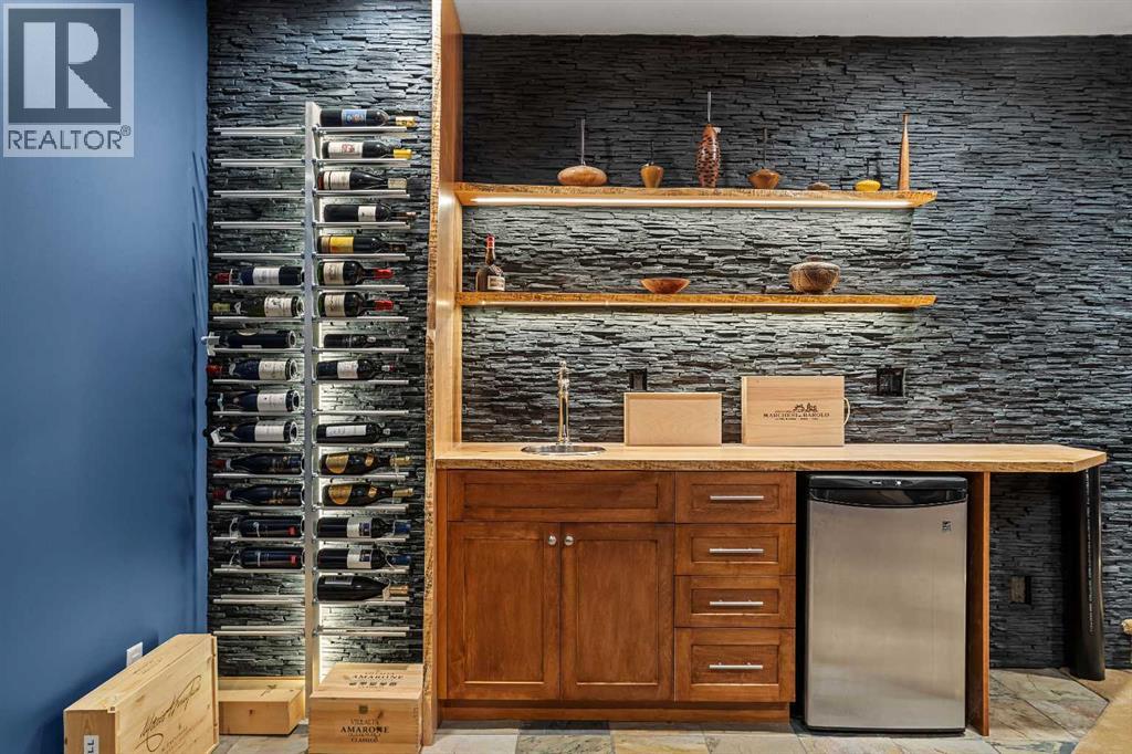 Luxurious End Unit Townhome in Exclusive Banff Neighbourhood - Tatanga Ridge I !This spacious, 2,716 sq.ft. alpine styled three bedroom plus den home stands in a class of its own – offering a level of finish, charm and functionality unmatched by anything currently on the market.Tastefully upgraded from top to bottom, the home welcomes you on the main level with a large sunny south facing balcony with massive windows that flood the interior with natural light. At the heart of this level is a dream kitchen with granite countertops, undermount sink, brick backsplash, oversized Miele gas range, custom hood fan, and stainless fridge with French doors. This level is accentuated with beautiful slate flooring and custom lighting and includes the dining area, home office, powder room and roomy foyer. Striking vaulted ceilings, clad in rich tongue and groove pine planks and accentuated with prominent timber beams guide you down to an airy and warm living room with a floor to ceiling river rock wood burning fireplace, a cozy alpine feature. Grand windows and a wrap around deck capture incredible views of Norquay and Cascade mountains. Gorgeous wide plank Douglas Fir flooring in the living room and primary bedroom create warmth and comfort. The tranquil primary bedroom comes complete with a slate accented gas fireplace with timber mantle, private deck, and full spa like ensuite bathroom with soaker tub and separate enclosed steam shower. The versatile bonus room/den complete with gas fireplace, custom bar made from west coast Maple with live edge and wine rack offers the perfect setting for movie nights, quiet reading or watching the big game. The lower level consists of two roomy bedrooms, a full bathroom, and separate laundry room. Lastly, for all your mountain toys there is a large attached double car garage featuring epoxy-coated flooring and storage for your year-round adventure gear. For added safety a fire smart all metal roof sprinkler system has been i nstalled to protect against possible wildfire. This home has everything you are looking for in a mountain home and more! (id:63190)