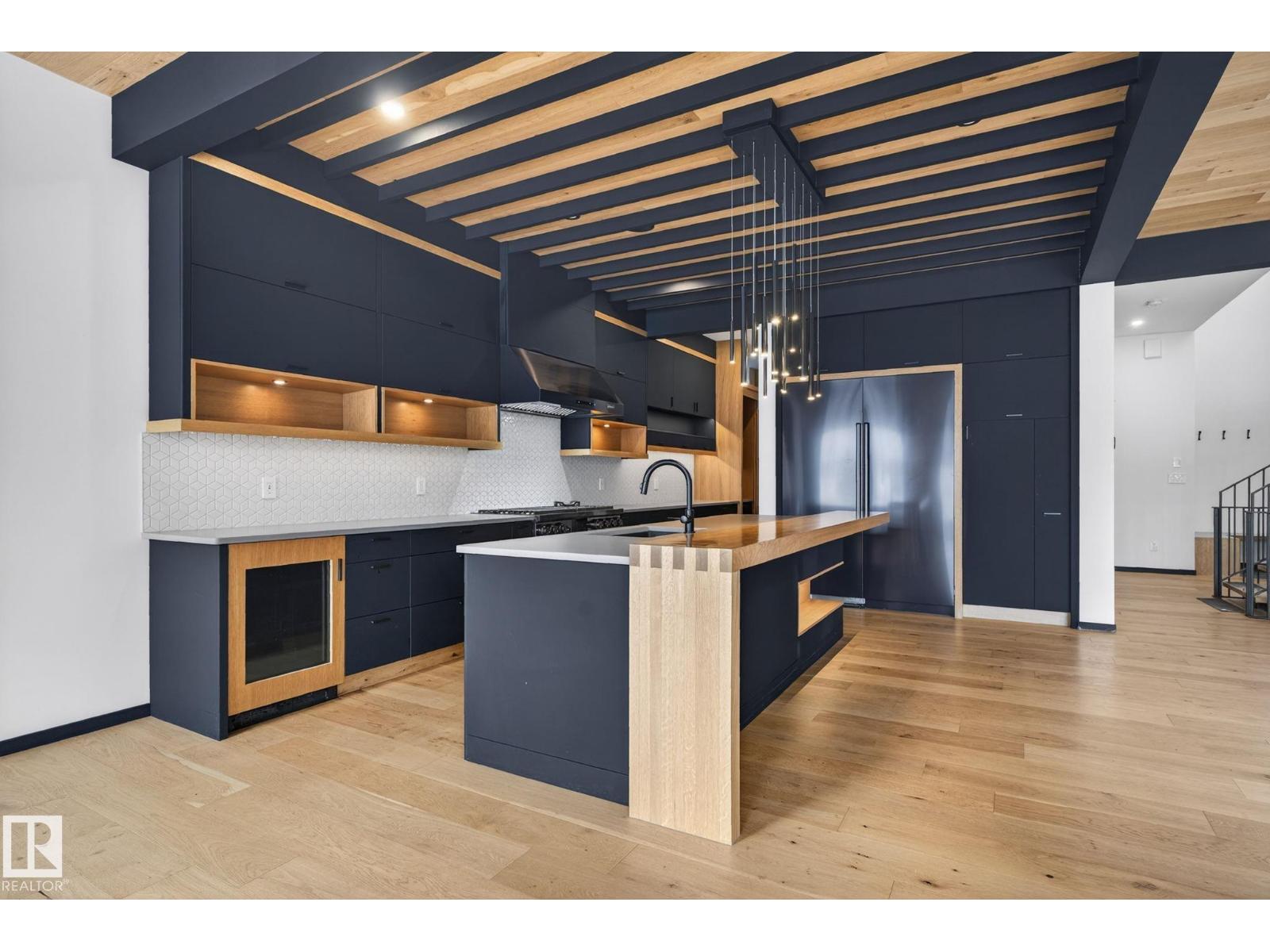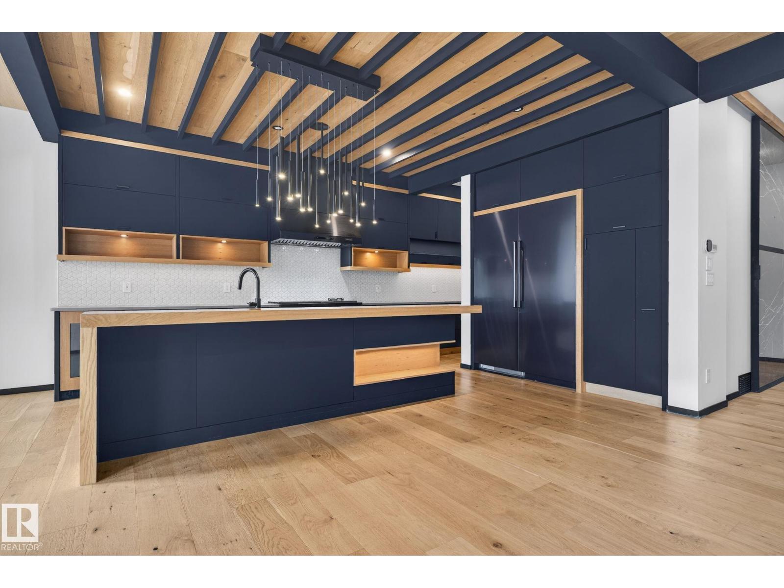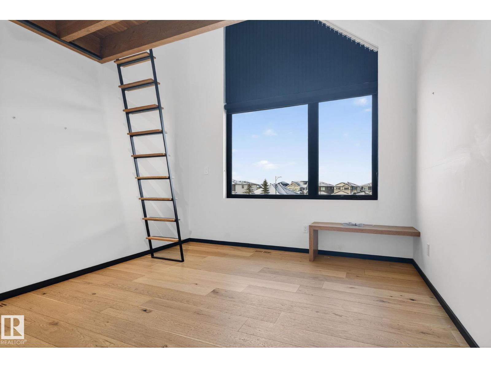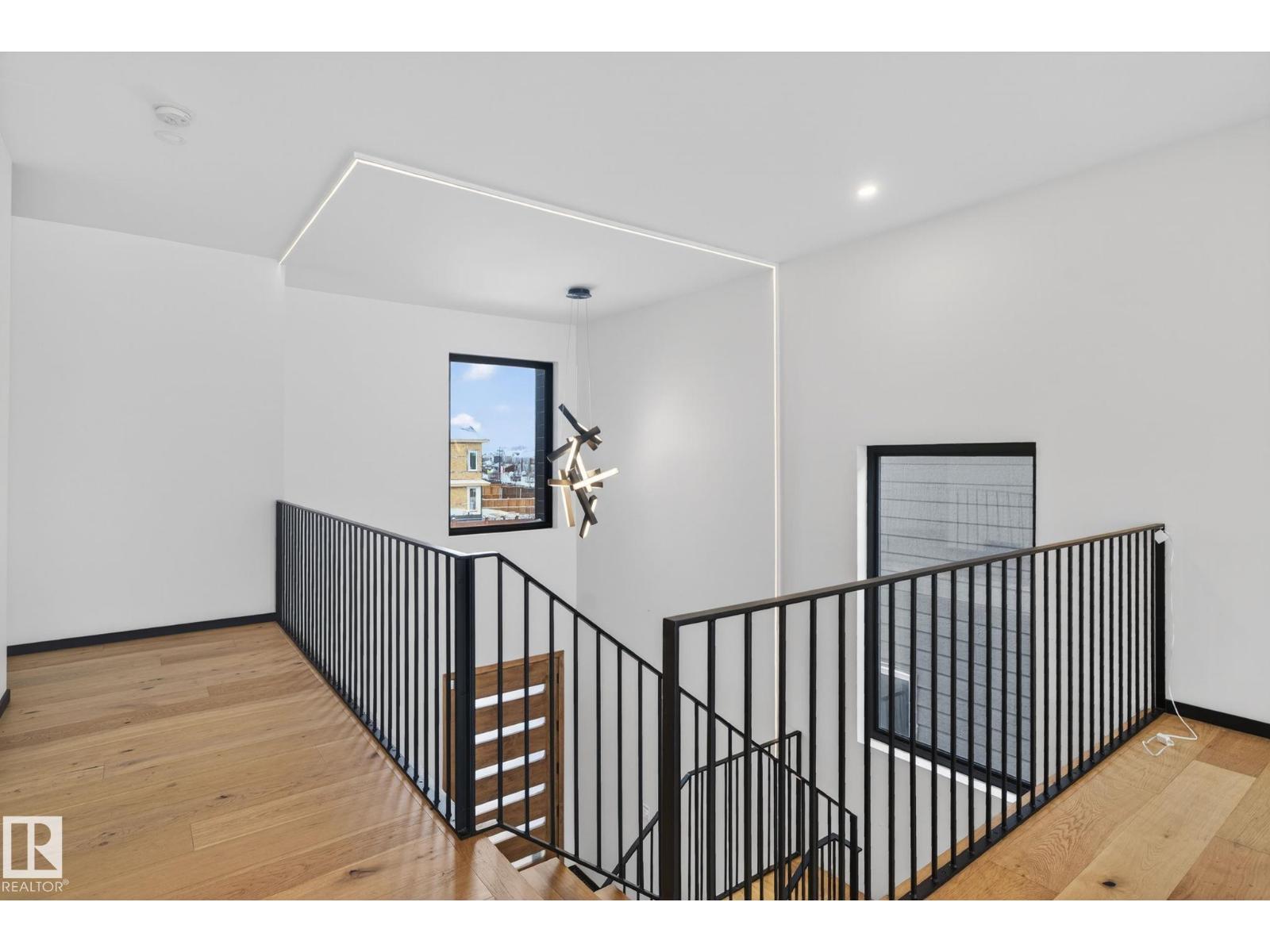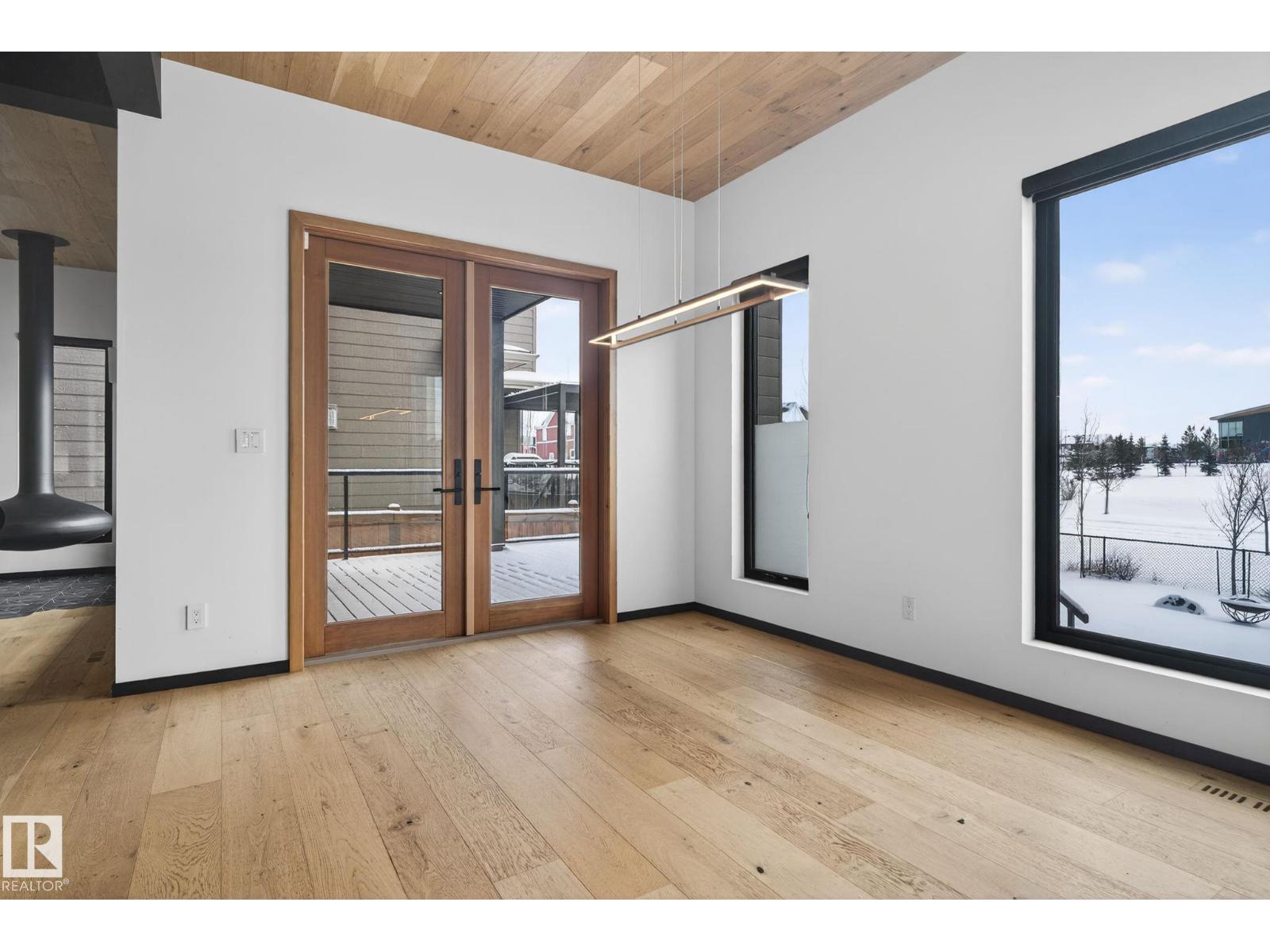 Stunning Scandinavian-inspired former showhome backing onto greenspace and Father Leduc School Park. This architectural masterpiece offers over 3,400 sq ft of luxury with a custom marble sliding door, handcrafted iron railings, warm wood ceilings, and massive black-framed windows that fill the home with natural light. The kitchen impresses with over $50,000 in Dacor appliances, custom cabinetry, and refined design. Upstairs features 4 bedrooms including a unique loft bedroom and a peaceful primary suite. The fully finished basement includes a theatre room, fitness room, lounge space and 9' ceilings. Outside, two elevated decks capture the west-facing backyard’s evening sun and peaceful greenspace views, while the east-facing front brings warm morning light. Additional features include A/C, HEPA/UV air purification, floating ethanol fireplace, smart-home controls, and a heated polished garage. A rare luxury offering in Edgewater Estates. (id:63190)