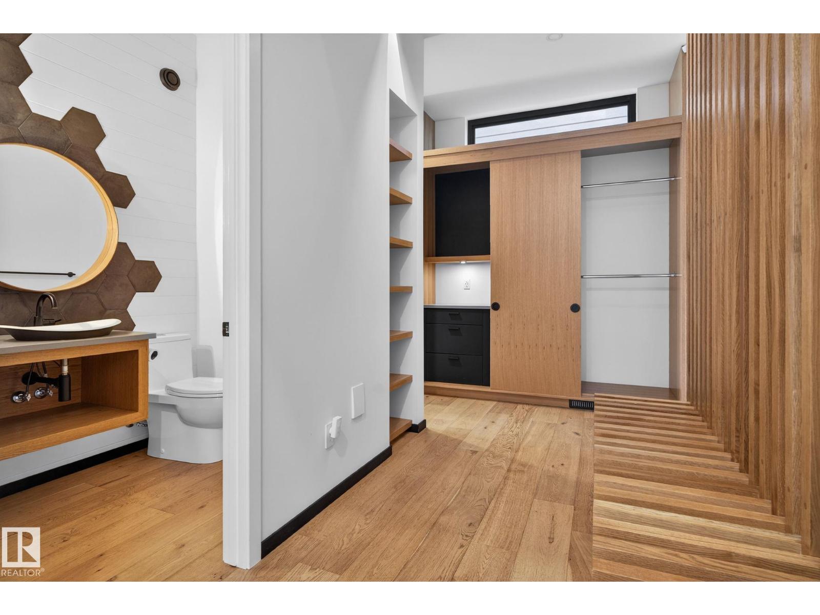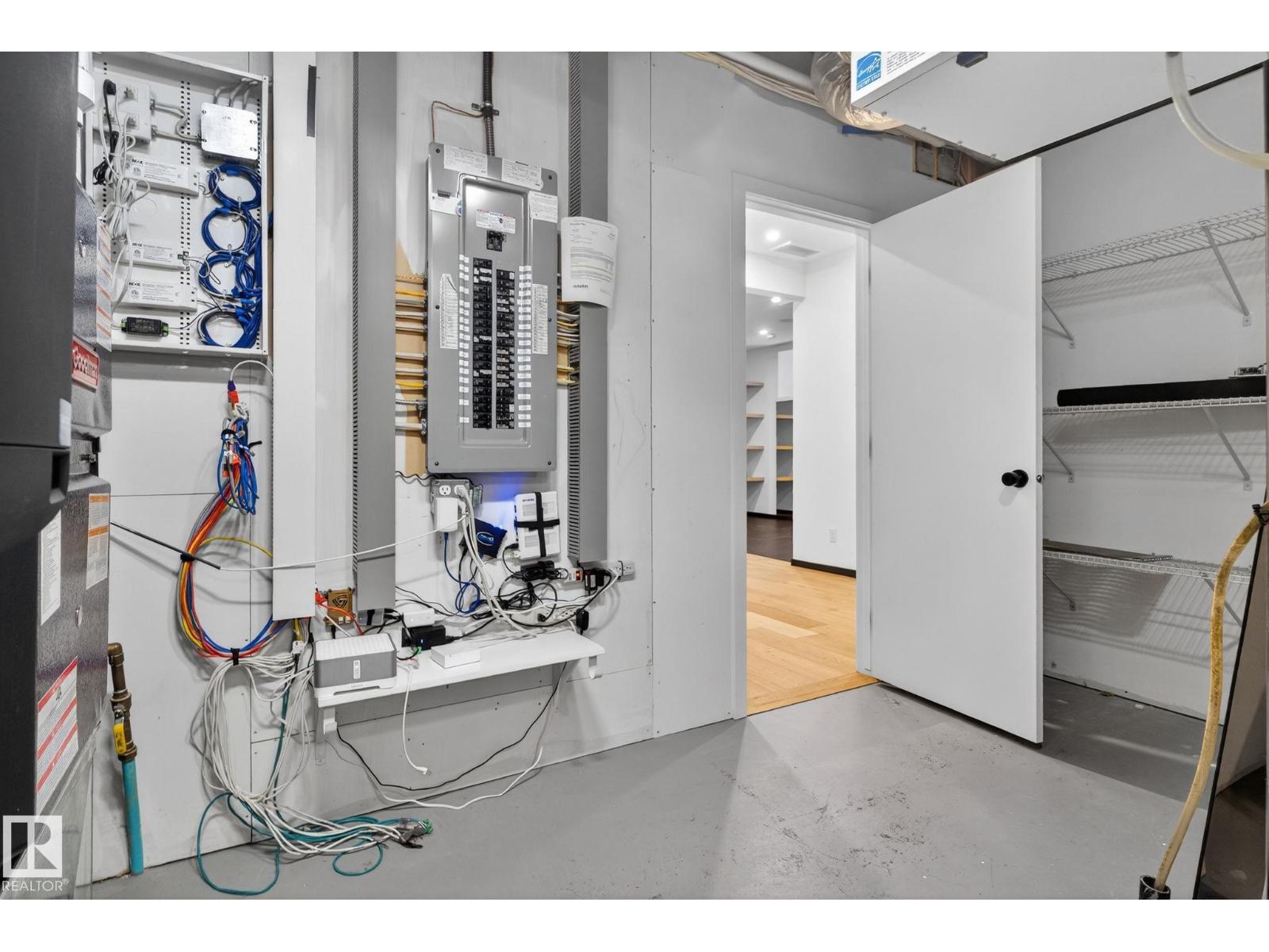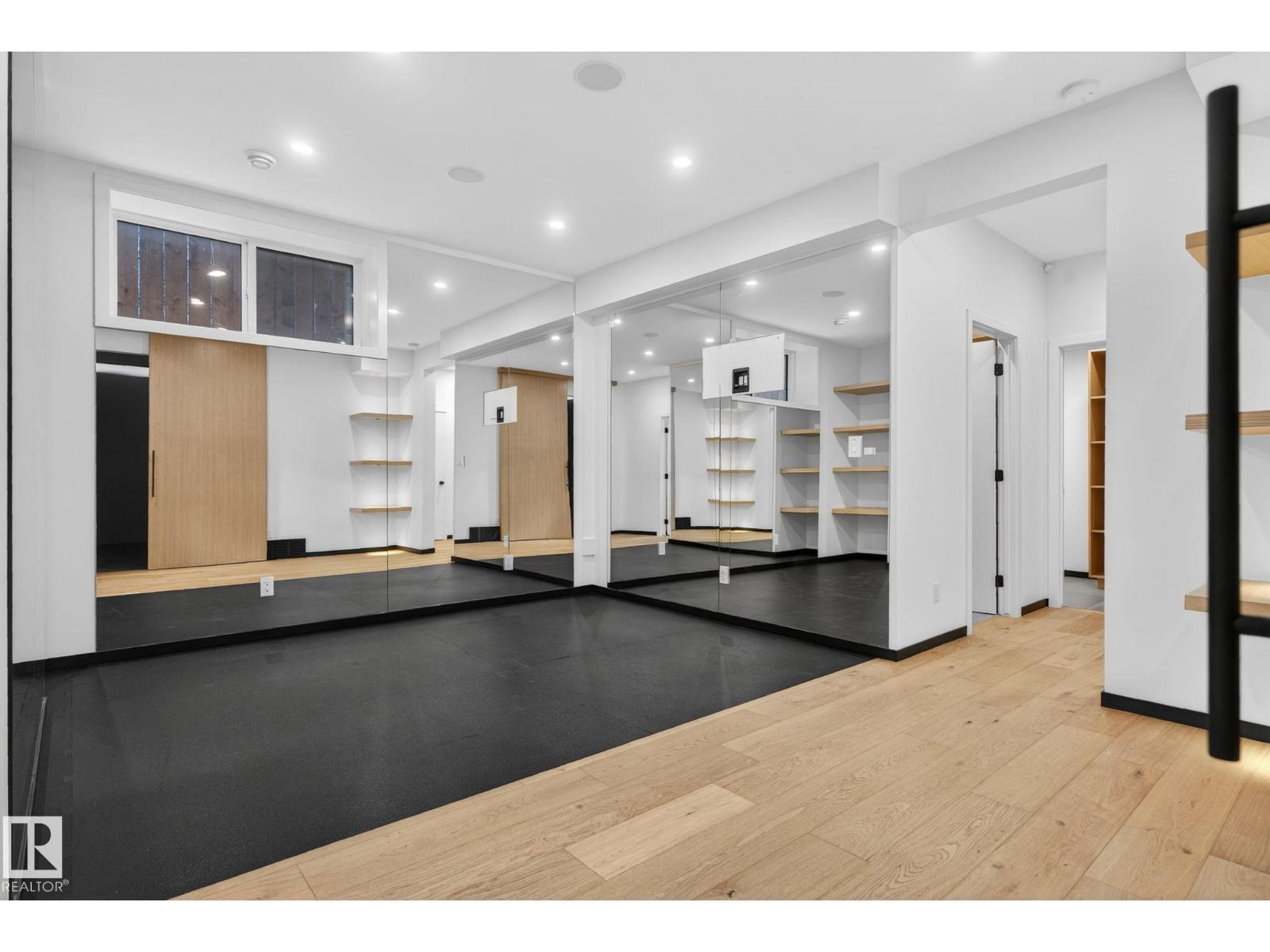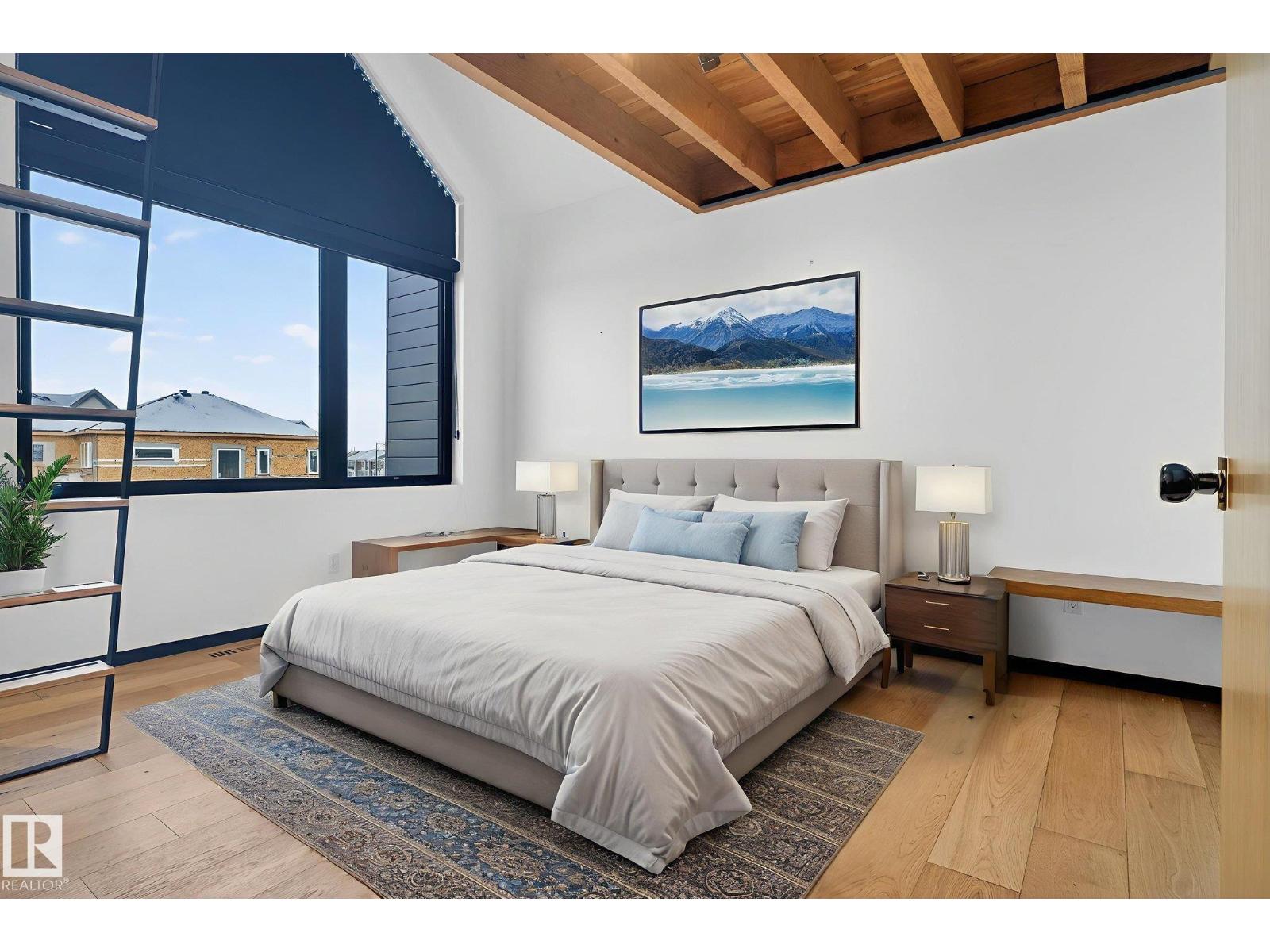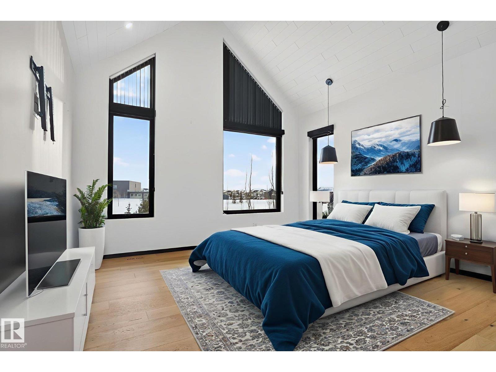Stunning Scandinavian-inspired former showhome backing onto greenspace and Father Leduc School Park. This architectural masterpiece offers over 3,400 sq ft of luxury with a custom marble sliding door, handcrafted iron railings, warm wood ceilings, and massive black-framed windows that fill the home with natural light. The kitchen impresses with over $50,000 in Dacor appliances, custom cabinetry, and refined design. Upstairs features 4 bedrooms including a unique loft bedroom and a peaceful primary suite. The fully finished basement includes a theatre room, fitness room, lounge space and 9' ceilings. Outside, two elevated decks capture the west-facing backyard’s evening sun and peaceful greenspace views, while the east-facing front brings warm morning light. Additional features include A/C, HEPA/UV air purification, floating ethanol fireplace, smart-home controls, and a heated polished garage. A rare luxury offering in Edgewater Estates. (id:63190)