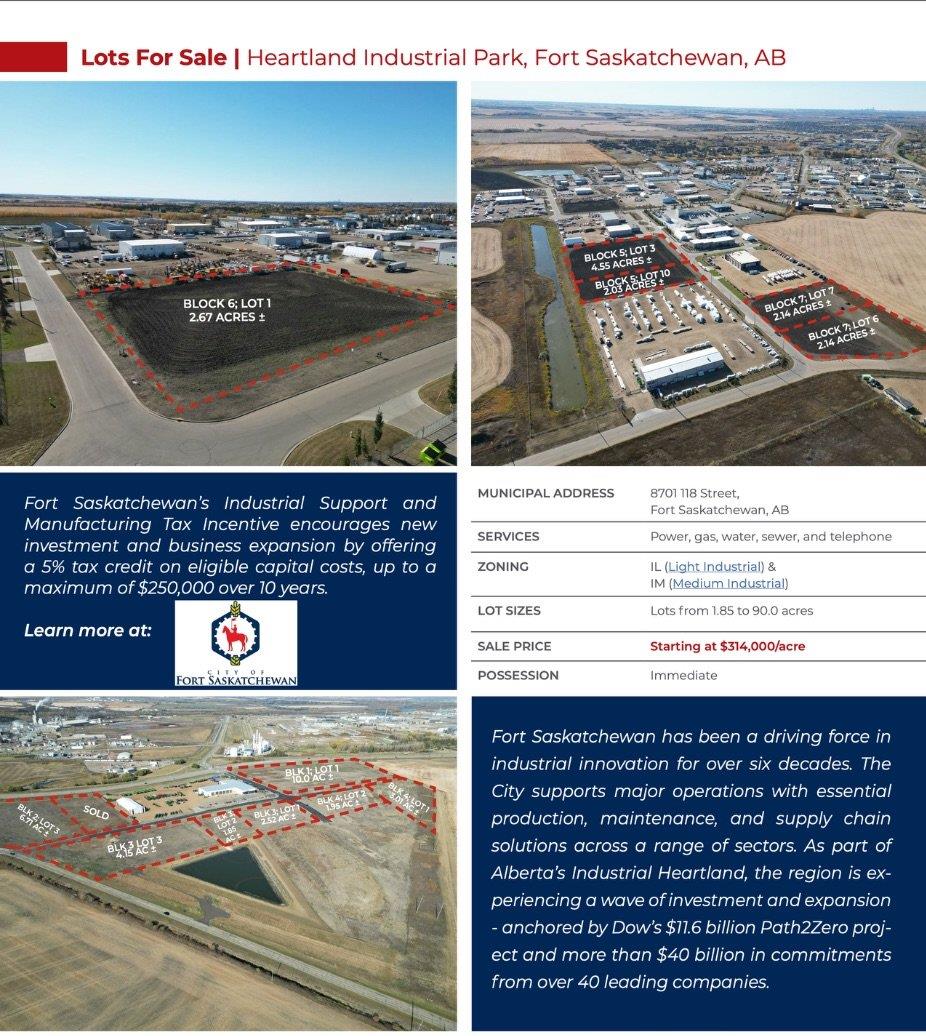 Industrial lots for saleBuild to suit opportunities availableStrategically located in Alberta’s Industrial HeartlandHigh visibility along Highway 15 with traffic at an average of 52,000 vpdTax incentives available (id:63190)