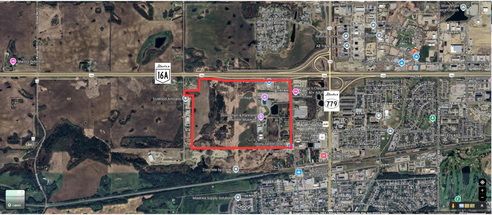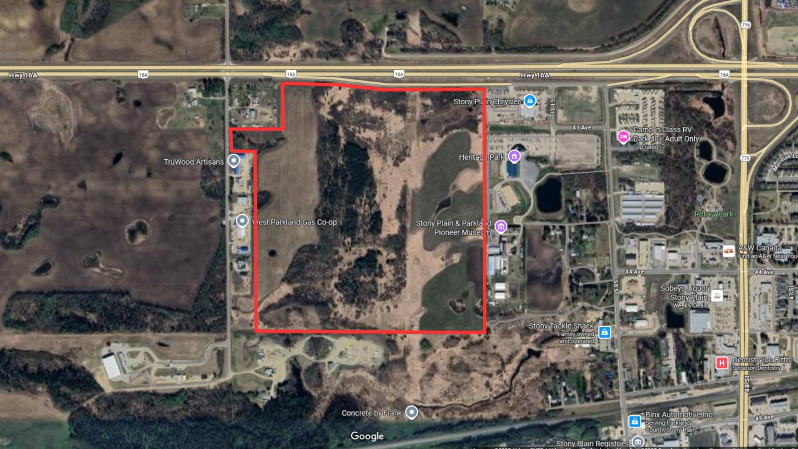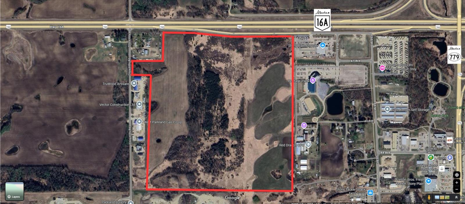 Prime development opportunity with this 140+/- acre parcel situated within the Town of Stony Plain, boasting approximately 2,200 feet with future access via Highway 16A and Glory Hills Road. With unparalleled visibility and exposure to over 23,000 vehicles per day on Highway 16A, an additional 11,500+ vehicles on Highway 779, this site is ideally positioned for large-scale commercial development. Zoned FD - Future Development, this land is a strategic investment for developers seeking to capitalize on Stony Plains ongoing growth. This property benefits from proximity to existing municipal services and established amenities, including Stony Plain Chrysler, Heritage Park Pavilion, and Campn Class RV Park. Notably, this site is located just west of the future Costco development, adding even more appeal and long-term value to the area. When combined with the parcel directly across Glory Hills Rd (52532 Glory Hills Rd), the two sites together would offer approximately one full mile of highway frontage (id:63190)