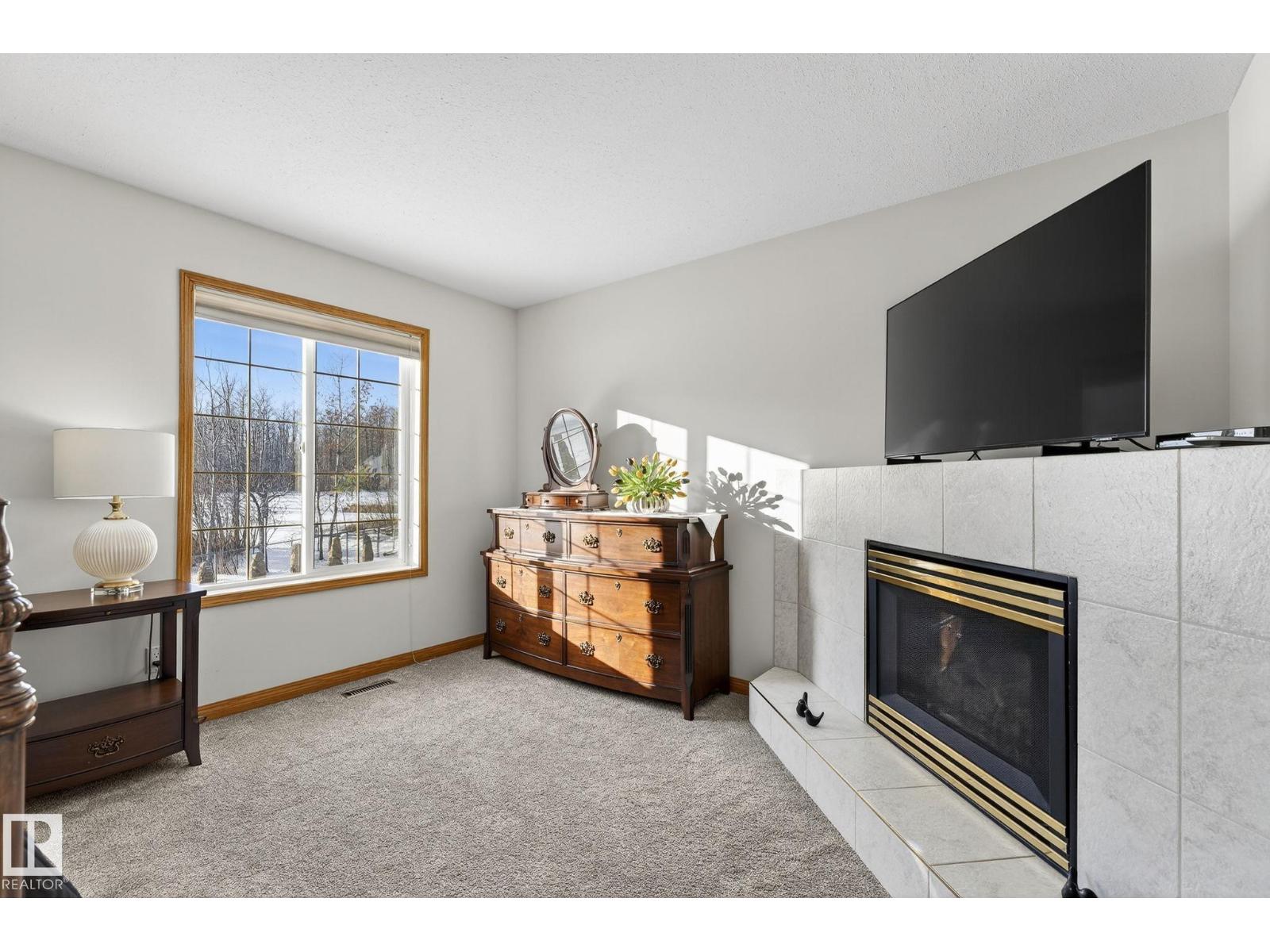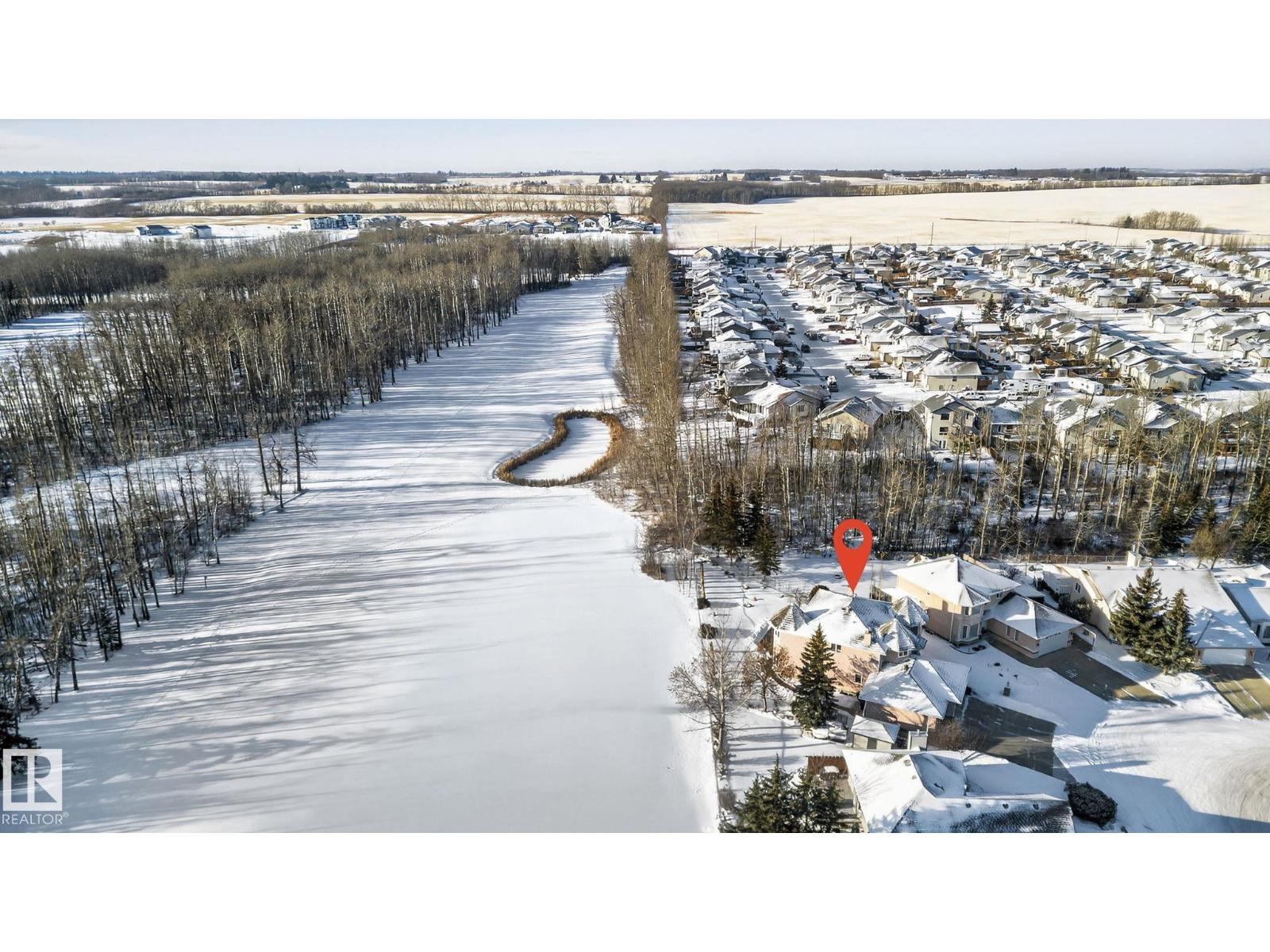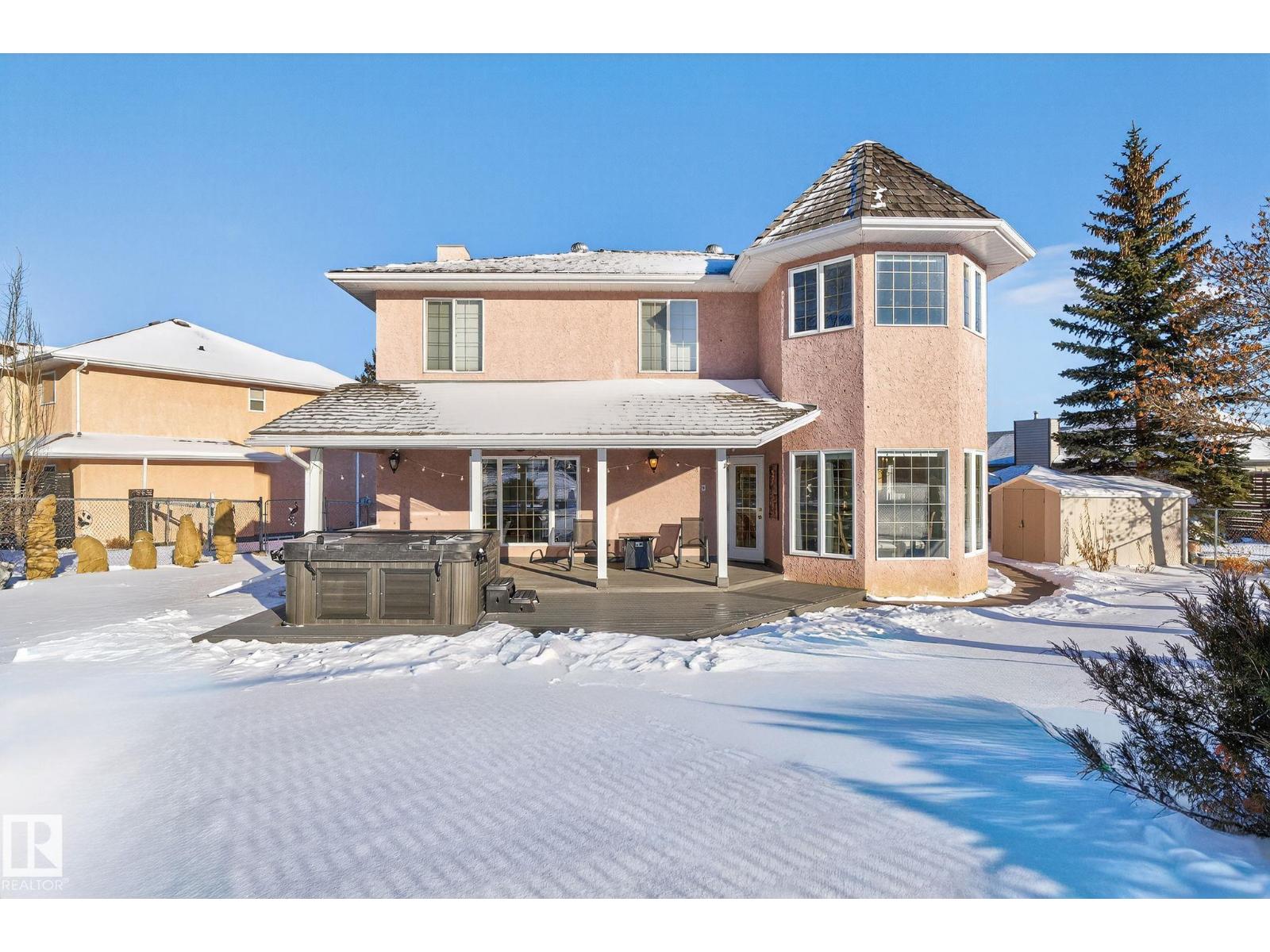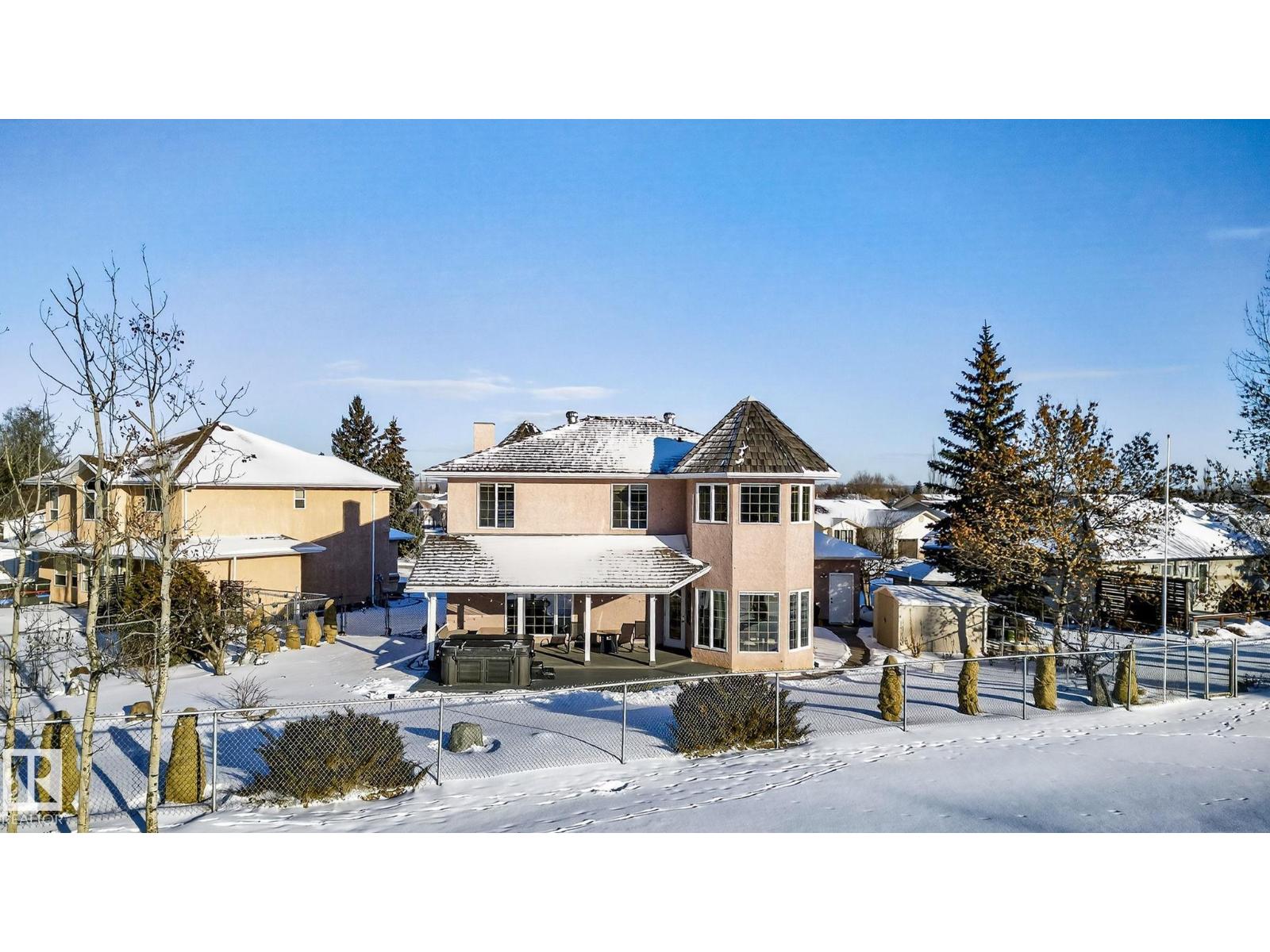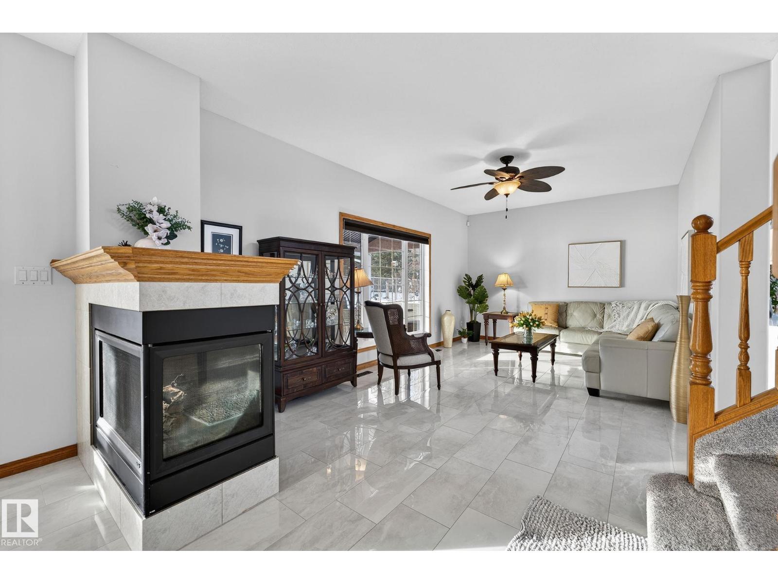This impressive 2,366 sq. ft. fully finished home offers space, comfort, and premium features throughout. Main floor attributes include soaring 2 storey ceilings, 3 sided gas fireplace & laundry room. Upstairs there are 3 generously sized bedrooms, including a massive primary retreat complete with a gas fireplace and large four-piece ensuite (in floor heat). The fully developed basement is enhanced with in-floor heating for year-round comfort. Recent updates include new gas stove, fresh paint, brand-new carpet and ceramic tile flooring, adding a fresh, modern feel. Central air conditioning and two furnaces ensure efficient climate control on every level. Situated on nearly a quarter-acre lot backing directly onto a golf course, the beautifully landscaped backyard is a private oasis. The heated triple-car garage provides ample room for vehicles and storage. Enjoy outdoor living on the new maintenance-free deck with hot tub included—perfect for relaxing or entertaining while taking in the serene views. (id:63190)