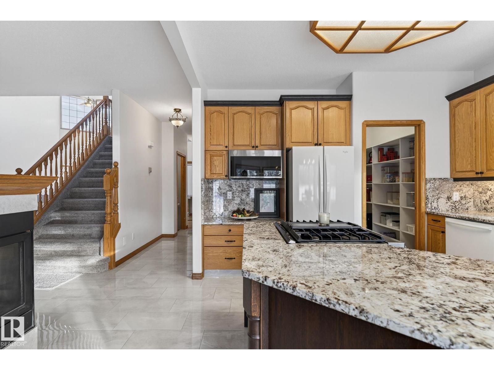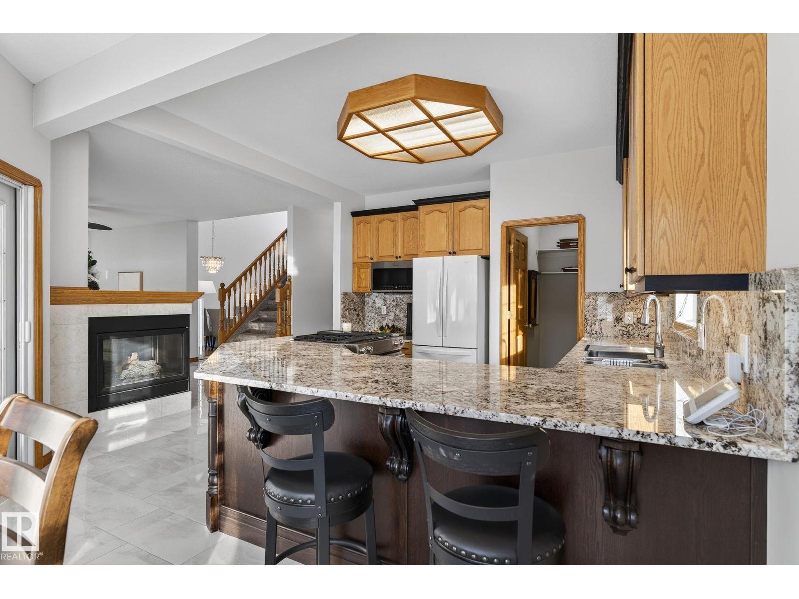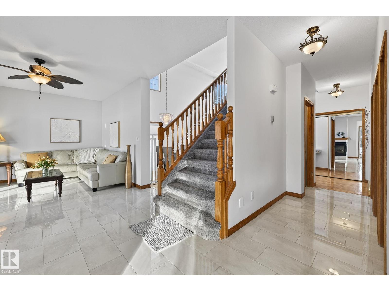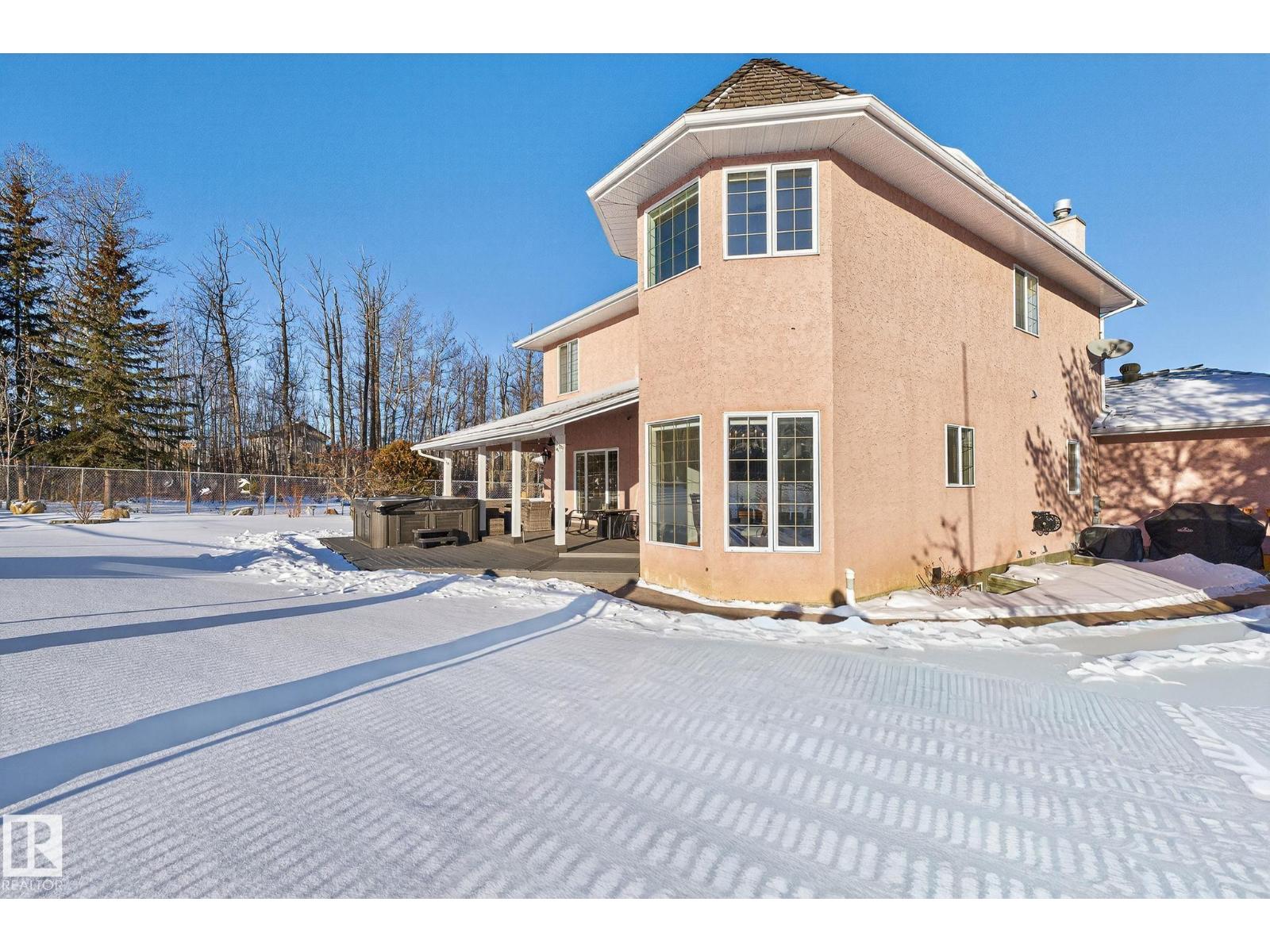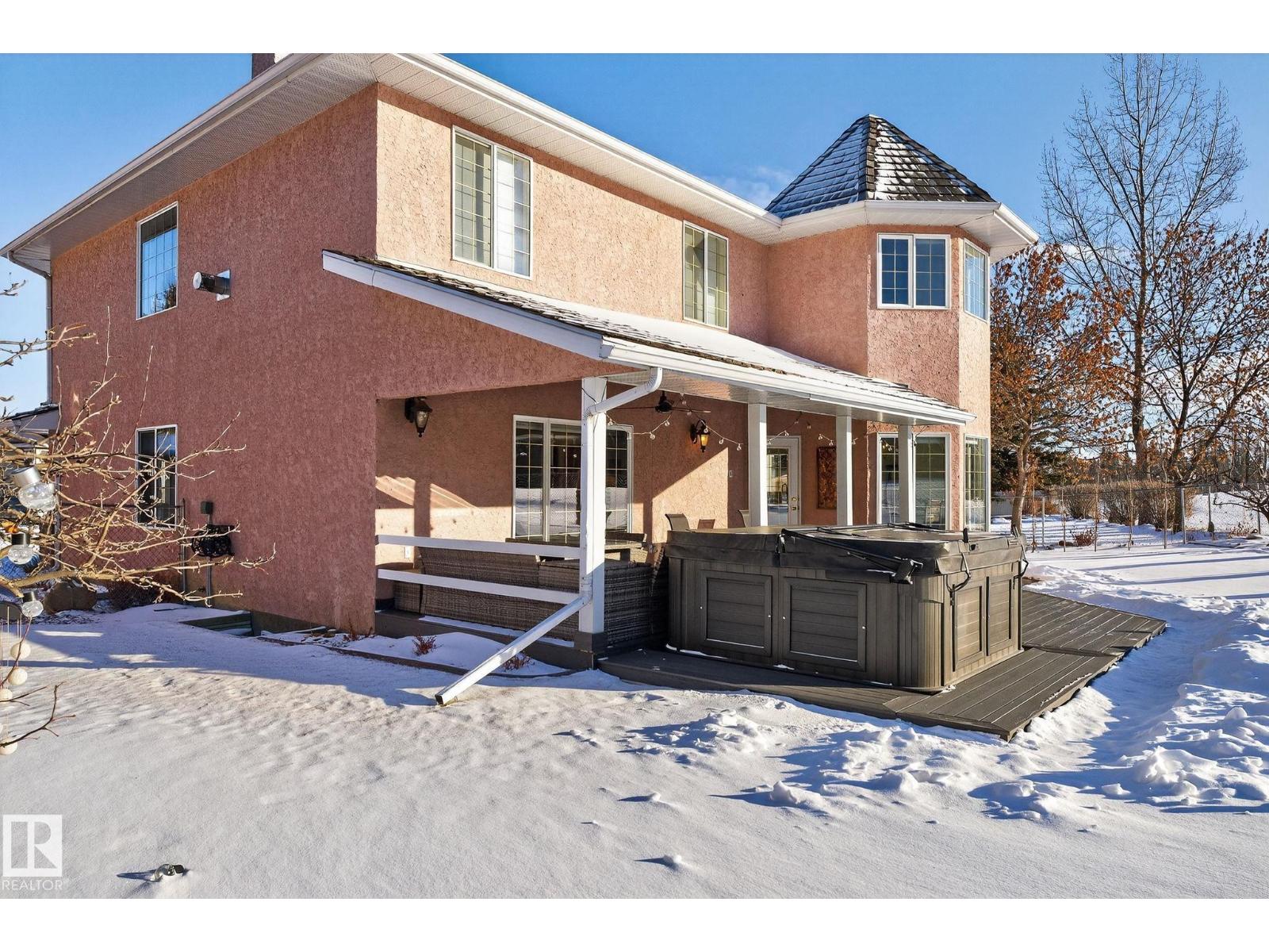 This impressive 2,366 sq. ft. fully finished home offers space, comfort, and premium features throughout. Main floor attributes include soaring 2 storey ceilings, 3 sided gas fireplace & laundry room. Upstairs there are 3 generously sized bedrooms, including a massive primary retreat complete with a gas fireplace and large four-piece ensuite (in floor heat). The fully developed basement is enhanced with in-floor heating for year-round comfort. Recent updates include new gas stove, fresh paint, brand-new carpet and ceramic tile flooring, adding a fresh, modern feel. Central air conditioning and two furnaces ensure efficient climate control on every level. Situated on nearly a quarter-acre lot backing directly onto a golf course, the beautifully landscaped backyard is a private oasis. The heated triple-car garage provides ample room for vehicles and storage. Enjoy outdoor living on the new maintenance-free deck with hot tub included—perfect for relaxing or entertaining while taking in the serene views. (id:63190)
