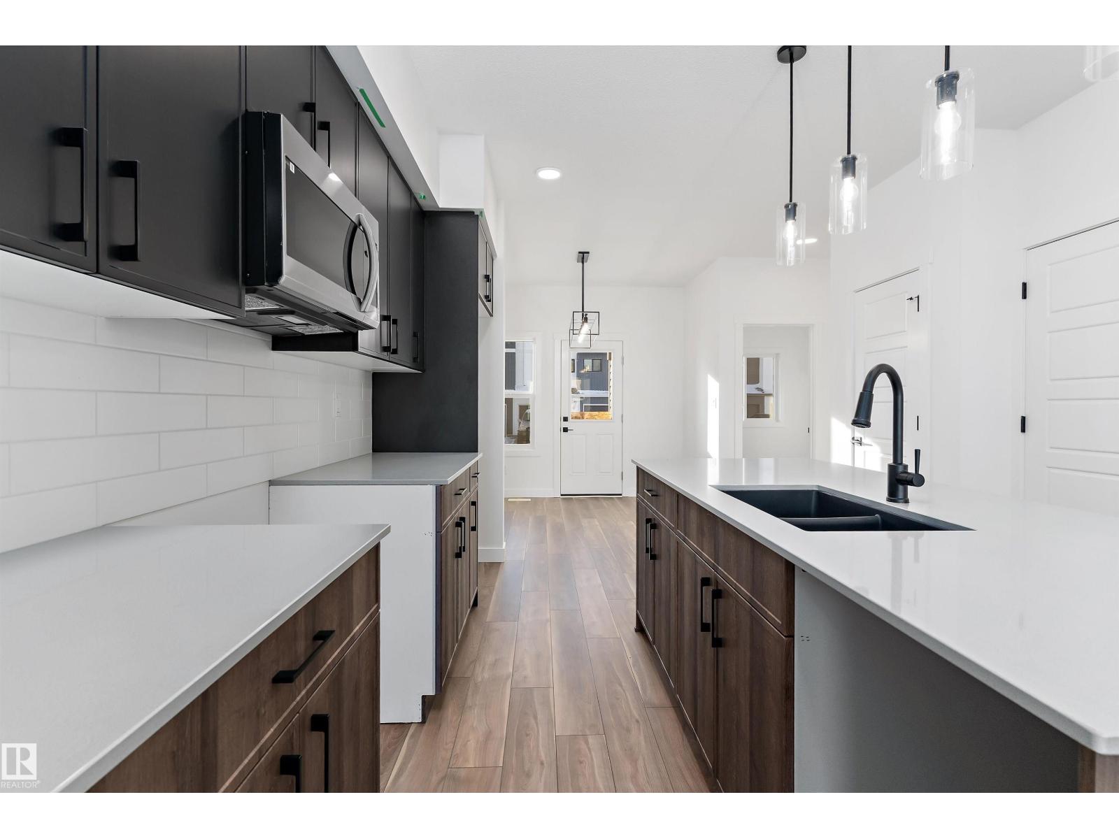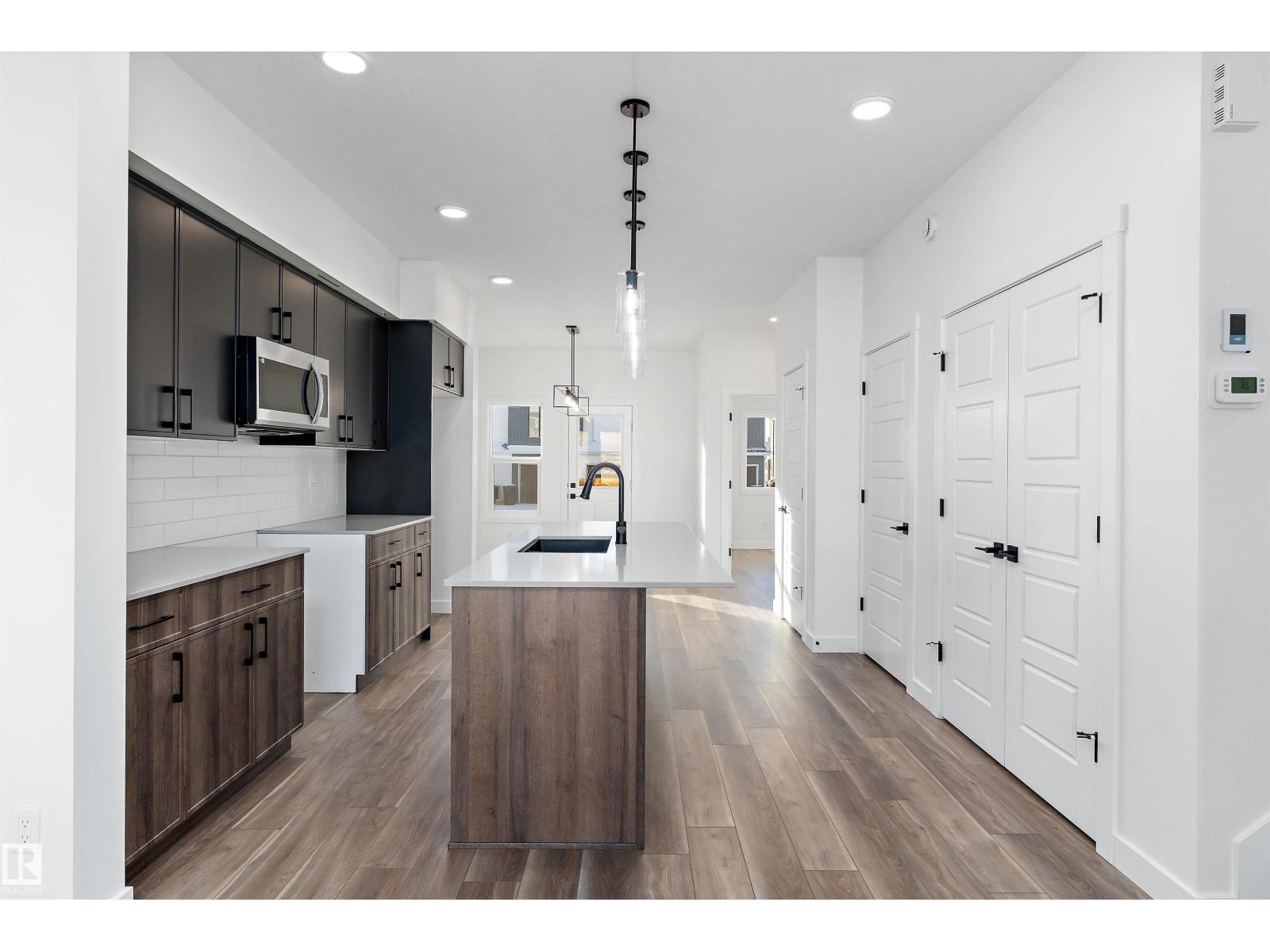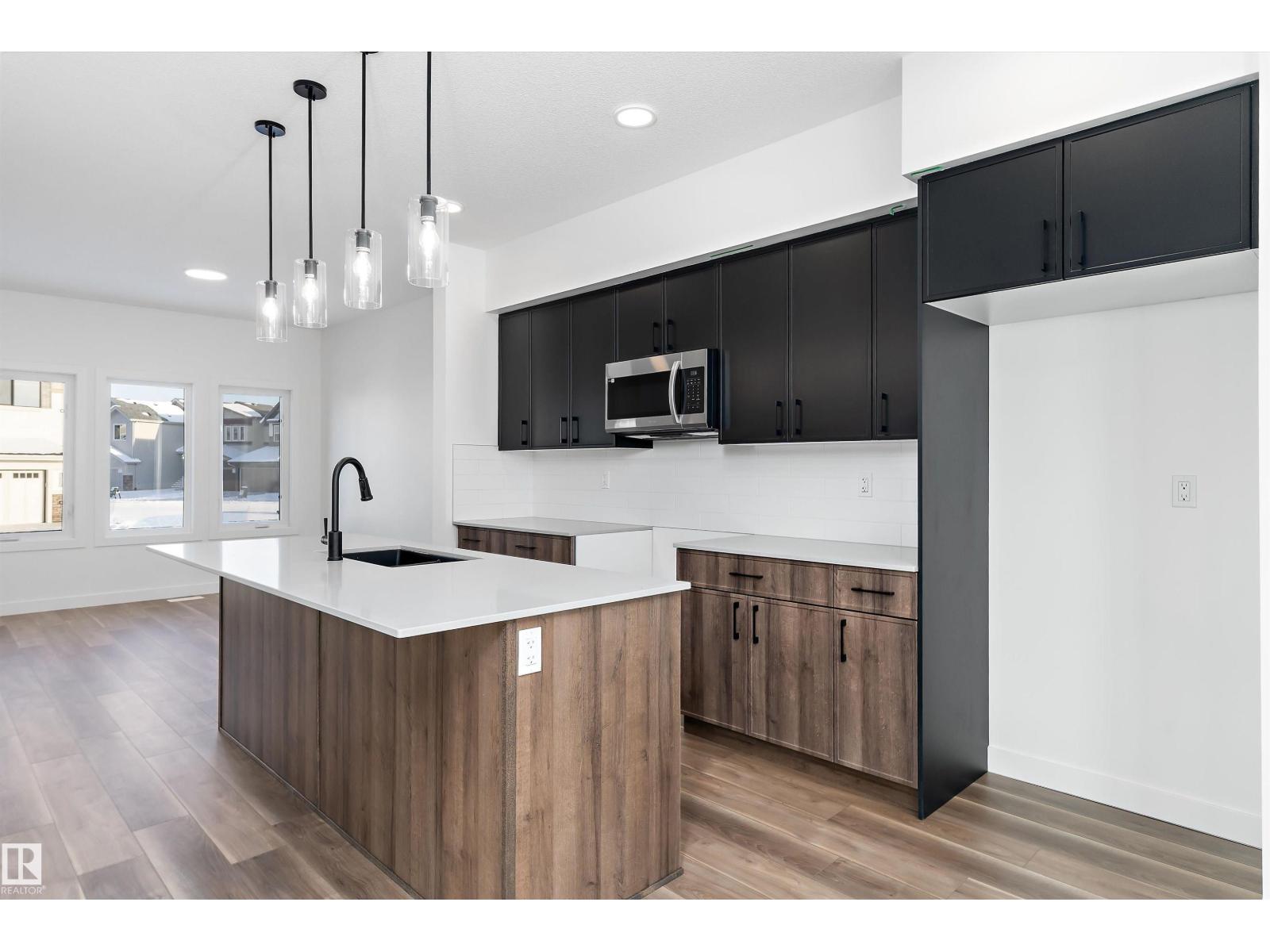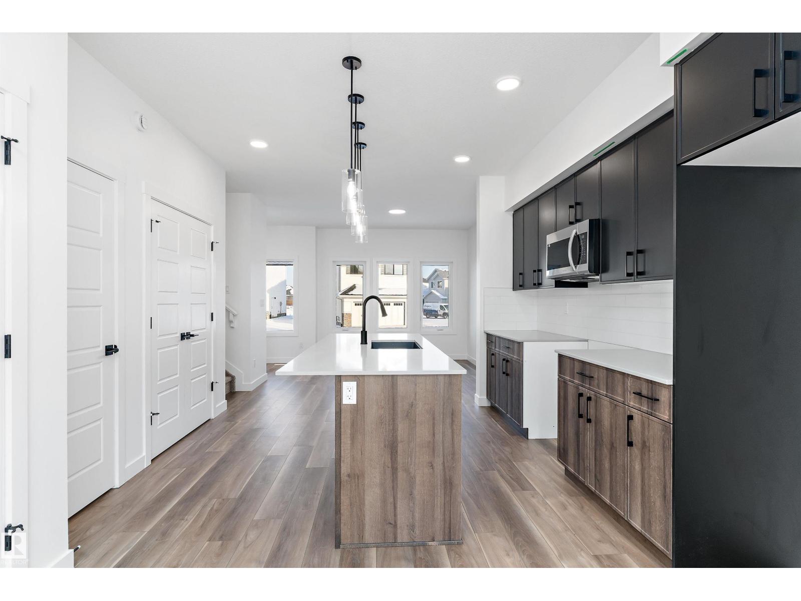 Discover the Sylvan by Sterling Homes, a well-crafted home designed for comfort and functionality. The main floor features luxury vinyl plank flooring and a welcoming foyer with coat storage leading to a bright great room. The kitchen offers quartz countertops, an island with flush eating ledge, Silgranit undermount sink, pendant lighting, over-the-range microwave, soft-close cabinetry with upgraded door profiles, and a pantry tucked near the stairs. At the rear, the sunlit nook overlooks the backyard and sits beside a main-floor bedroom and 3-piece bath with stand-up shower, with a garden door to the outdoors. Upstairs includes a primary suite with walk-in closet and 4-piece ensuite with tub/shower combo, two additional bedrooms, a full bath, and a laundry closet. 9’ ceilings on main and basement levels, a separate side entrance, black plumbing and lighting fixtures, basement rough-in plumbing, and a parking pad with option for a detached double garage complete this home. (id:63190)