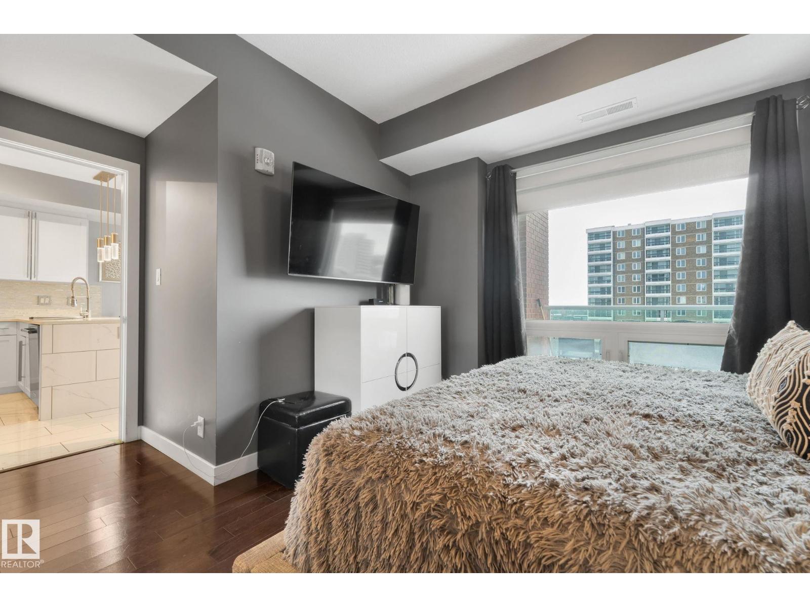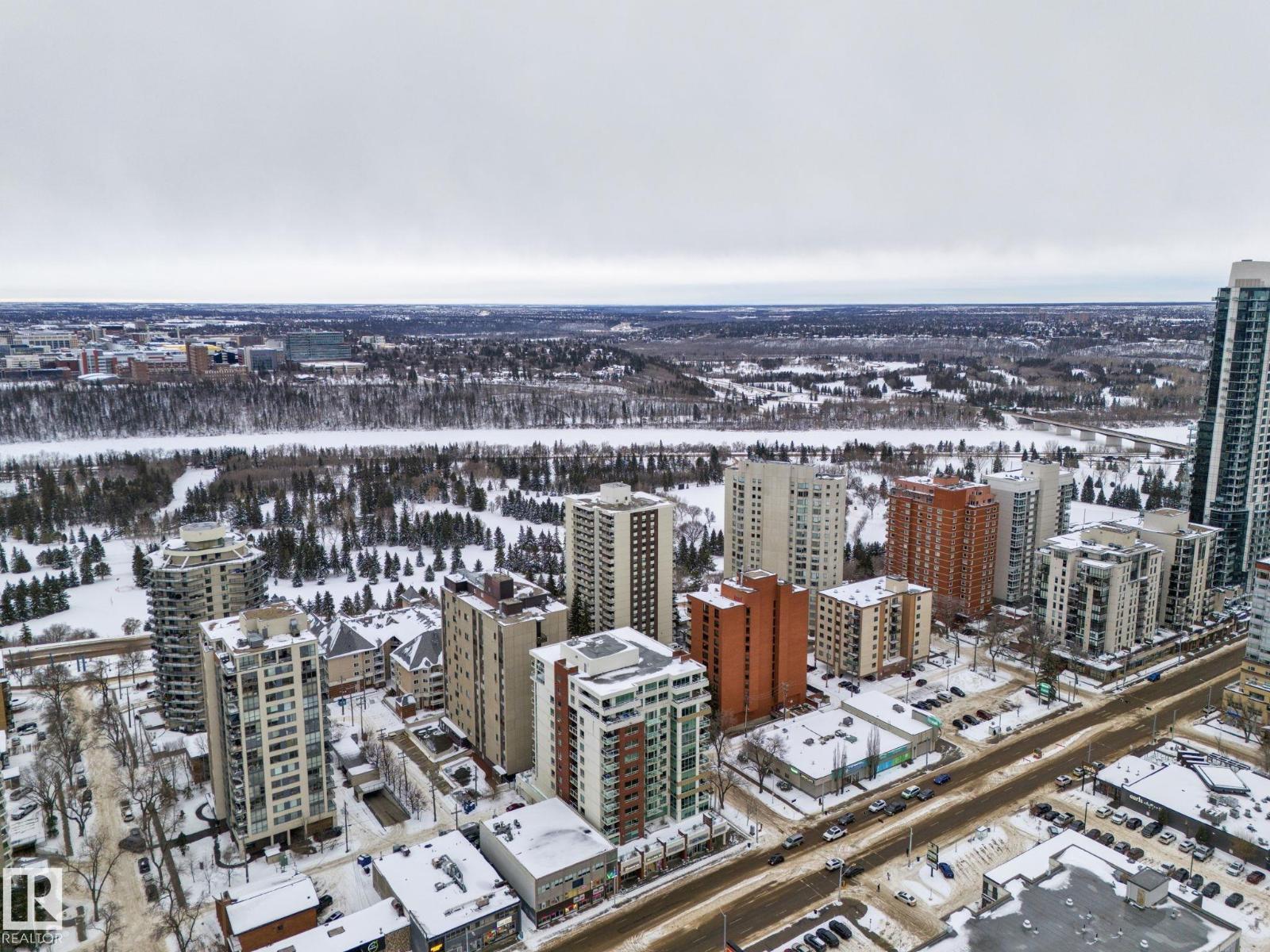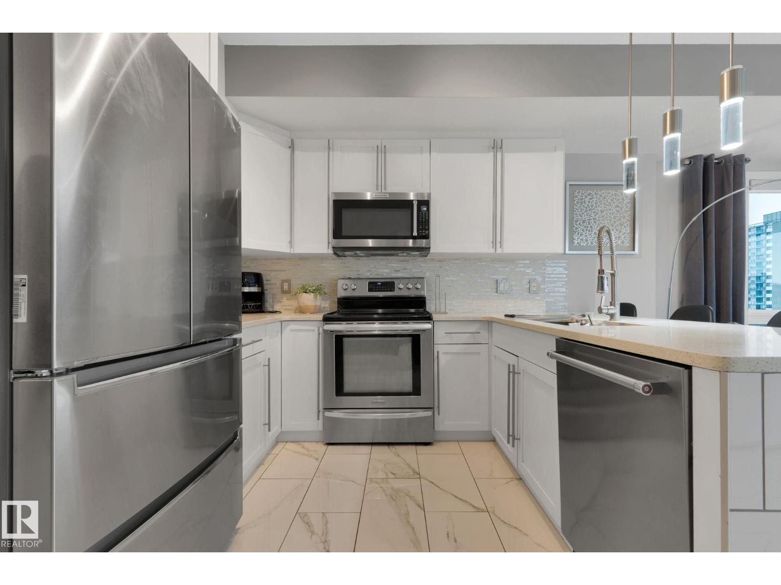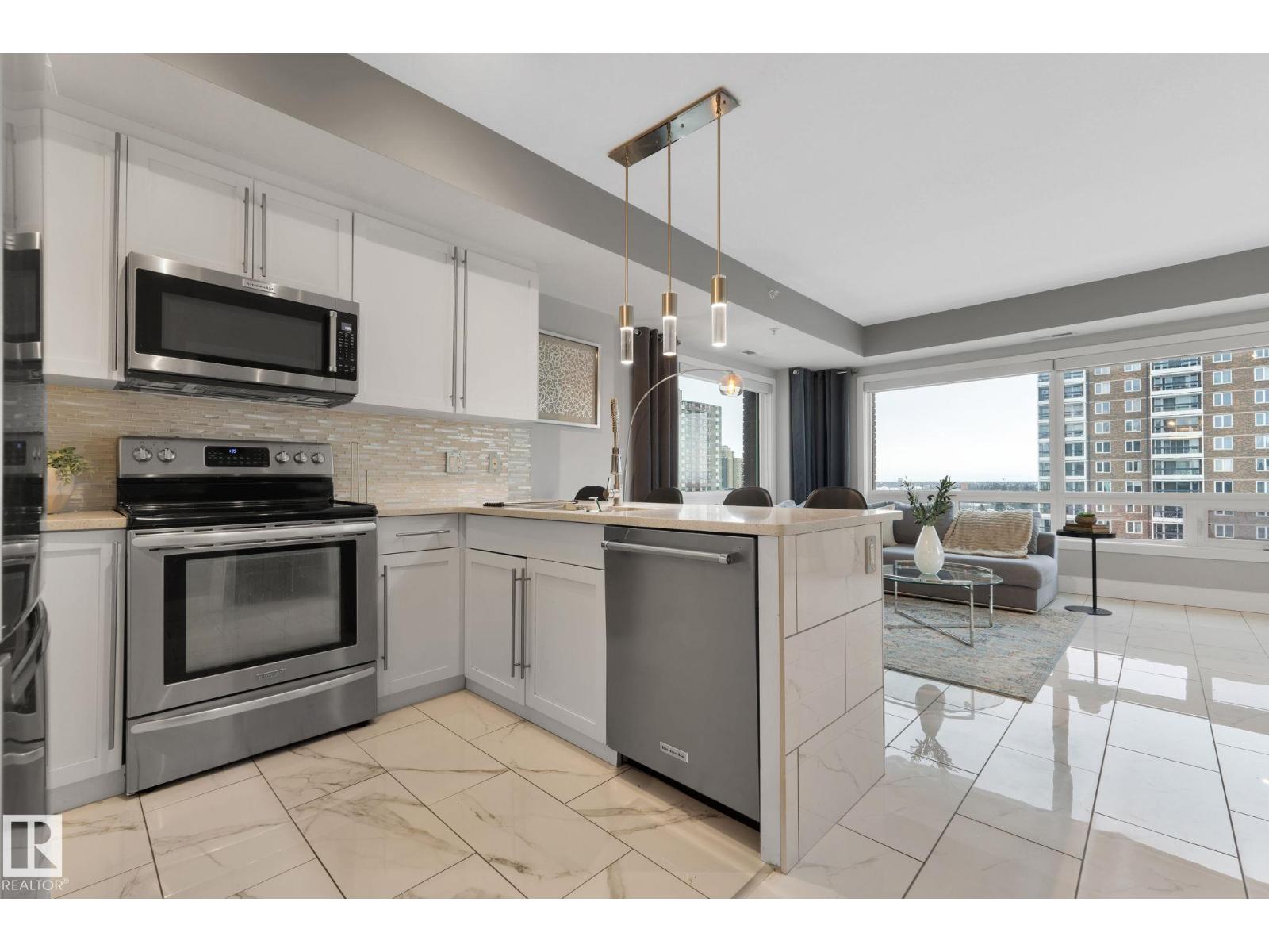 RENOVATED, MODERN condo on the 9 th floor w/ AMAZING VIEWS of Downtown North, East & West. A GENEROUS entryway welcomes you into a CHIC palette w/ 12x24 TILED floors, high profile trim, & UPDATED light & plumbing fixtures. Convenient in suite LAUNDRY room with UPGRADED front load washer/dryer. 2 bedrooms & 2 bathrooms, w/ HARDWOOD floors in each make for an ideal roommate or a work from home scenario. Cook in U-SHAPED, BRIGHT WHITE kitchen featuring STAINLESS appliances, QUARTZ countertops & custom tiled backsplash. The OPEN living room, has LARGE WINDOWS allowing NATURAL LIGHT to flood in. The living area opens onto the COVERED BALCONY w/ a NATURAL GAS hose bib, perfect for a evening BBQs and entertaining. RELAX in the Primary suite w/ a 3 piece ENSUITE w/ GLASS SHOWER. RARE! 2 side by side HEATED, UNDERGROUND parking stalls to keep your cars cozy! A quick LRT trip to the U of A! Located within WALKING distance to restaurants, shopping, parks and trails in the River Valley! (id:63190)