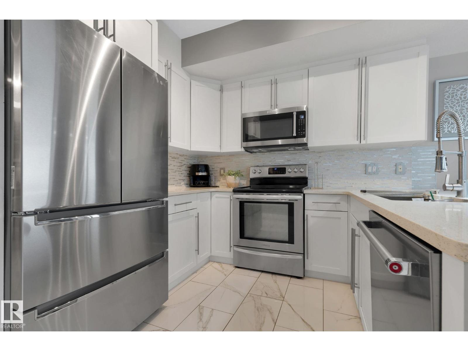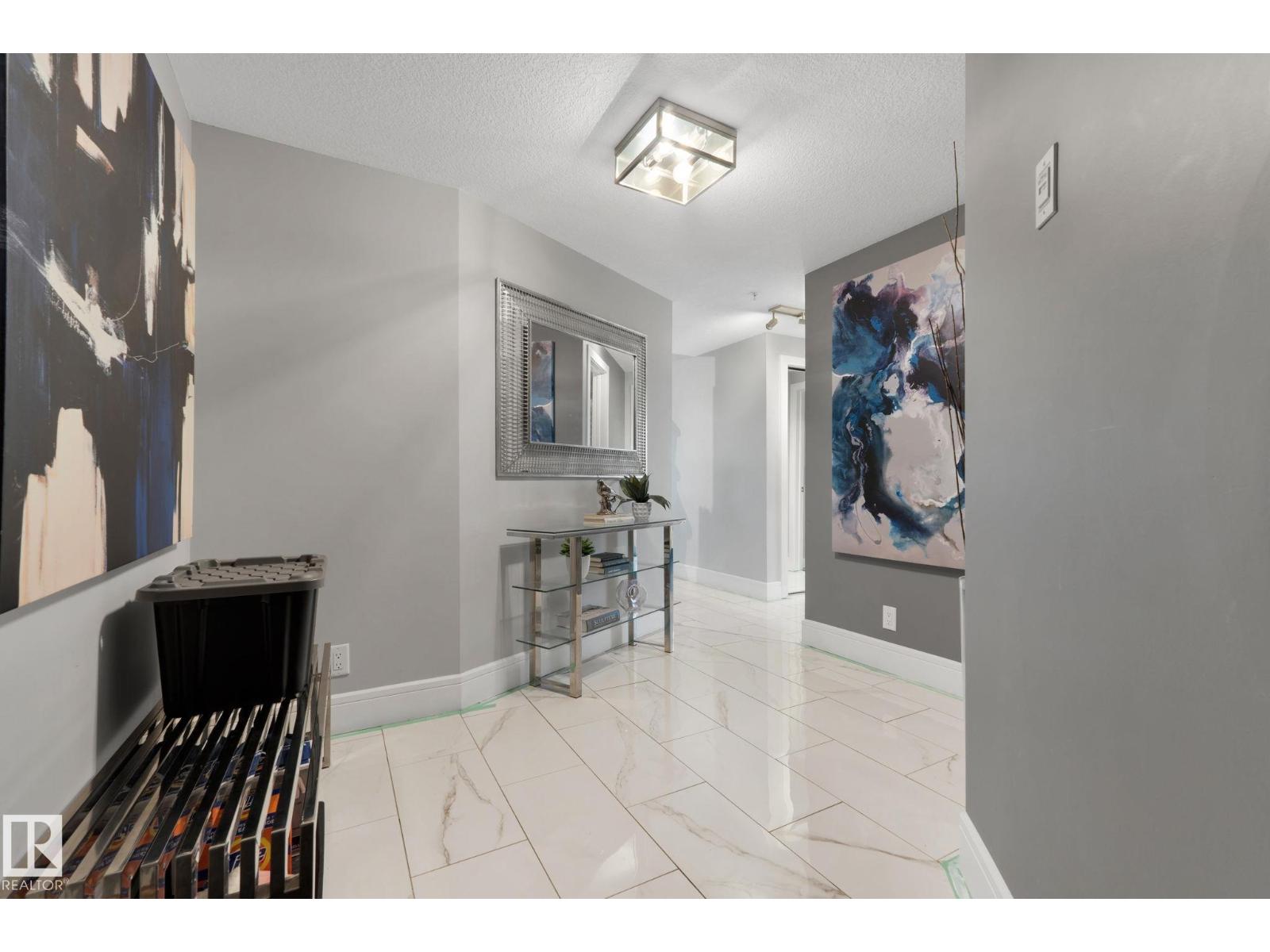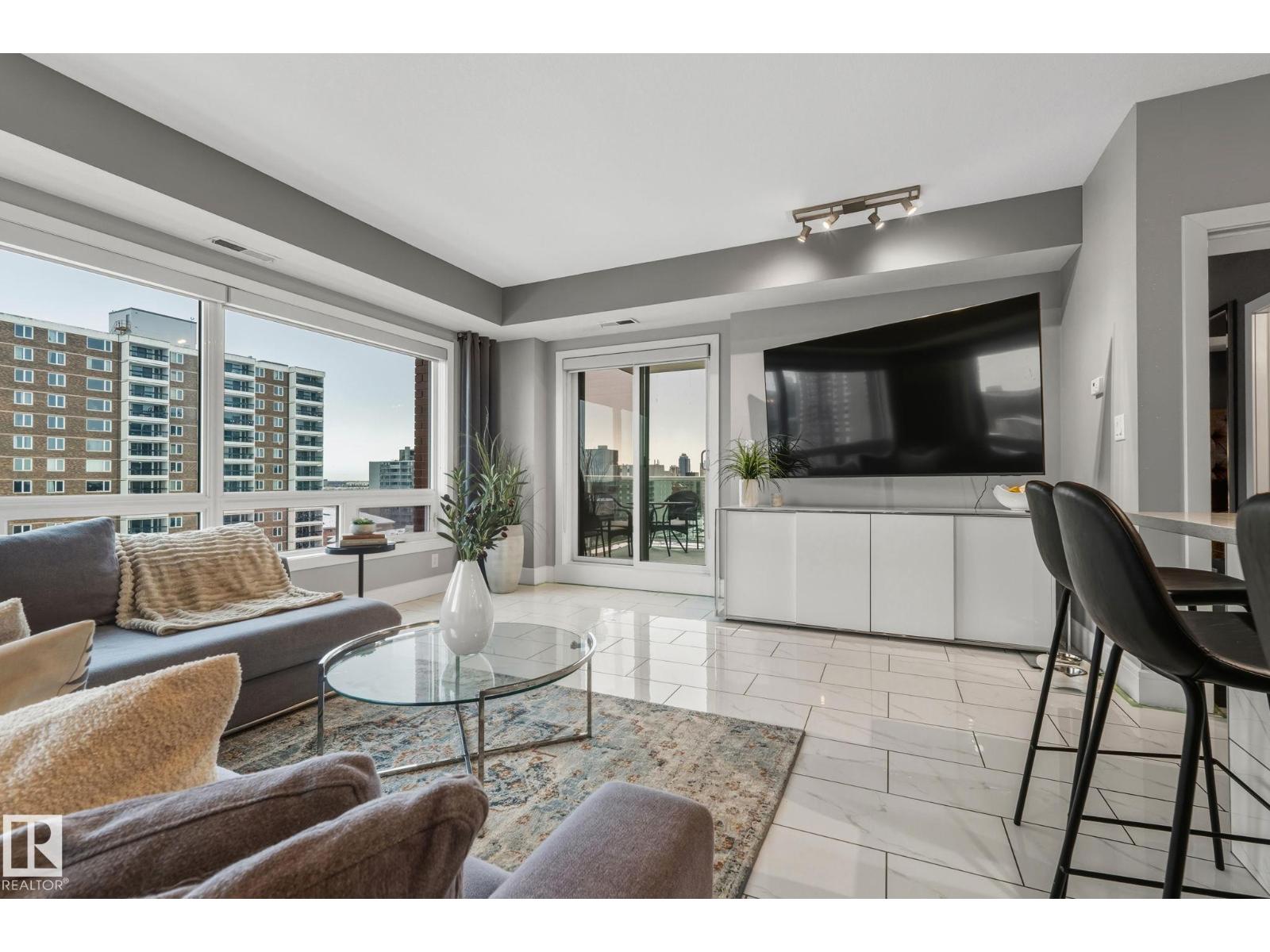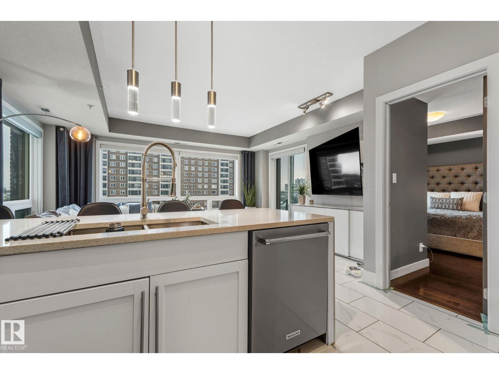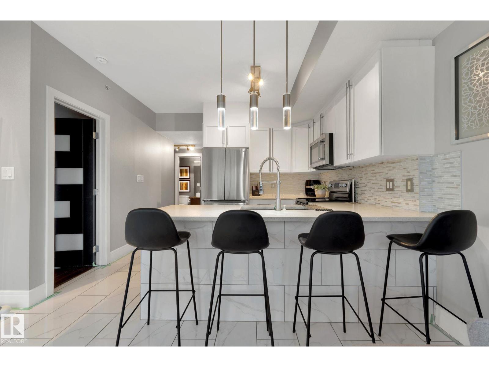RENOVATED, MODERN condo on the 9 th floor w/ AMAZING VIEWS of Downtown North, East & West. A GENEROUS entryway welcomes you into a CHIC palette w/ 12x24 TILED floors, high profile trim, & UPDATED light & plumbing fixtures. Convenient in suite LAUNDRY room with UPGRADED front load washer/dryer. 2 bedrooms & 2 bathrooms, w/ HARDWOOD floors in each make for an ideal roommate or a work from home scenario. Cook in U-SHAPED, BRIGHT WHITE kitchen featuring STAINLESS appliances, QUARTZ countertops & custom tiled backsplash. The OPEN living room, has LARGE WINDOWS allowing NATURAL LIGHT to flood in. The living area opens onto the COVERED BALCONY w/ a NATURAL GAS hose bib, perfect for a evening BBQs and entertaining. RELAX in the Primary suite w/ a 3 piece ENSUITE w/ GLASS SHOWER. RARE! 2 side by side HEATED, UNDERGROUND parking stalls to keep your cars cozy! A quick LRT trip to the U of A! Located within WALKING distance to restaurants, shopping, parks and trails in the River Valley! (id:63190)
