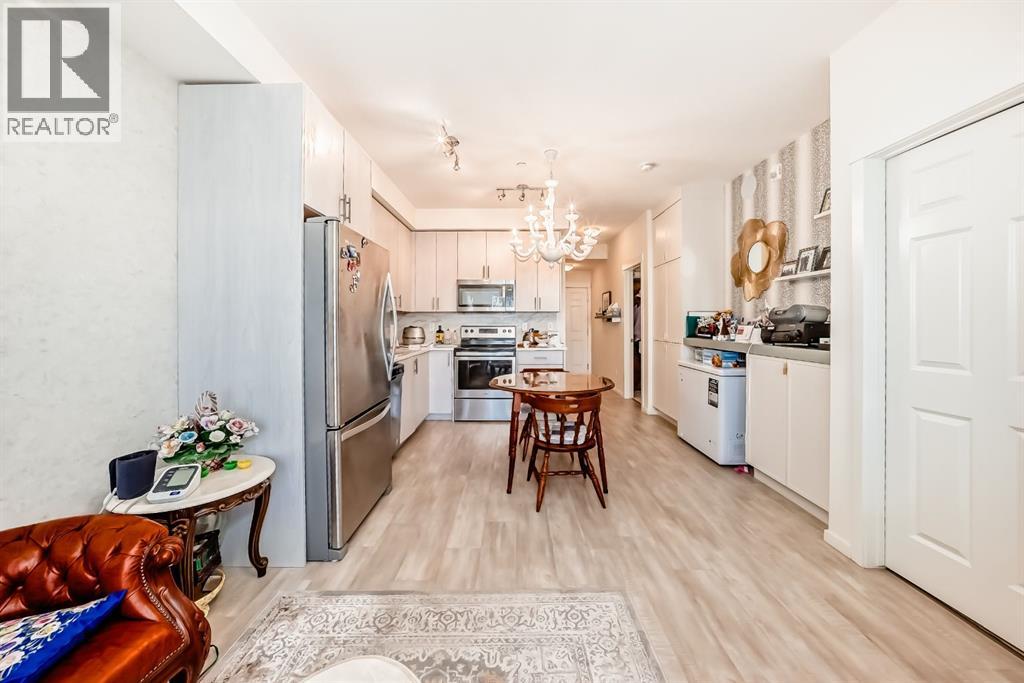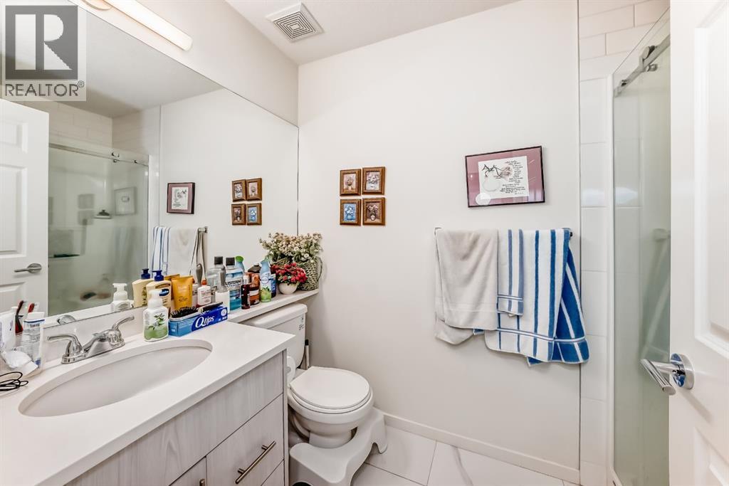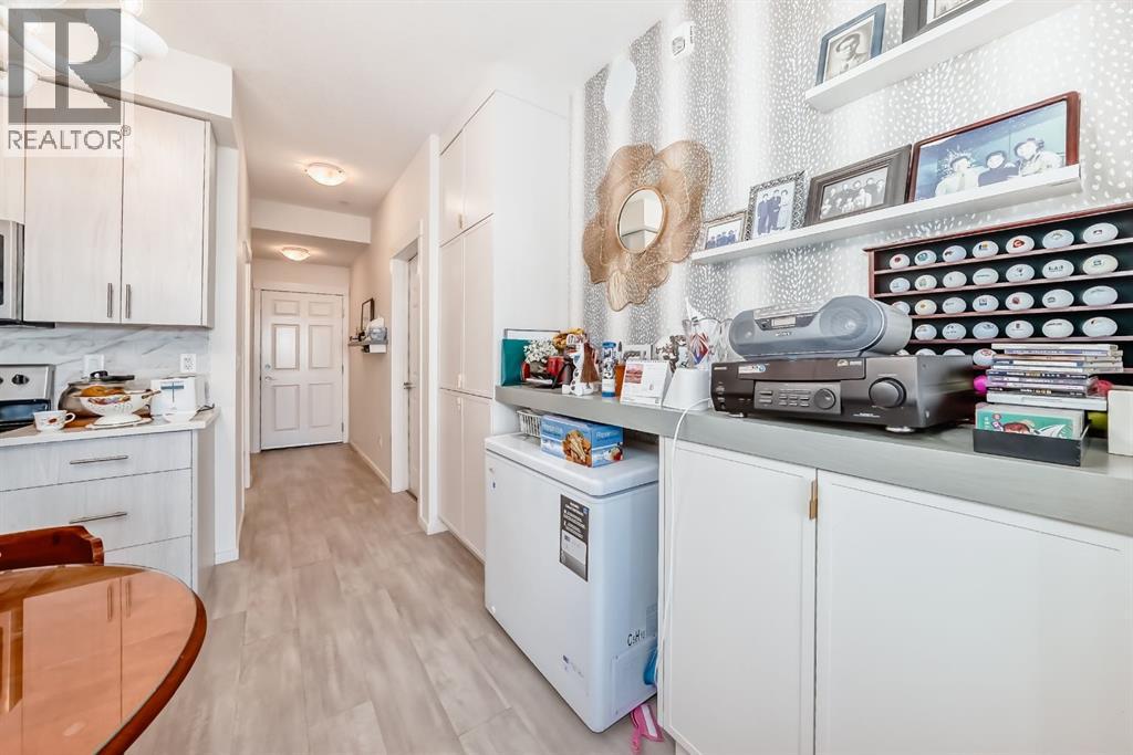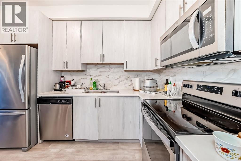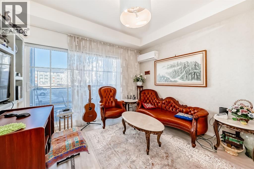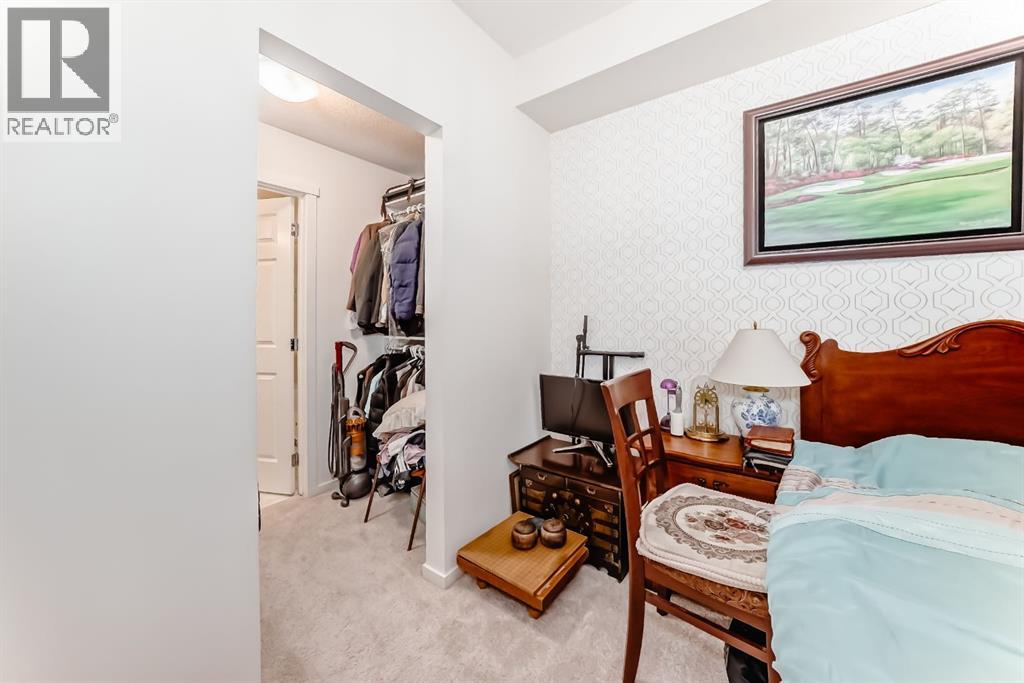 This previous show-suite features a functional split-bedroom design, offering maximum privacy by separating the two bedrooms with a central living area. The unit is thoughtfully finished with numerous premium upgrades. As a main-floor unit, this home features 9-foot ceilings that create a spacious and open atmosphere. The entry foyer includes a coat closet and leads into a modern open-concept space designed for both daily living and entertaining. The gourmet kitchen features Blizzard-Quartz countertops, a marble tile backsplash, and stainless steel appliances. A breakfast bar that overlooks the living room and a designated dining area. The cabinetry is upgraded with 42-inch upper cabinets, under-cabinet lighting, and undermount sinks. The primary suite fits a king or queen-sized bed and includes a private walk-in closet. The attached ensuite bathroom features a deluxe shower and a quartz countertop with a banjo arm for extra surface space. On the opposite side of the unit, the second bedroom fits a queen bed and sits directly next to the second full bathroom, which includes a deep soaker tub. High-end finishes are found throughout the home, including silver oak cork flooring, custom lighting, and designer wallpaper. The living room comes with a pre-installed TV mount and provides direct access to a private concrete patio. For extra convenience, the in-suite laundry room includes a stacked washer and dryer with a built-in organizer. This home is located within walking distance of Sage Hill Crossing, T&T Supermarket, and Walmart. (id:63190)