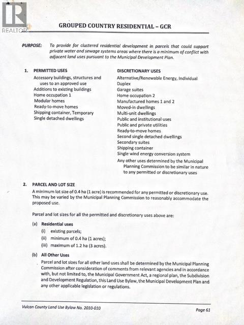 LOT 1. PRIMARY POWER LINES ARE IN !!!! Here is your chance to bring your ideas and purchase your very own acreage lot. With the Grouped Country Residential zoning it will give you numerous options under the permitted and discretionary uses. There are very limited acreage lots available at this size and price. At just under 5 acres the possibilities are endless. For the naturalists these lots still contain untouched prairie wool grasses. The County of Vulcan has been a gem to deal with as well as the inspectors making the development process straight forward. Call your favorite agent today and lets discuss options!!! (id:63190)