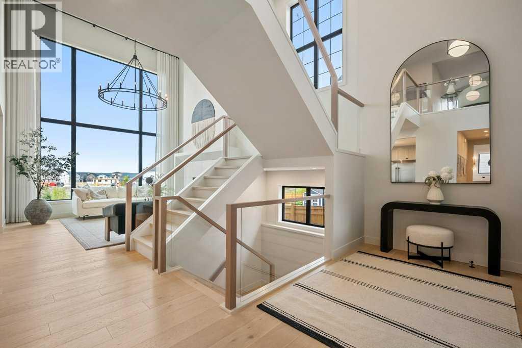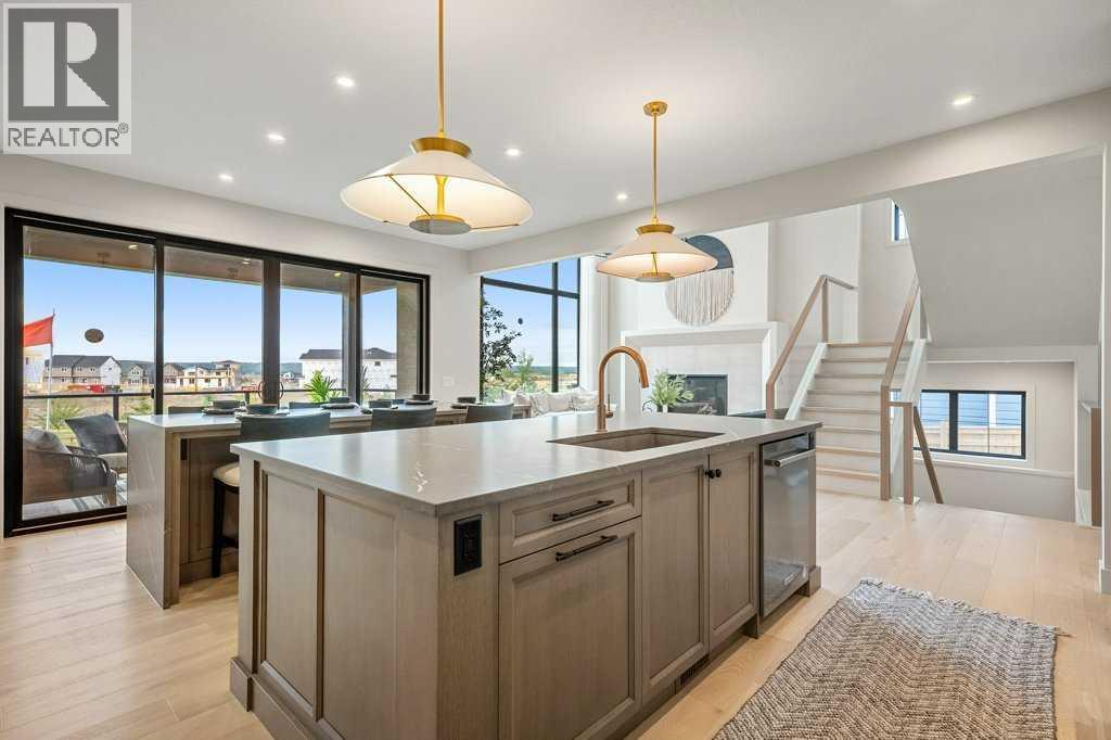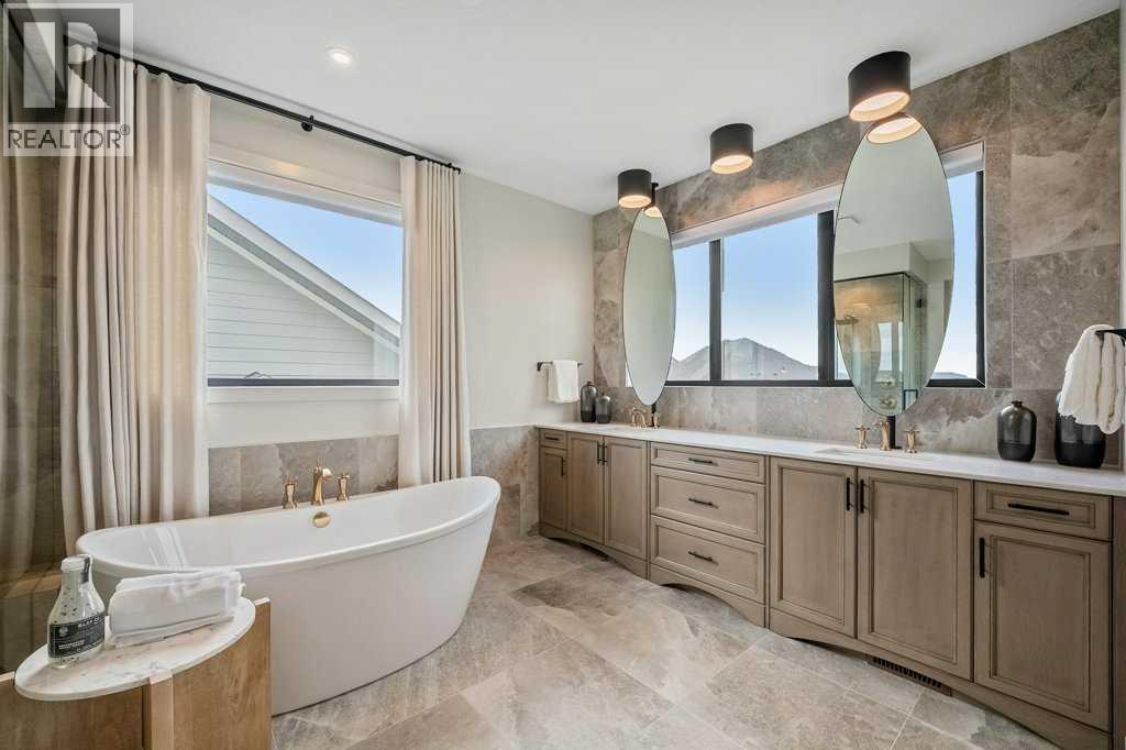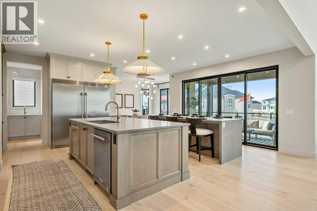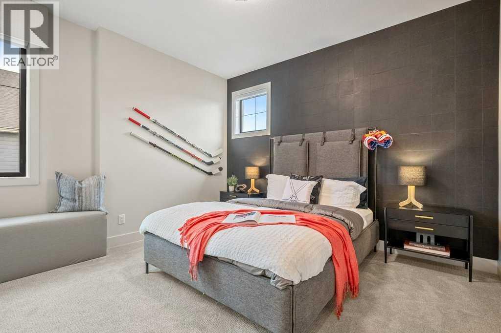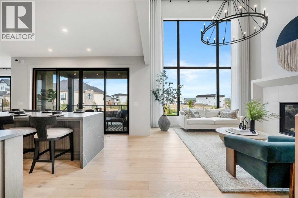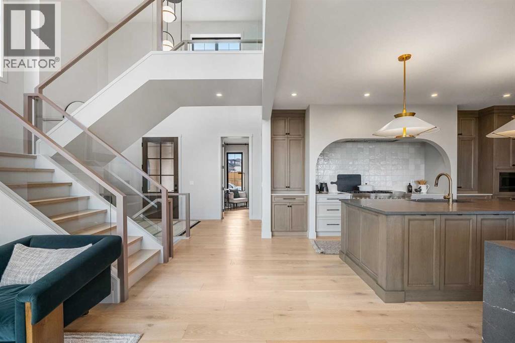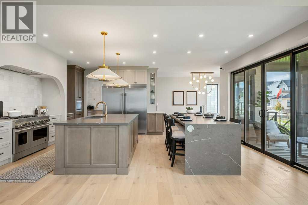 Lake side living at its finest! Presenting the Scarlett Show Home built by Baywest Homes. Ideal for the modern family at just over 5,000 square feet of total developed space, featuring 4 bedrooms, plus generous living and gathering spaces all wrapped in an abundance of style, design and the over-the-top upgrades you would expect in Harmony Estates. Gemstone lighting, a triple front garage, central air, custom window treatments and lighting, a grand open to above, covered deck, 4 full baths, a gym, butlers pantry, generous size mudroom and enclosed front den. Enter into engineered flooring, dual island concept in the kitchen within the themed concept of entertaining and hosting, side by side professional fridge, freezer and gas stove. Built in's throughout the main floor space including the dining area, butlers pantry, den and lower level recreation room. The 'WOW' factor offered from the open to above lifestyle room with its focal 2 story fireplace offers natural light throughout this space. The family convenience of a spacious mudroom located off the butlers pantry, secondary pantry with a corridor hall connecting the front foyer hidden behind the stunning main floor design. An upper floor created for personal space, but welcoming to all. The 3 upper bedrooms situated to the front of the home smartly designed with a 5-peice Jack and Jill en-suite opposite the 3rd bedroom with its own private 4-peice en-suite bath. The laundry area is located just off the bridge access to this level and rests beside the vaulted bonus room. Dual door access to the rear primary bedroom overlooking the green space and walking paths with heated floors in the 5-piece en-suite bath, a full size shower, soaker tub, full width vanity, his and her sinks, an abundance of storage giving off the 5 star hotel vibes from the hanging mirrors to the faucets and fixtures. A lower level for room to relax and gather with a recreation room, wet bar, 5th bedroom and a pocket door to the 4-piece lower ba th with heated floors from the curated gym space. Your outdoor space has a covered deck with access to the walking paths, a short trip to current and future local amenities as well as the beach club, Launchpad and Mickelson National Golf Course. (id:63190)