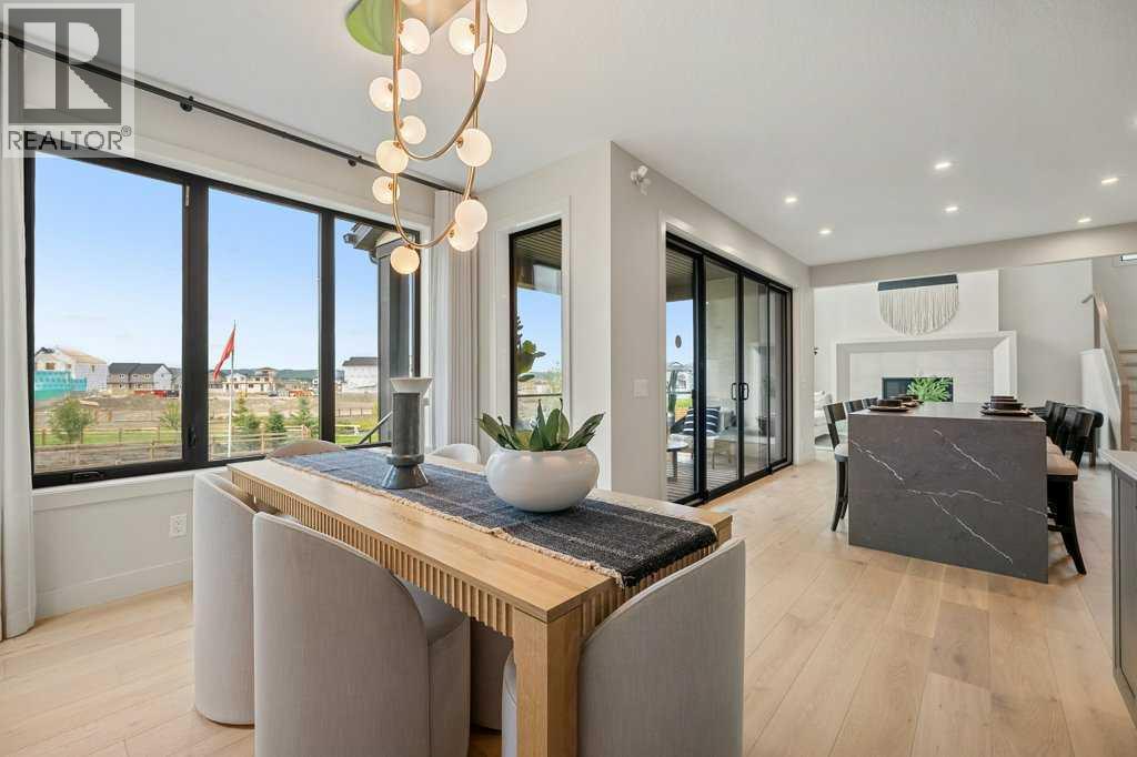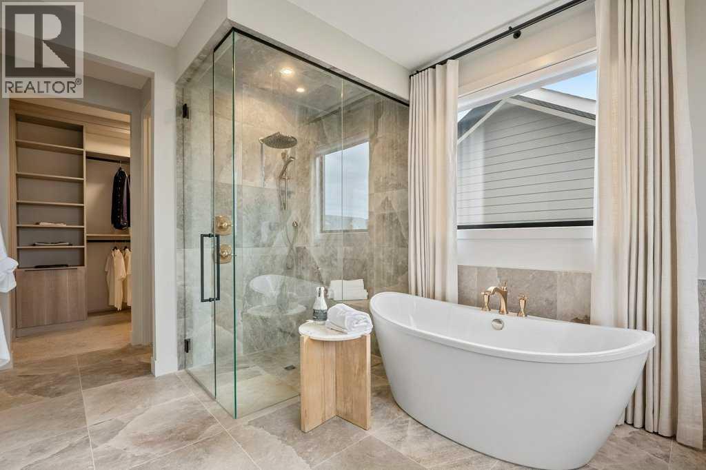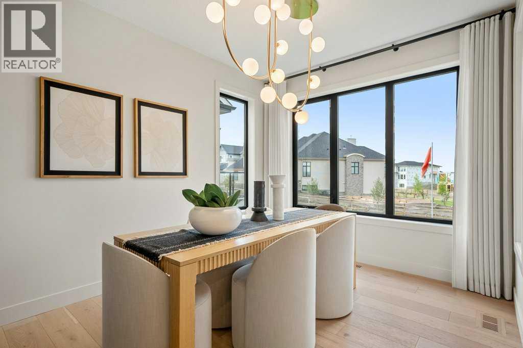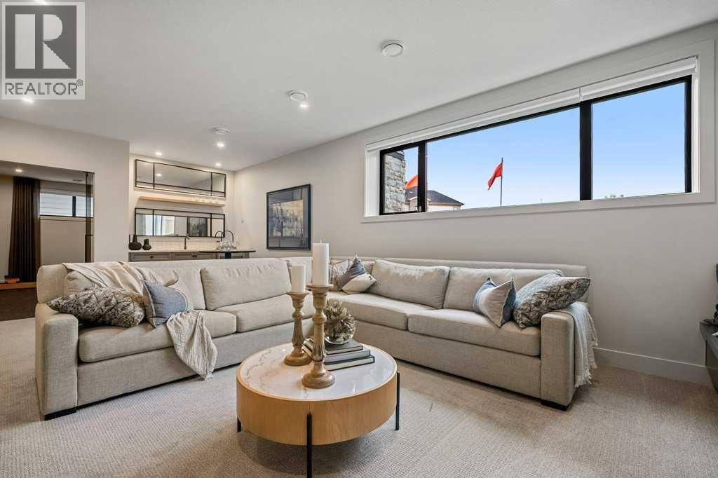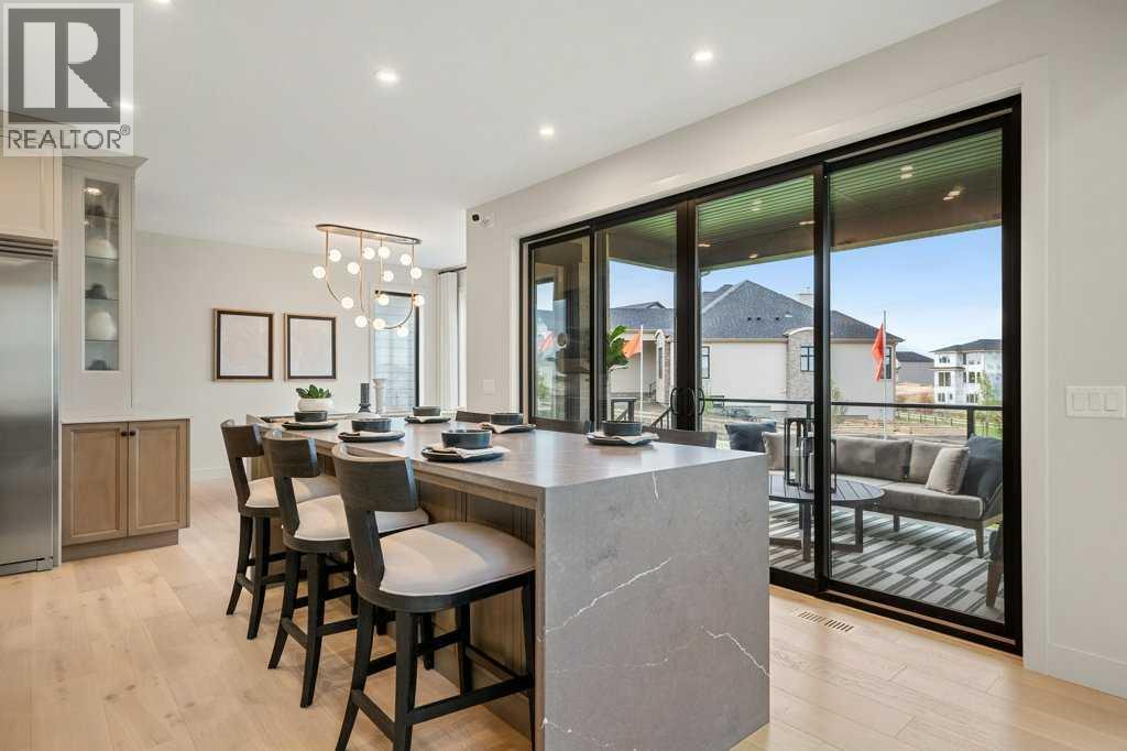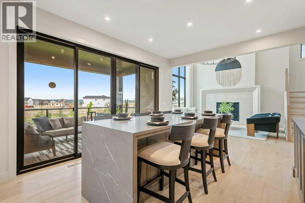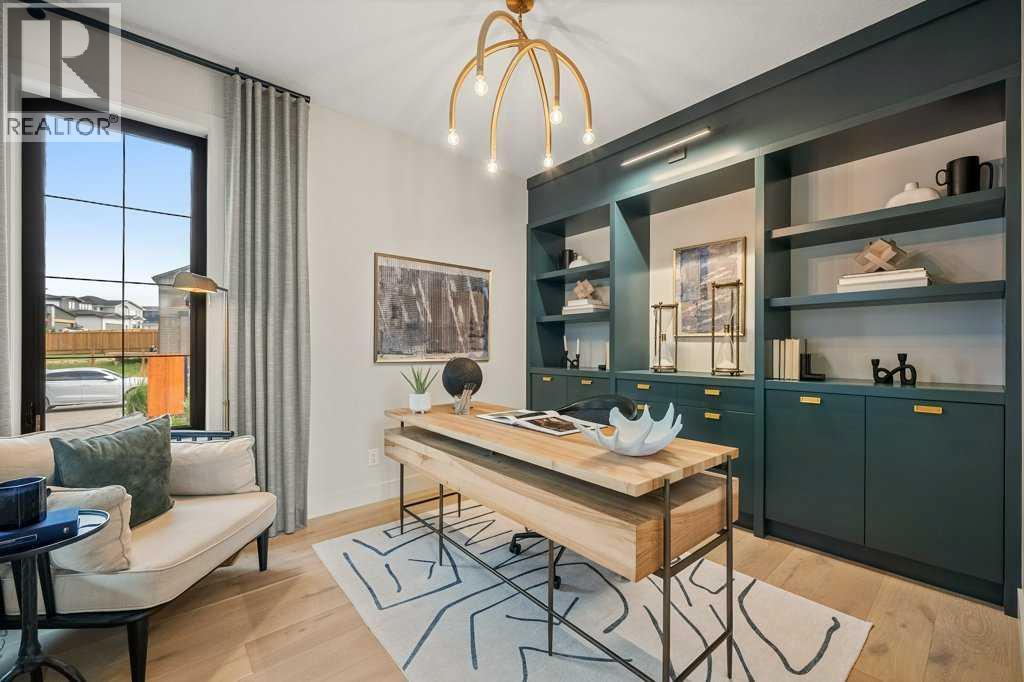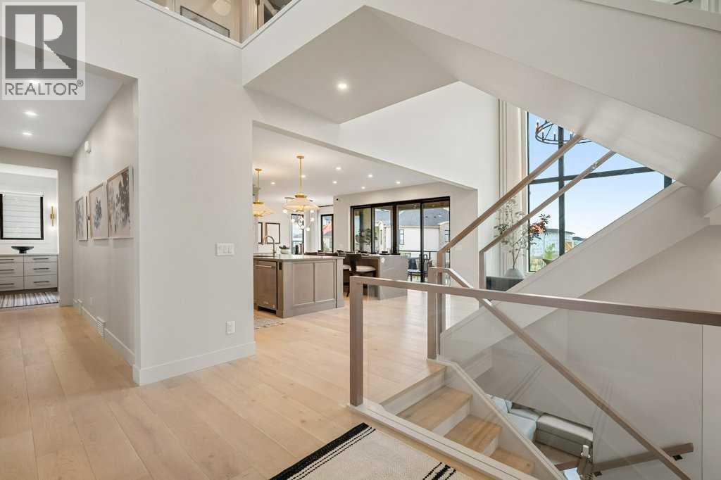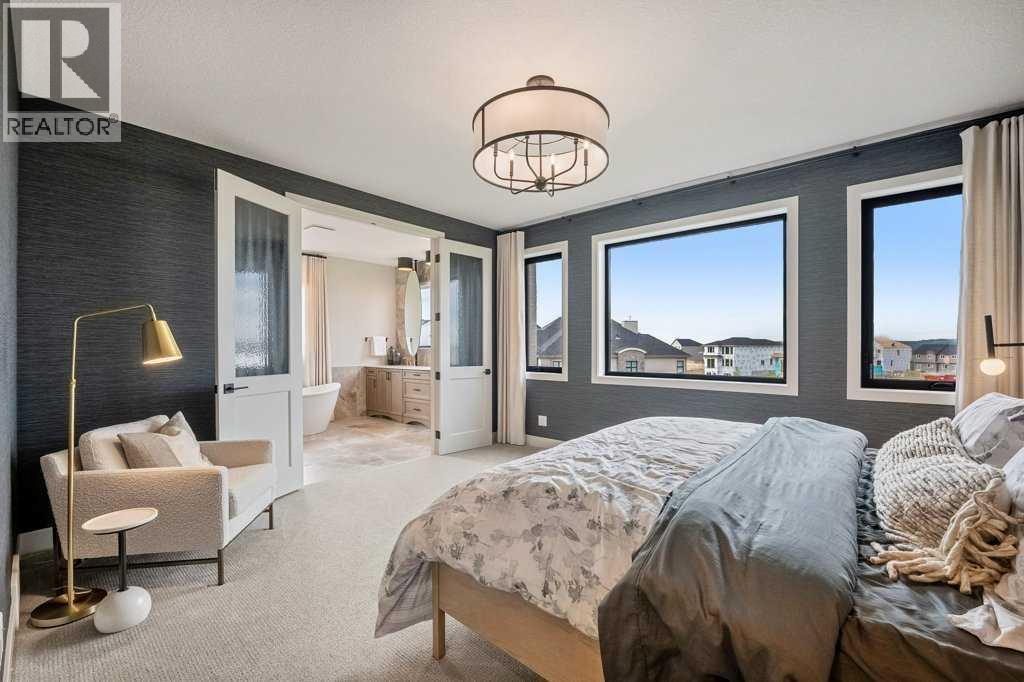 Lake side living at its finest! Presenting the Scarlett Show Home built by Baywest Homes. Ideal for the modern family at just over 5,000 square feet of total developed space, featuring 4 bedrooms, plus generous living and gathering spaces all wrapped in an abundance of style, design and the over-the-top upgrades you would expect in Harmony Estates. Gemstone lighting, a triple front garage, central air, custom window treatments and lighting, a grand open to above, covered deck, 4 full baths, a gym, butlers pantry, generous size mudroom and enclosed front den. Enter into engineered flooring, dual island concept in the kitchen within the themed concept of entertaining and hosting, side by side professional fridge, freezer and gas stove. Built in's throughout the main floor space including the dining area, butlers pantry, den and lower level recreation room. The 'WOW' factor offered from the open to above lifestyle room with its focal 2 story fireplace offers natural light throughout this space. The family convenience of a spacious mudroom located off the butlers pantry, secondary pantry with a corridor hall connecting the front foyer hidden behind the stunning main floor design. An upper floor created for personal space, but welcoming to all. The 3 upper bedrooms situated to the front of the home smartly designed with a 5-peice Jack and Jill en-suite opposite the 3rd bedroom with its own private 4-peice en-suite bath. The laundry area is located just off the bridge access to this level and rests beside the vaulted bonus room. Dual door access to the rear primary bedroom overlooking the green space and walking paths with heated floors in the 5-piece en-suite bath, a full size shower, soaker tub, full width vanity, his and her sinks, an abundance of storage giving off the 5 star hotel vibes from the hanging mirrors to the faucets and fixtures. A lower level for room to relax and gather with a recreation room, wet bar, 5th bedroom and a pocket door to the 4-piece lower ba th with heated floors from the curated gym space. Your outdoor space has a covered deck with access to the walking paths, a short trip to current and future local amenities as well as the beach club, Launchpad and Mickelson National Golf Course. (id:63190)