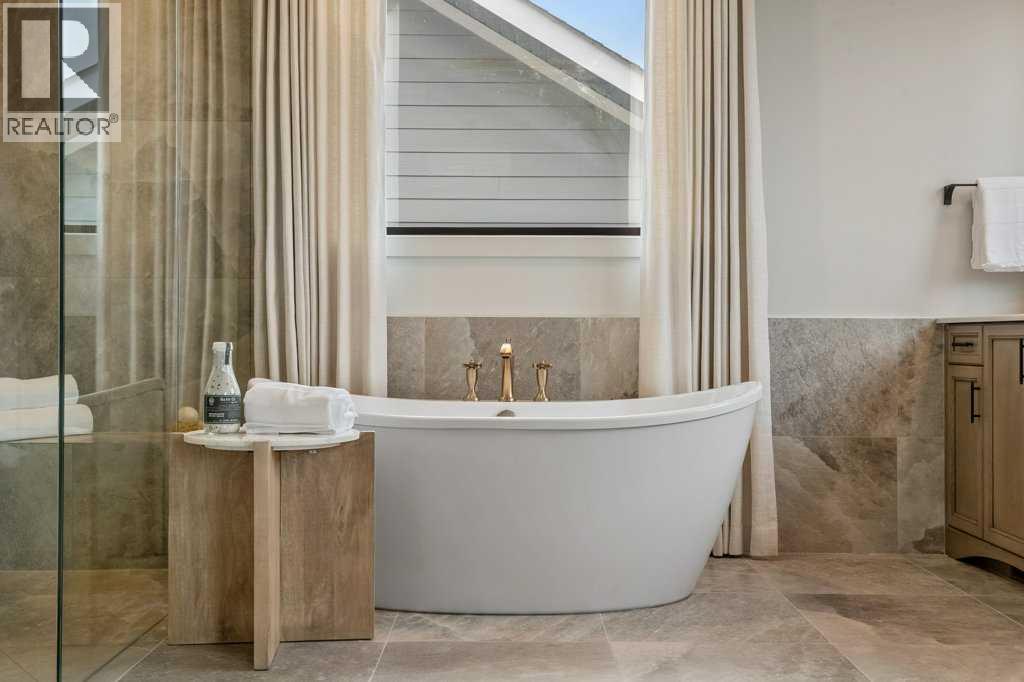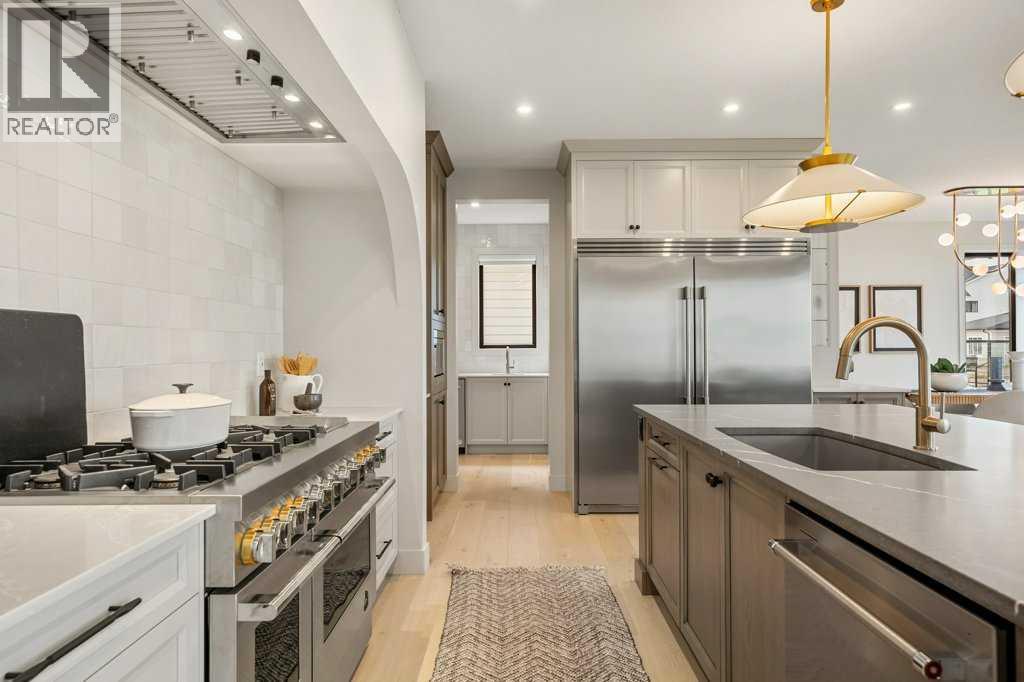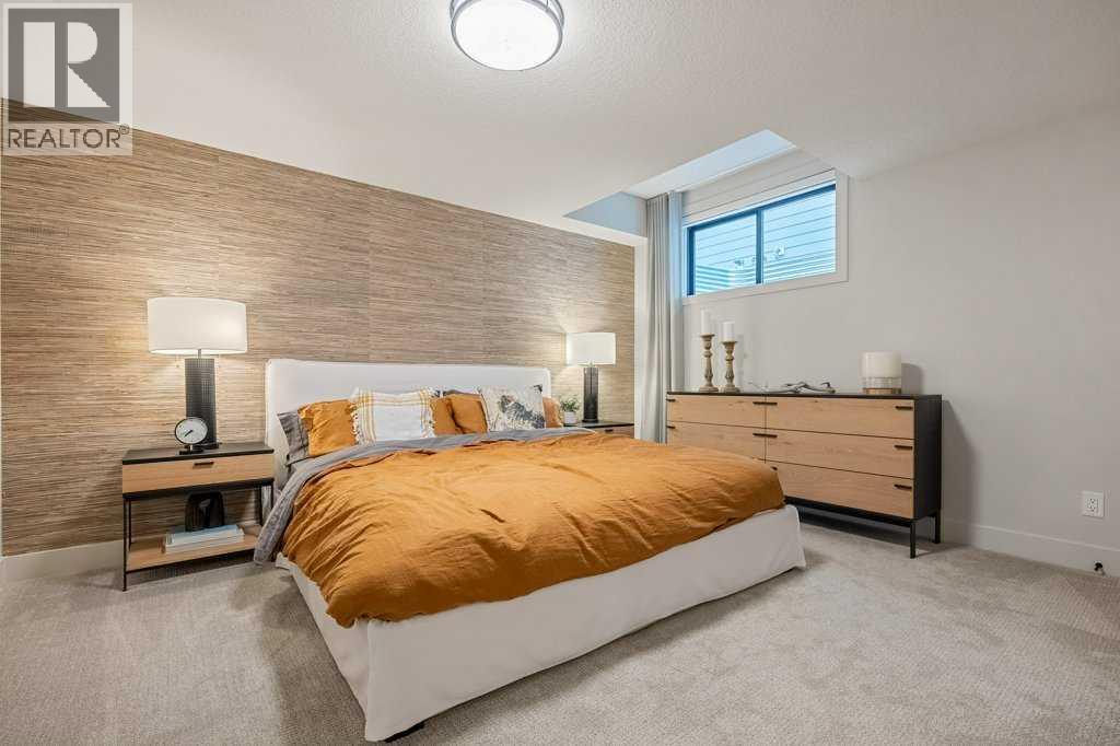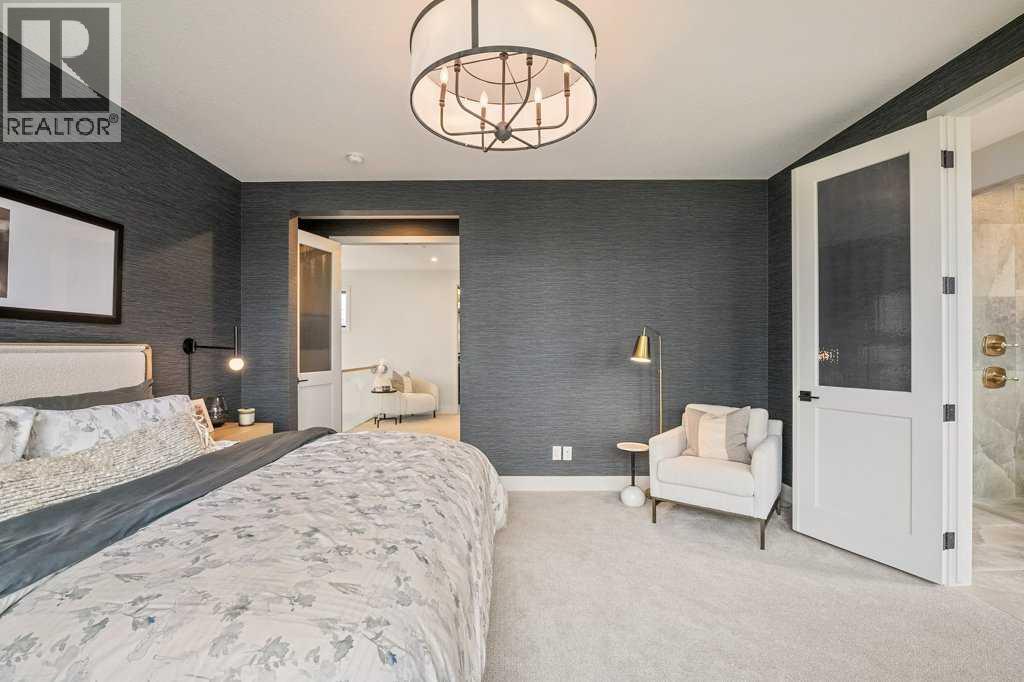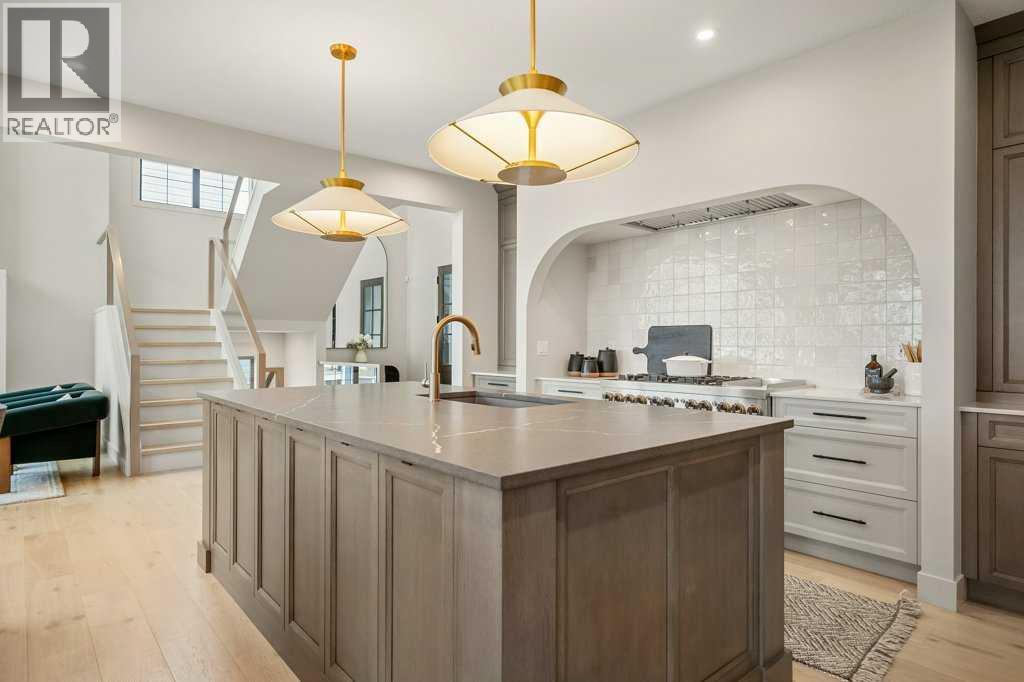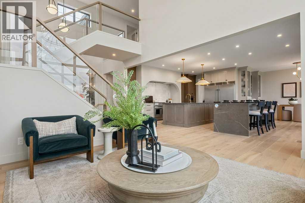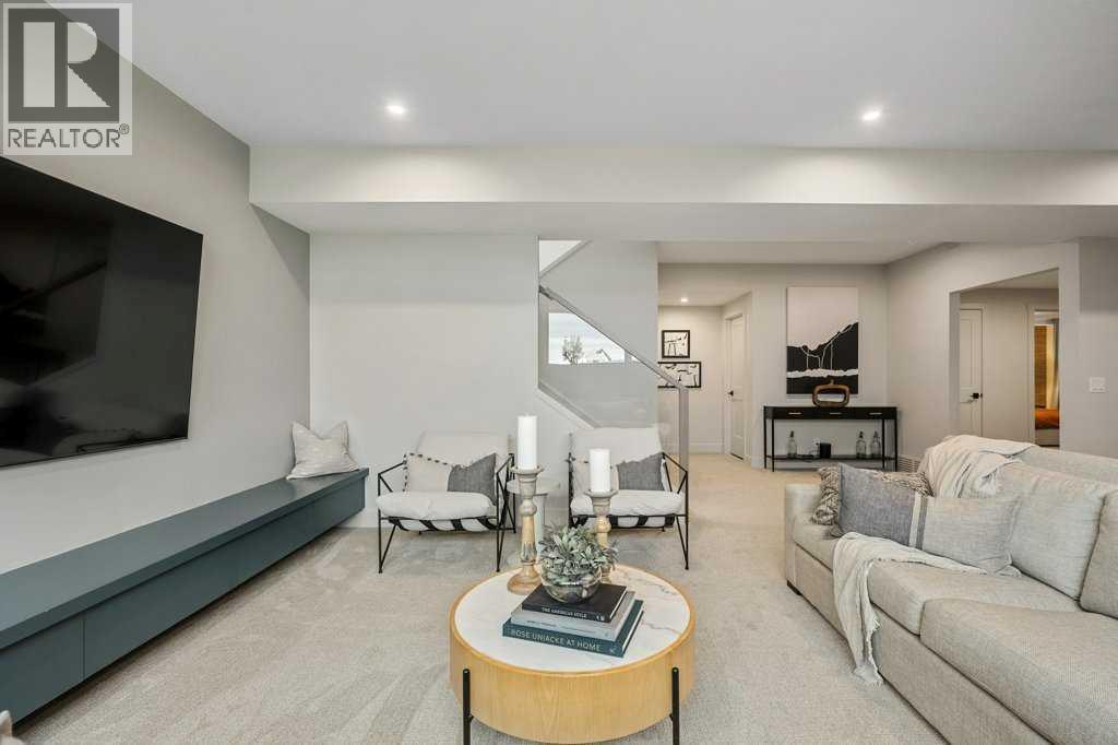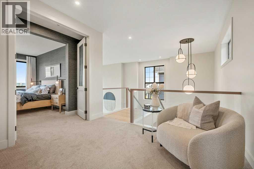Lake side living at its finest! Presenting the Scarlett Show Home built by Baywest Homes. Ideal for the modern family at just over 5,000 square feet of total developed space, featuring 4 bedrooms, plus generous living and gathering spaces all wrapped in an abundance of style, design and the over-the-top upgrades you would expect in Harmony Estates. Gemstone lighting, a triple front garage, central air, custom window treatments and lighting, a grand open to above, covered deck, 4 full baths, a gym, butlers pantry, generous size mudroom and enclosed front den. Enter into engineered flooring, dual island concept in the kitchen within the themed concept of entertaining and hosting, side by side professional fridge, freezer and gas stove. Built in's throughout the main floor space including the dining area, butlers pantry, den and lower level recreation room. The 'WOW' factor offered from the open to above lifestyle room with its focal 2 story fireplace offers natural light throughout this space. The family convenience of a spacious mudroom located off the butlers pantry, secondary pantry with a corridor hall connecting the front foyer hidden behind the stunning main floor design. An upper floor created for personal space, but welcoming to all. The 3 upper bedrooms situated to the front of the home smartly designed with a 5-peice Jack and Jill en-suite opposite the 3rd bedroom with its own private 4-peice en-suite bath. The laundry area is located just off the bridge access to this level and rests beside the vaulted bonus room. Dual door access to the rear primary bedroom overlooking the green space and walking paths with heated floors in the 5-piece en-suite bath, a full size shower, soaker tub, full width vanity, his and her sinks, an abundance of storage giving off the 5 star hotel vibes from the hanging mirrors to the faucets and fixtures. A lower level for room to relax and gather with a recreation room, wet bar, 5th bedroom and a pocket door to the 4-piece lower ba th with heated floors from the curated gym space. Your outdoor space has a covered deck with access to the walking paths, a short trip to current and future local amenities as well as the beach club, Launchpad and Mickelson National Golf Course. (id:63190)