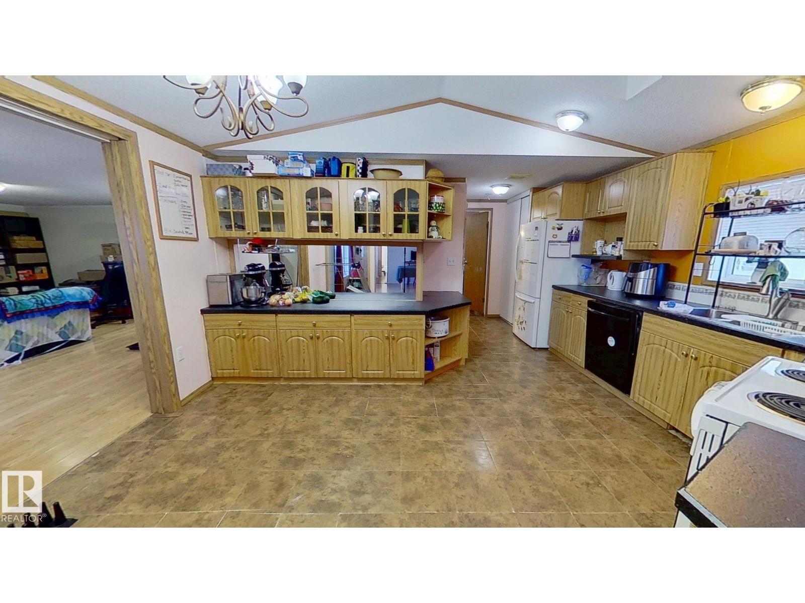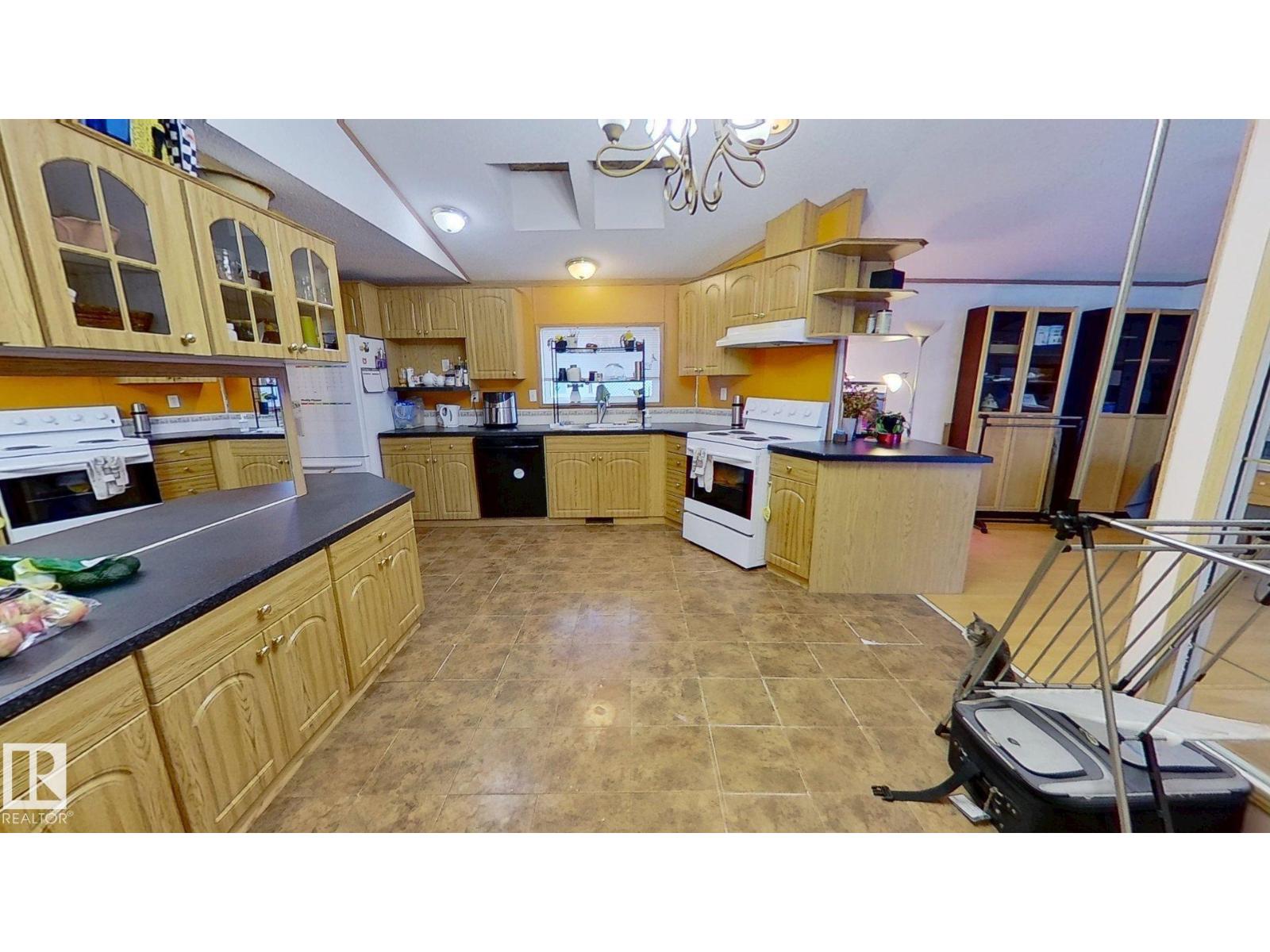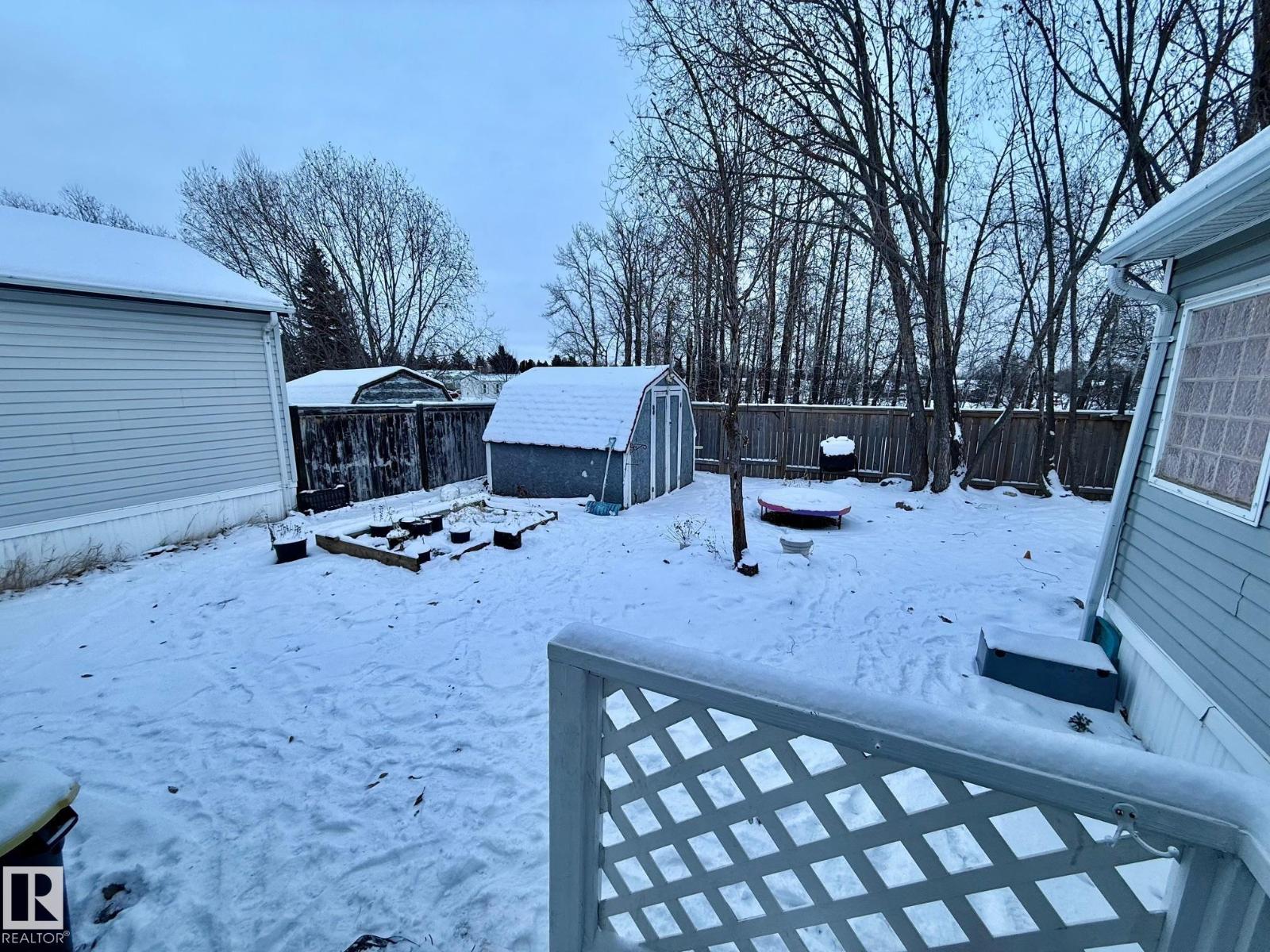 Welcome to this 3-bed 2-bath, 1650 sq ft mobile home in WVV. Bring your ideas, pick your colours, and make it your own! Refurbish on your own timeline - finish the cosmetic repairs with peace of mind knowing many major items have been updated: fridge 09/21, heat trace repairs 01/22, shingles 06/23, furnace, stack, thermostat, and hwt 12/24, deck upgrades 08/25, primer on most walls 10/25, range 01/26. Living/entrance addition and powered shed 2012. Fully fenced lot, mature trees, flower beds, 2 veg gardens (mature chives, oregano, and parsley), and young raspberry bushes. This lot backs out on to a treed green space and is near a bus stop. WVV has 2 playgrounds, a pond that attracts migratory birds, ice rink, a gym, gas station, a pharmacy, daycare facility, pub, and RV storage. Schools nearby and quick access to the Anthony Henday and Hwy 16. Windows(including skylights) and doors(interior and exterior) need replacing but are functional. Jetted tub may need new motor, and needs to be reinsulated. (id:63190)