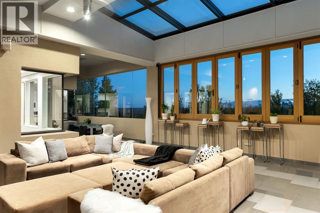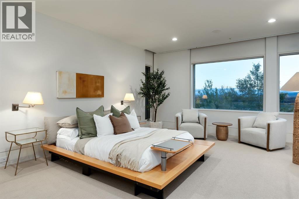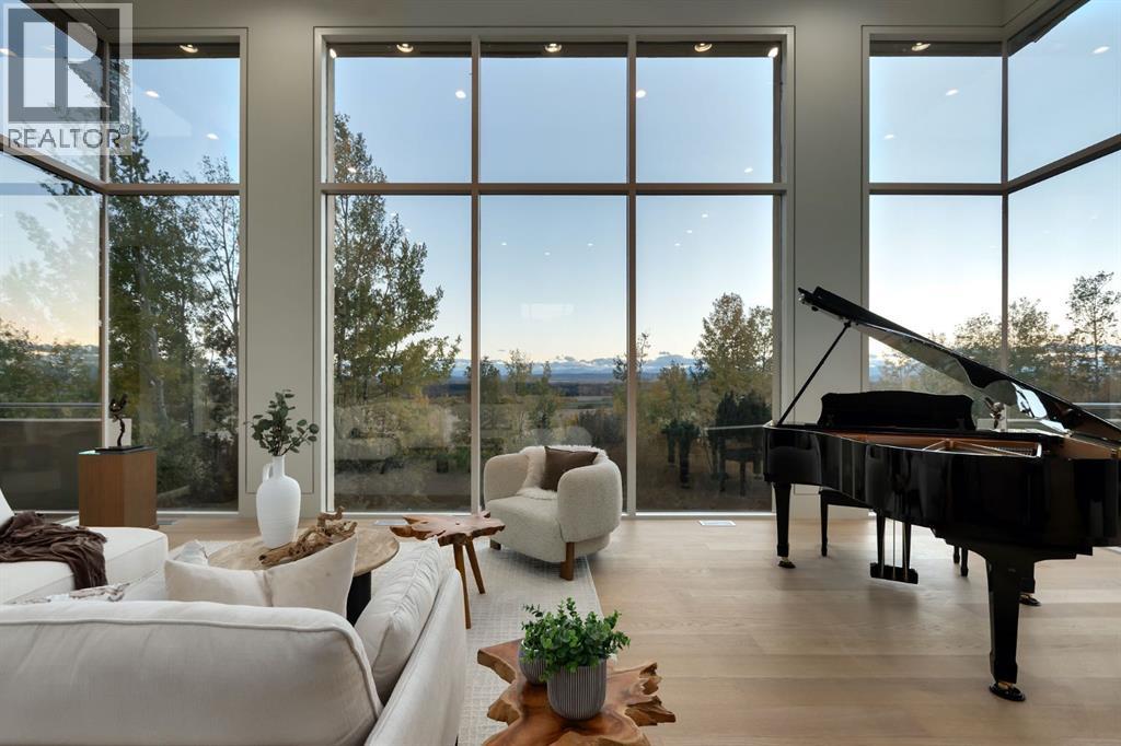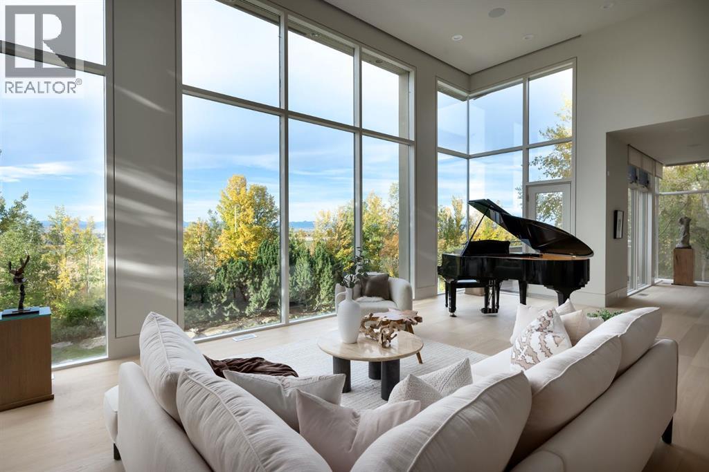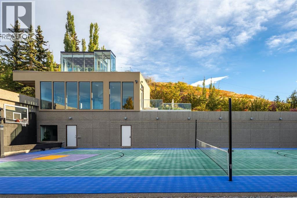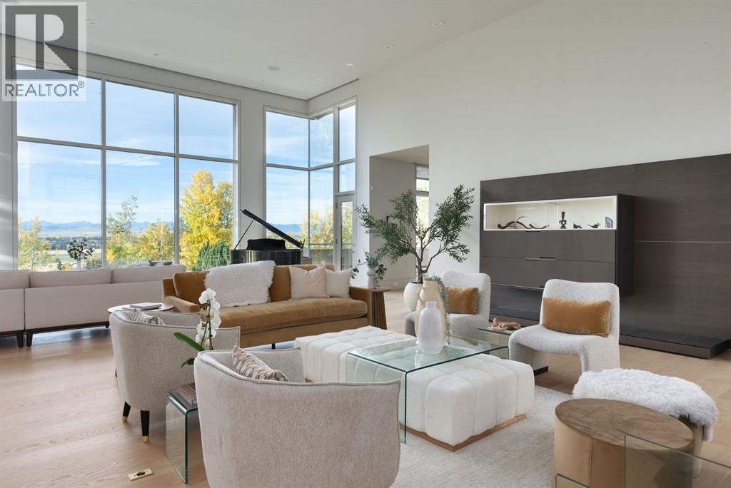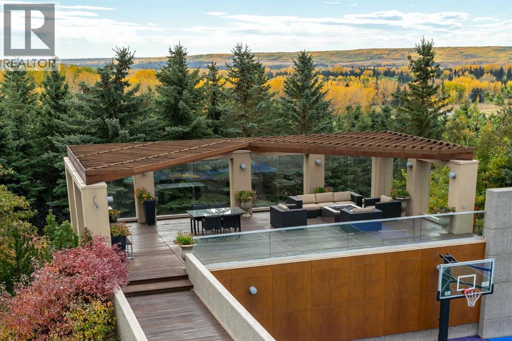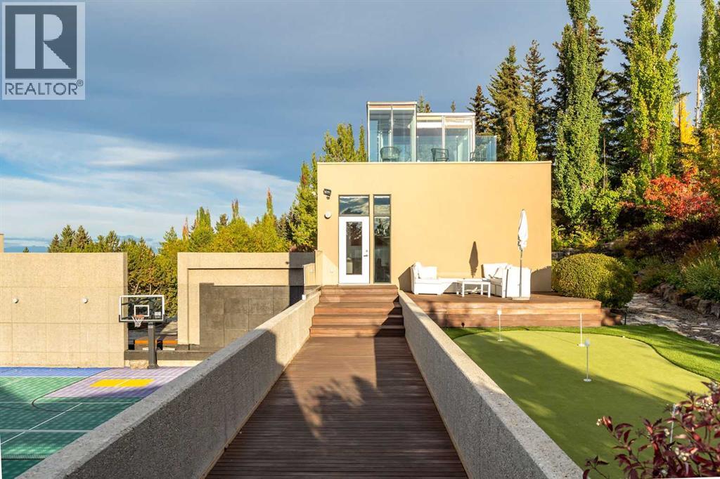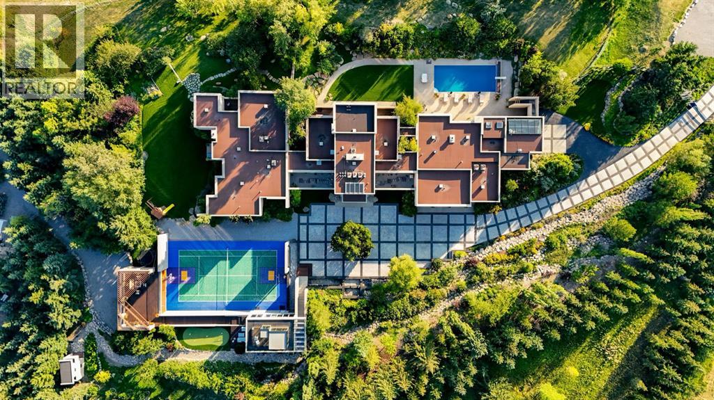 Seize a rare opportunity to own an iconic landmark in the prestigious southwest Springbank area, one of Calgary’s most coveted locations. Set on an expansive 18.62-acre escarpment, this exceptional property offers stunning mountain views and unparalleled privacy. Designed with new-age minimalism, this 20,000+ sq ft estate is a serene retreat for the discerning buyer. Located just minutes from Stoney Trail West, on the edge of Calgary, this secluded paradise offers the ultimate in luxury living. With 6 bedrooms + 10 bathrooms + 2 large offices, the home features stunning architectural design, including soaring flat & vaulted ceilings, a grand two-story great room illuminated by expansive windows. The contemporary living spaces are complemented by a soothing wood fireplace & ZEN garden inspired hallway views. The spacious dining room, perfect for memorable gatherings, overlooks beautifully landscaped grounds and majestic mountain vistas. Ample vehicle storage includes an oversized 3 car garage, a 2 car garage, and an additional oversized auxiliary 3 car garage (all heated). The gourmet kitchen is a chef’s dream, featuring a Wolf gas range with dual ovens, a built-in refrigerator, a walk-in pantry, an oversized granite island and custom white oak cabinetry. The adjacent family room includes a cozy fireplace, while the sunroom with another fireplace is perfect for family game or movie nights. The bedroom wing, secured by fire doors, houses the luxurious primary suite, a tranquil haven with views of mature trees and a lounge area with a fireplace. The ensuite boasts a deep soaker tub, granite dual-sink vanity, dual toilets, a bidet, and 2 oversized showers, along with a spacious walk-in closet. Four additional bedrooms, each with its own ensuite, are located in the bedroom wing, along with a laundry room and extra storage. Heated floors throughout both the main and lower levels provide year-round comfort. The lower level offers an additional bedroom with a full bathroom, a dedicated hot tub room, a spacious exercise room, an office and a large recreation room. A nearby bar and media room add to the entertainment space, while a walk-up entrance leads to the beautifully landscaped backyard, where a large in-ground pool awaits. Outdoor spaces include southwest-facing decks and a patio, a vast yard, and a middle courtyard with a sports court. An auxiliary building offers potential as a future guest house. The property has undergone millions of dollars in recent landscaping, with paved and natural pathways, waterfall features, and hidden sitting areas. Two security gates, fencing, and surveillance cameras ensure your privacy and security. This magnificent estate offers a private oasis with rolling hills, lush gardens, and elaborate landscaping that rivals anything in Aspen Hills—yet is only five minutes away from top-tier private schools. Experience the pinnacle of luxury living in Canada. Schedule your private tour today and discover all that your next home has to offer. (id:63190)