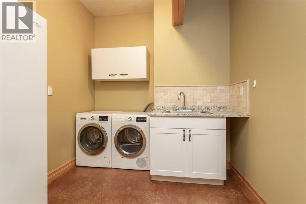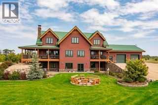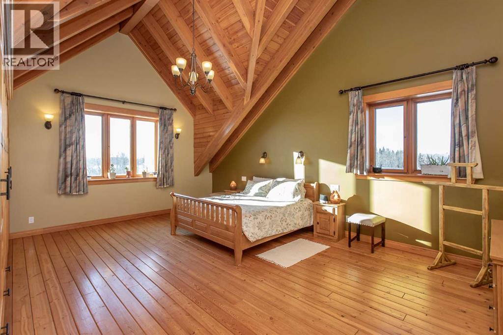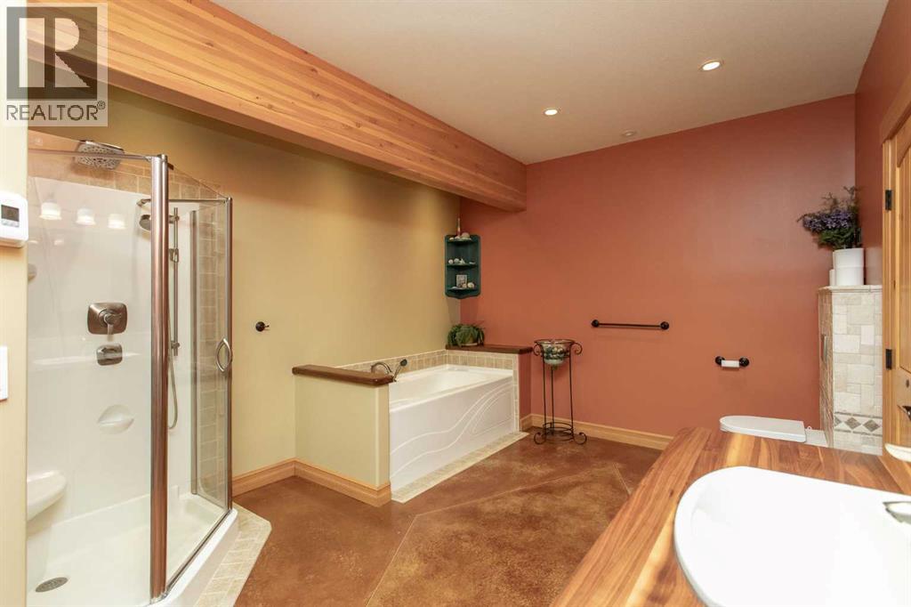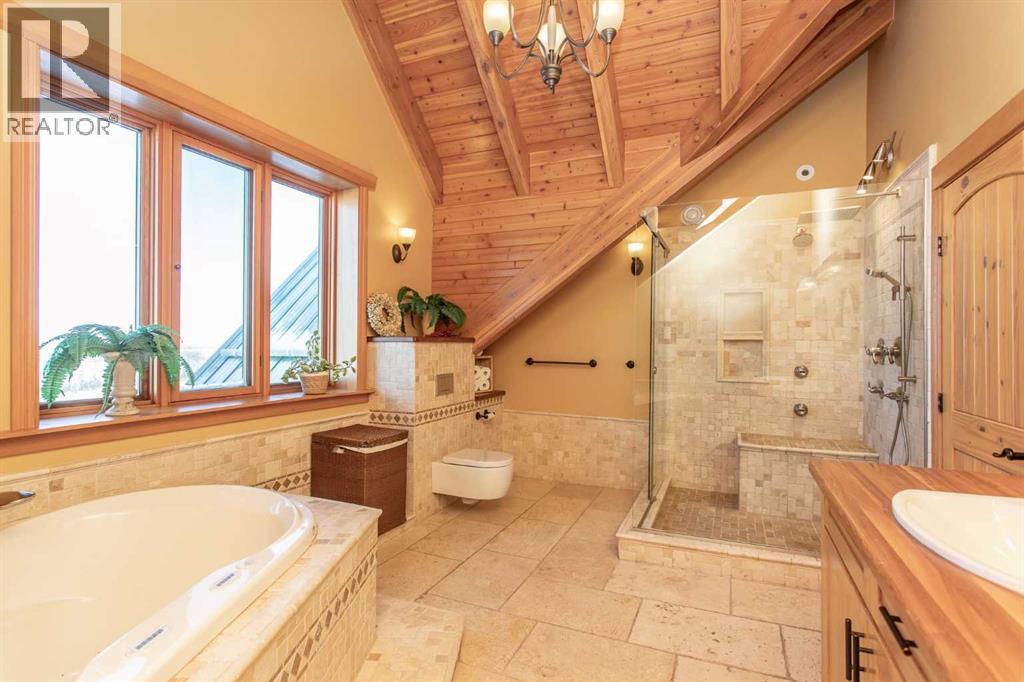 This exceptional 6.5-acre property offers a rare blend of architectural distinction, quality construction, and thoughtful design, set against sweeping panoramic views just minutes from Lacombe. Zoned Ag and meticulously maintained, the manicured yard site is peaceful, private and designed for both lifestyle enjoyment and long-term efficiency.At the heart of the property is a stunning European-inspired, chalet-style two-storey home built in 2008, offering over 7,000 sq ft of developed living space. Constructed entirely with ICF concrete (no stick framing), the home is remarkably solid, quiet, and energy efficient, featuring one-foot-thick exterior walls, concrete floors throughout, and a Super-B insulated roof.Inside, Douglas Fir post-and-beam construction, soaring ceilings, an interior mezzanine, and an open-concept layout create a warm, inviting atmosphere filled with natural light. Covered balconies and walkout basement invite you to enjoy seamless indoor-outdoor living. Fine craftsmanship is evident throughout, from fir hardwood and custom ash cabinetry to walnut countertops and travertine-finished bathrooms. The main living and dining areas are spacious and welcoming, anchored by a beautiful wood-burning fireplace. The kitchen is thoughtfully designed with a center island, wood countertops, new appliances, and generous cabinetry.The primary suite offers a true retreat, with a luxurious 5-piece ensuite. Additional bedrooms and flexible upper-level space provide options for a gym, studio, or quiet reading nook. The lower level is equally well designed, featuring a wine cellar, indoor sauna, recreation area, dedicated laundry room, and a hobby or canning room with sink. Comfort and efficiency are seamlessly integrated with a hybrid geothermal heating and cooling system, in-floor radiant heat on all levels with individual room controls, triple-pane windows, advanced air filtration, humidity control, and zoned HRV systems. The oversized heated attached garage (29 ’ x 39’) reflects the same quality, offering ICF construction, vaulted ceilings, floor drains, and water service.Completing the property is an impressive 13,500 sq ft shop, fully insulated and heated with radiant heat. With 14-ft ceilings, six overhead doors, mezzanine, office, kitchen, bathroom, mechanical rooms, 220V services, air compressor lines, floor drains, and a 20kVA diesel backup generator, the space is ideal for business use, storage, or hobbies.Additional highlights include a drilled well, new septic field for the residence, geothermal field with 16 vertical heat exchangers, an outdoor firepit, and a 3.5-acre lifetime easement providing added usable land while preserving long-term privacy.Designed to truly live, work, and play in one location, this estate-level acreage offers exceptional flexibility for large families, extended family living, and entrepreneurial or home-based business opportunities. Properties of this caliber must be seen to be fully appreciated. (id:63190)