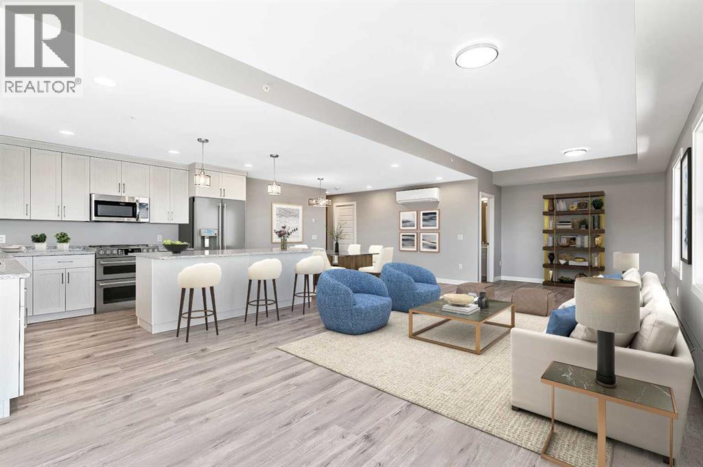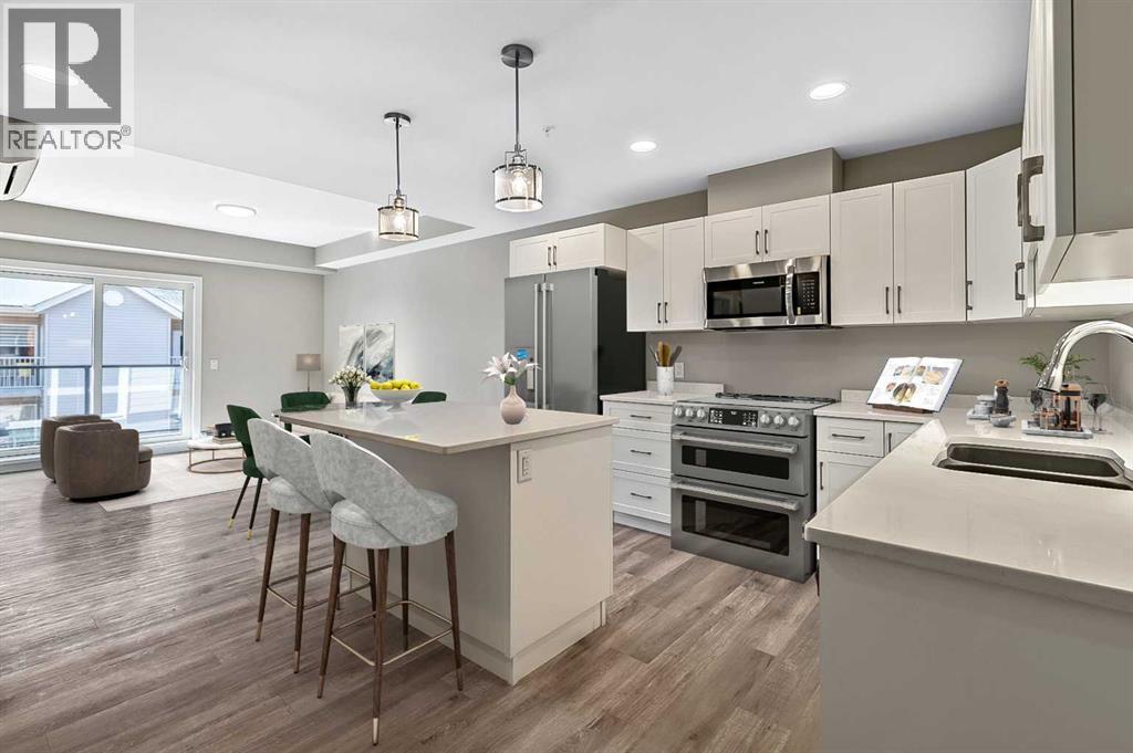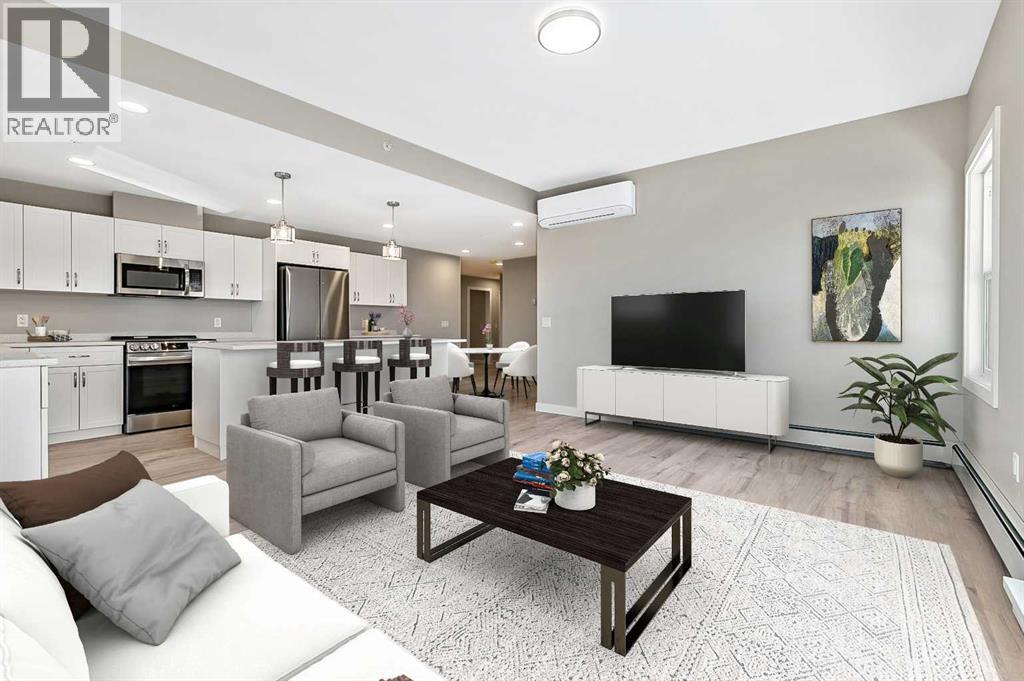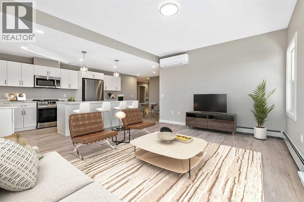 Welcome to modern condo living designed for comfort, quality, and convenience. Construction to start Spring of 2026! This well-appointed residence offers 9-foot ceilings, 8-inch hollowcore concrete floors, and a dual-wall construction system, providing exceptional durability and superior soundproofing. The open-concept kitchen is finished with quartz countertops, a large island with power and pendant lighting, built-in microwave and dishwasher, and a water line to the refrigerator for an ice maker—perfect for both everyday living and entertaining. Luxury vinyl plank flooring flows through the main living areas, with soft carpeted bedrooms offering a warm and comfortable retreat. Enjoy year-round comfort with split air conditioning units, LED lighting throughout, and the convenience of a gas line for your BBQ on the balcony. Each unit includes a private storage room accessible directly from the balcony, adding rare and practical extra space. The building offers thoughtful amenities including indoor heated parking, optional exterior garage units, a pet wash, designated outdoor pet relief and smoking areas, and a EV charging station. A professional decorating consultation is also included to help personalize your new home. Buyers have a rare opportunity to select finishings and tailor the space to their personal style. The Condo fees are $263.00 per month, and provide excellent value. They include heat, water, sewer, garbage collection, common area maintenance, building insurance, reserve fund contributions, water softening, groundskeeping, and snow removal—allowing for worry-free ownership. Ideal for professionals, downsizers, or investors seeking quality construction and low-maintenance living in a well-managed community. Listing photos are virtual staging and/or artists renderings.Information/Meet the builder session happening April 24 5:30-7:30 at 901 13th st SW in the milestone room! (id:63190)