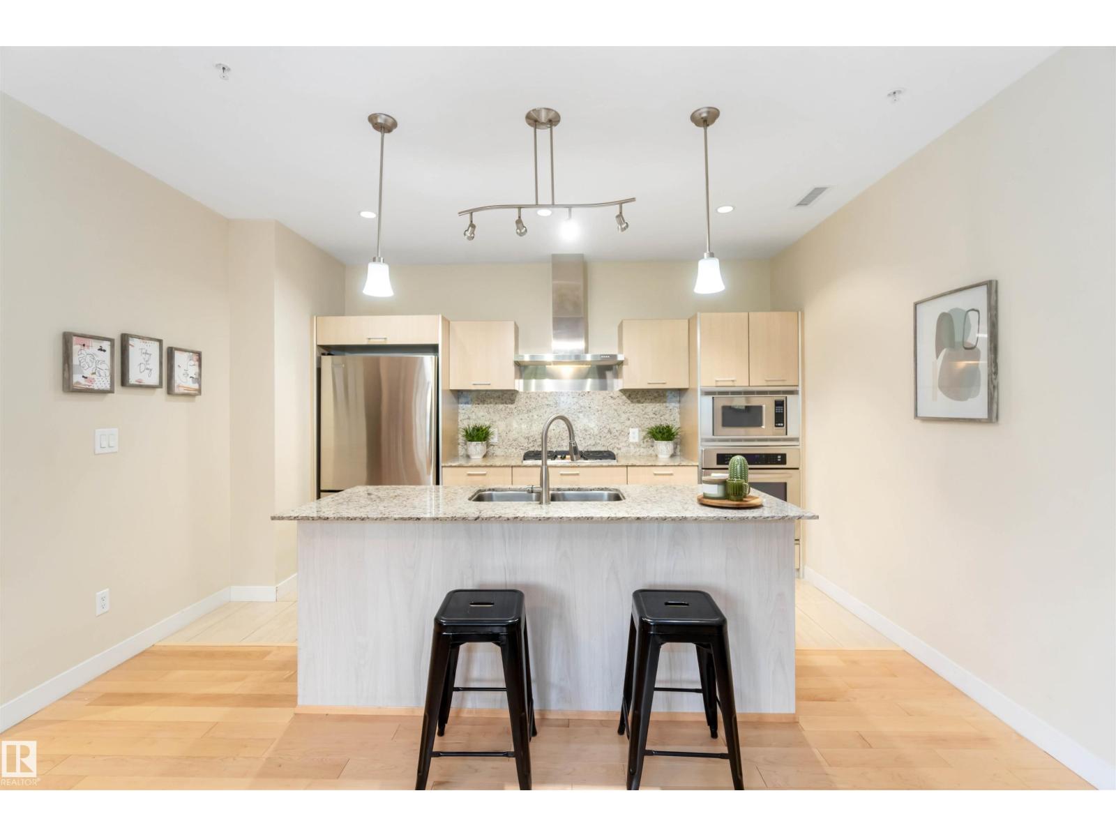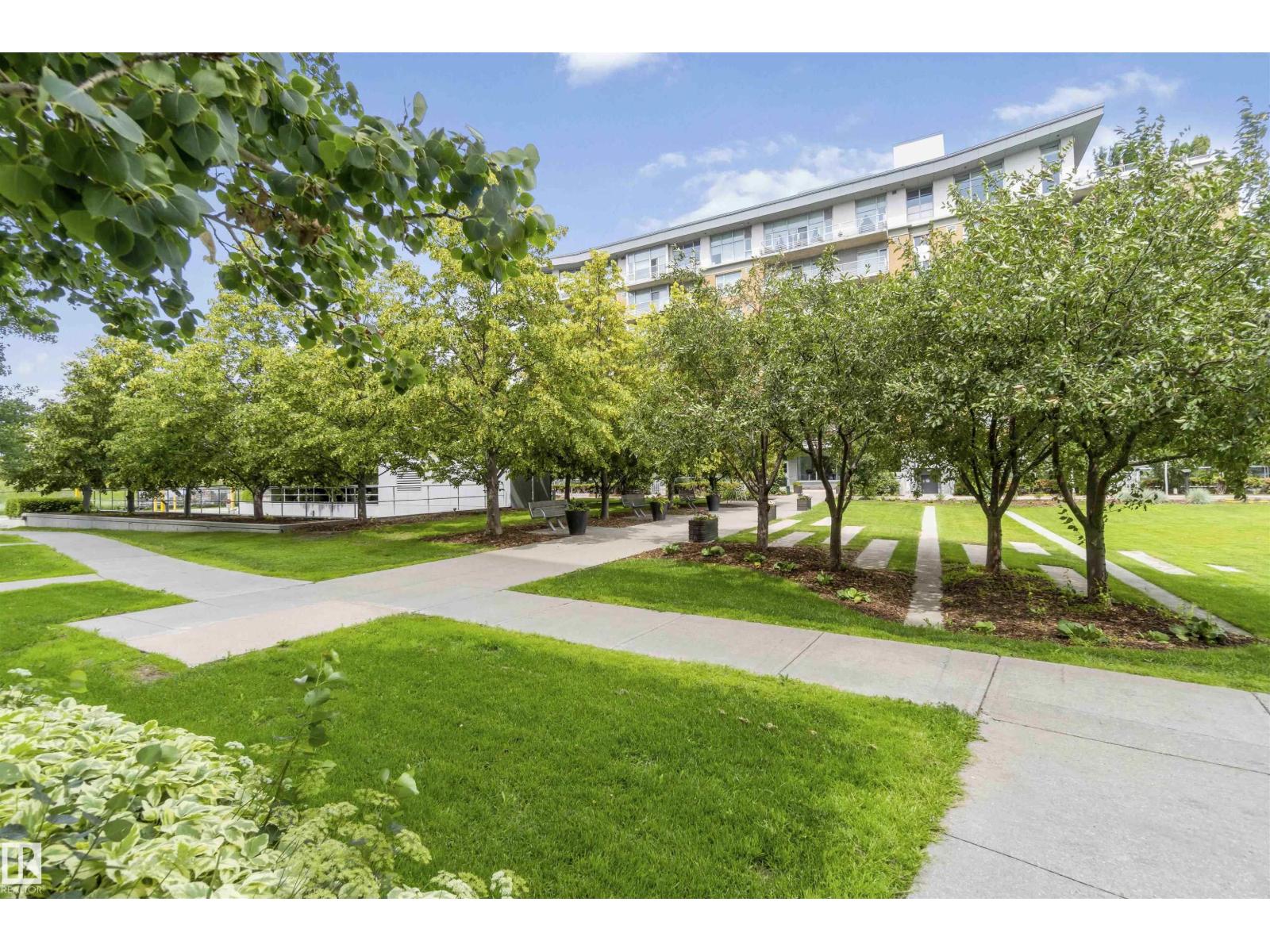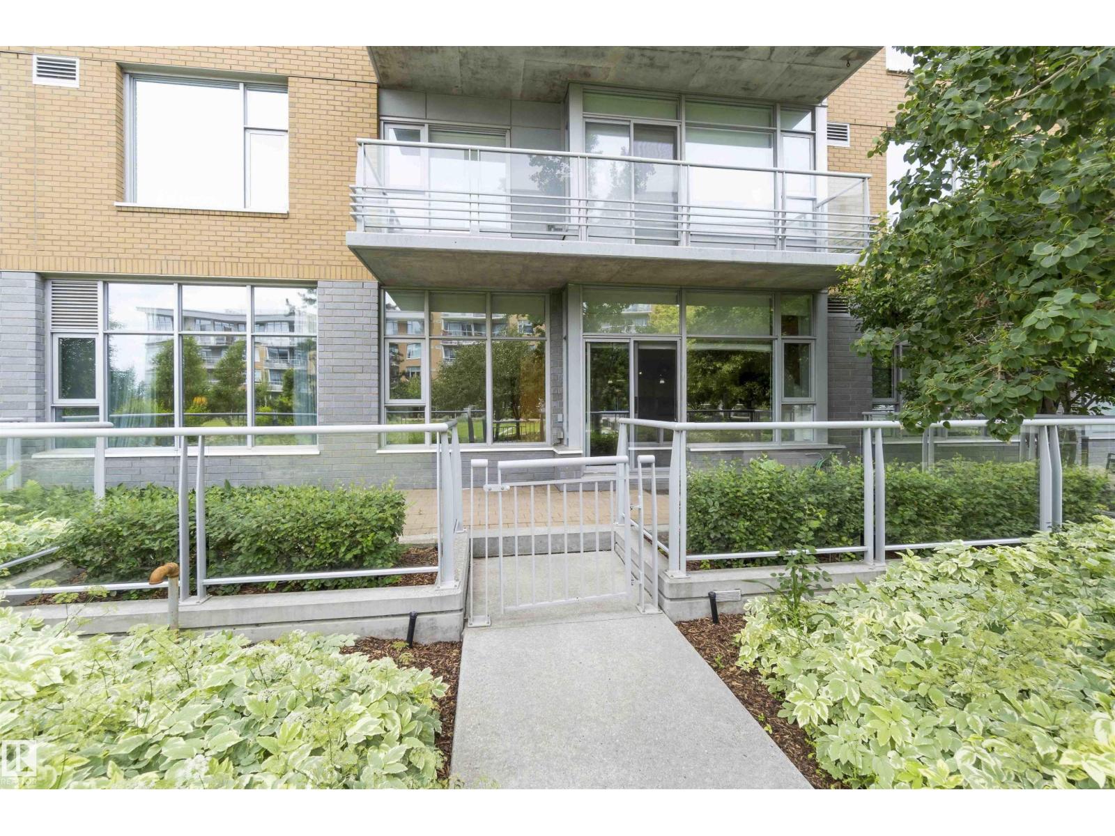 A Stylish and Refreshed 2 Bed, 2 Bath condo in sought-after Ermineskin! This beautiful ground-floor unit showcases serene courtyard views through a wall of windows and features soaring ceilings that create a bright, mini mansion feel. With the ease of taking your pet outside for a walk just by leaving your patio doors. Enjoy elegant hardwood floors, granite countertops, and tile in the kitchen and baths. The chef-inspired kitchen includes a gas cooktop, built-in oven and microwave, and smart pull-out cabinetry. Large Master Retreat with 5pc Ensuite and Second Bedroom with Murphy Bed. Oversized concrete patio surrounded by low-maintenance perennials for summer beauty. With in-suite laundry, titled underground parking & titled storage, this pet-friendly, well-managed complex also offers an exercise room. Condo fees include HEAT and WATER. With a move-in-ready vibe—just steps to grocery shopping, LRT station, and green space! (id:63190)