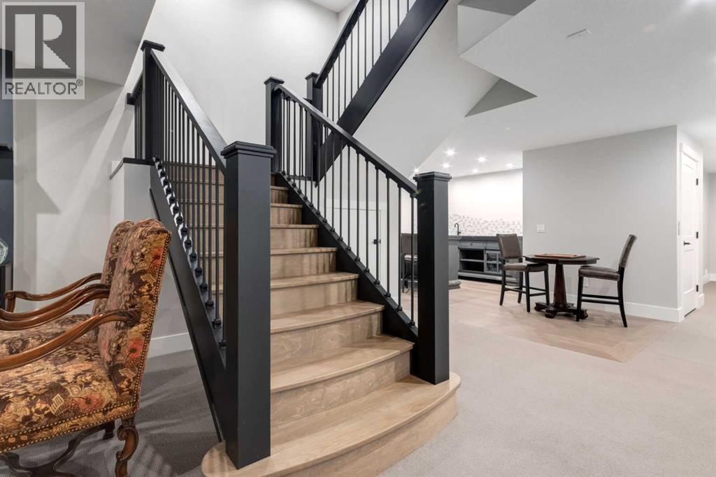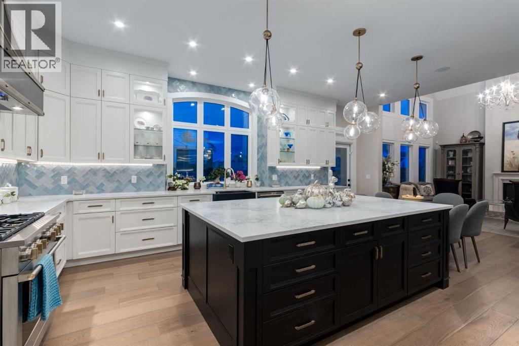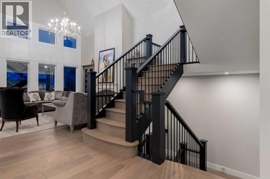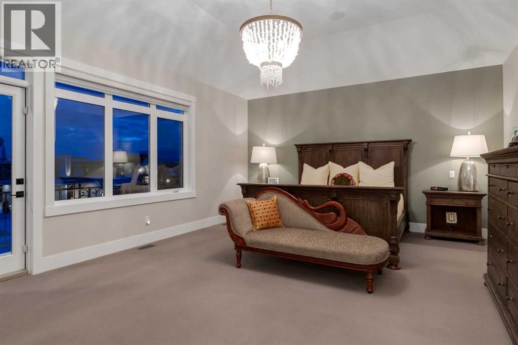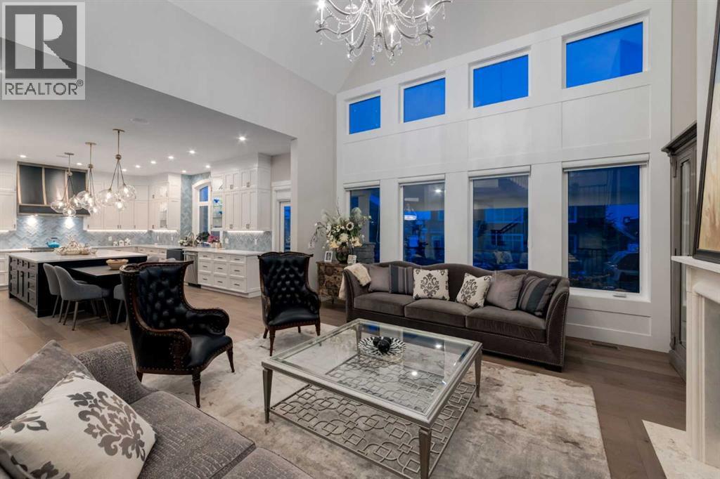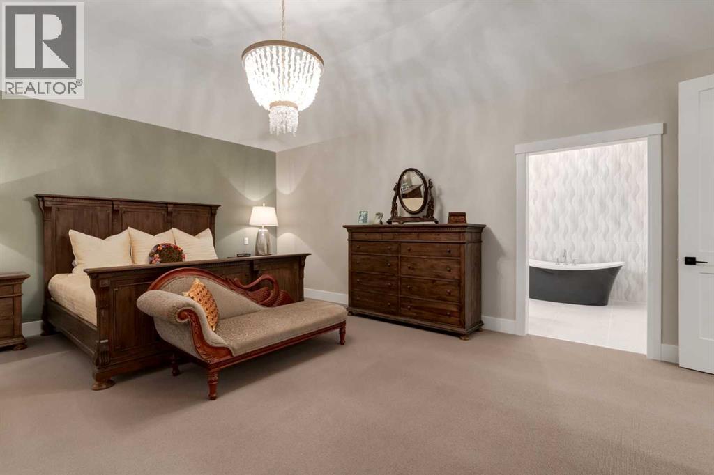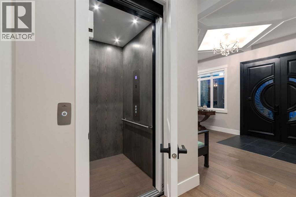 Masterfully executed in a transitional design style, this exquisite Family Home showcases nearly 5,500 sf of impeccable luxury defined by unparalleled craftsmanship and the highest quality of finishes throughout, including an ELEVATOR for easy accessibility to all three floors. The exterior architecture exudes a timeless appeal from the peaked rooflines to the "eyebrow" detailing to the rich stone accents, incredible window designs, a front veranda & upper balcony, and a striking "piece de resistance" front door. The beautifully landscaped front and back gardens impress with perfectly manicured flower beds, and a textural mélange of shrubs and trees. The home's layout is outstanding, while the interior design elements leave a lasting impression on the most discerning "eye for design". The main floor boasts soaring ceiling heights with coffered detailing, impressive, large windows flooding the interior with streams of natural light, custom millwork designs, beautiful, wide-plank hardwood floors, timeless floor and backsplash tile designs, and last but not least, exquisite "Schonbek" chandeliers. The grand, light-filled great room features a magnificent fireplace. It is open to the decadent kitchen and an elegant dining room perfectly suited to hosting dinner parties for family and friends. The front study offers complete privacy and leads to a unique "plant sunroom". The custom-designed kitchen is a chef's dream featuring high-end appliances, ample storage with pullout units, a gigantic center island, timeless quartz countertops, a coveted "Hammersmith" range hood, and last but not least, an impressive chevron pattern backsplash design executed with the utmost precision. Beautifully custom-designed stairs ascend to the upper level complete with three bedrooms and a bonus room, perfectly suited for the children's play area, a TV/games room, or a study room. The master suite is a luxurious retreat complete with wool carpeting, a showpiece chandelier, its own West-facin g balcony and a lavish spa-like ensuite and "dressing room" - a fashionista's dream. Each of the children's bedrooms offers its own chic ensuite bath. The lower level is a true "entertaining haven" featuring a family/TV room that opens onto a private patio area, a wet bar complete with custom furniture-piece units, a wine room, three additional bedrooms, one of which being designated as an exercise room, a full bathroom and a large storage/cold room area. The double and single garage spaces are heated. The single garage is complete with 220 V wiring to allow for an EV charging station. The monthly HOA fees include front yard maintenance, including weekly mowing/trimming; weekly curbside garbage/recycling pickup; snow removal on the streets, sidewalks, pathways & the central plaza; maintenance of the central plaza, cascading ponds, outdoor kitchen, and playgrounds. Please refer to the community website for a wealth of information. MUST BE SEEN! (id:63190)